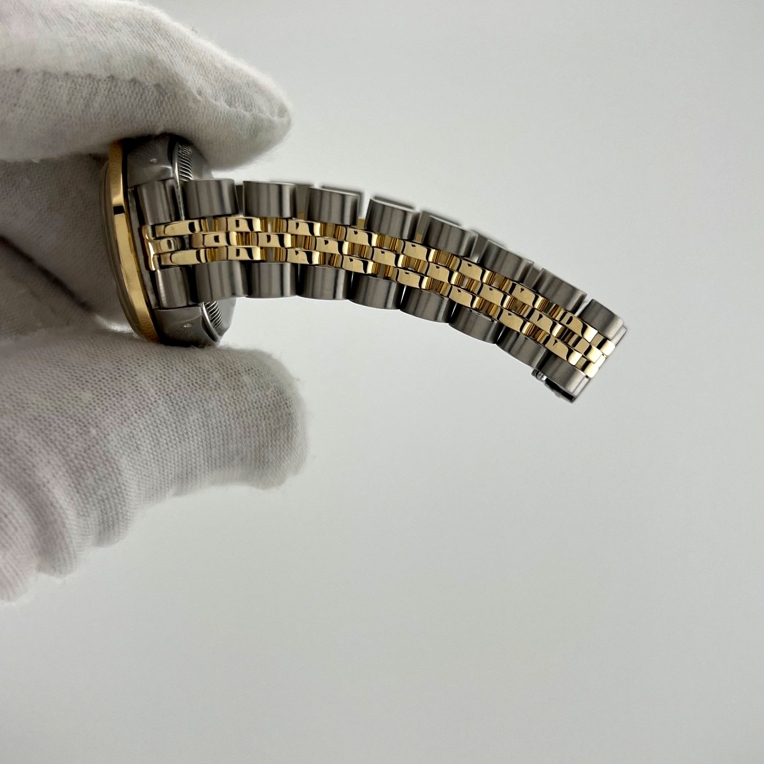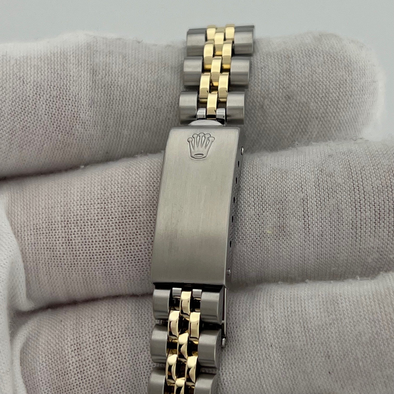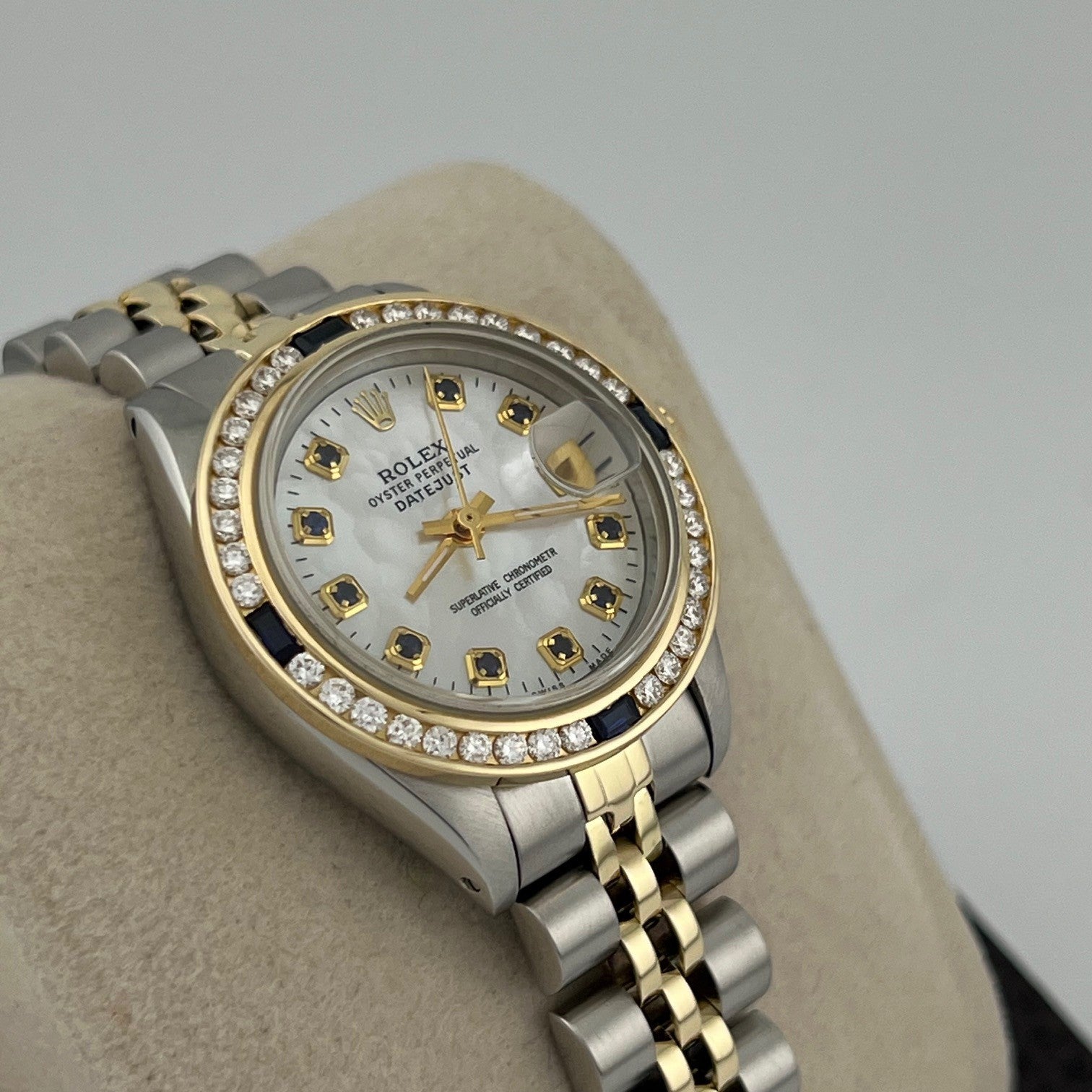 Rolex Datejust 6917 Mother of Pearl Sapphire Dial Diamond Bezel Gold Steel Rolex Sale! from 499500 /per This item is a recurring or deferred purchase. By continuing, I agree to the cancellation policy and authorize you to charge my payment method at the prices, frequency and dates listed on this page until my order is fulfilled or I cancel, if permitted. +1 (619) 232-1273 This item is currently on backorder but you can still purchase it now and we'll ship as soon as more become available. Style Number: 6917Serial: 374****Year: 1974 Model: Rolex Ladies Datejust Case Material: Stainless Steel Band: 14k Yellow Gold & Stainless Steel Jubilee Bezel: Custom Diamond & Sapphire Bezel Dial: Custom Mother Of Pearl with Sapphire Markers Crystal: Sapphire Case Size: 26mm Includes: - Elegant Watch Box- Certified Appraisal - 1 Year WarrantySKU 23058 / 17770TOC091525