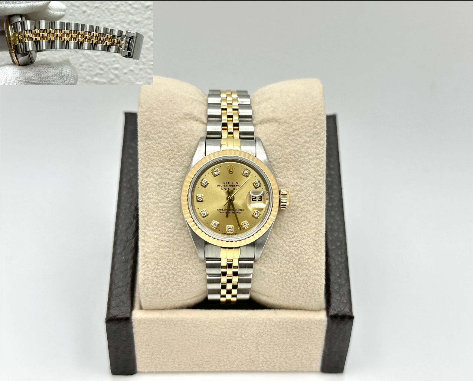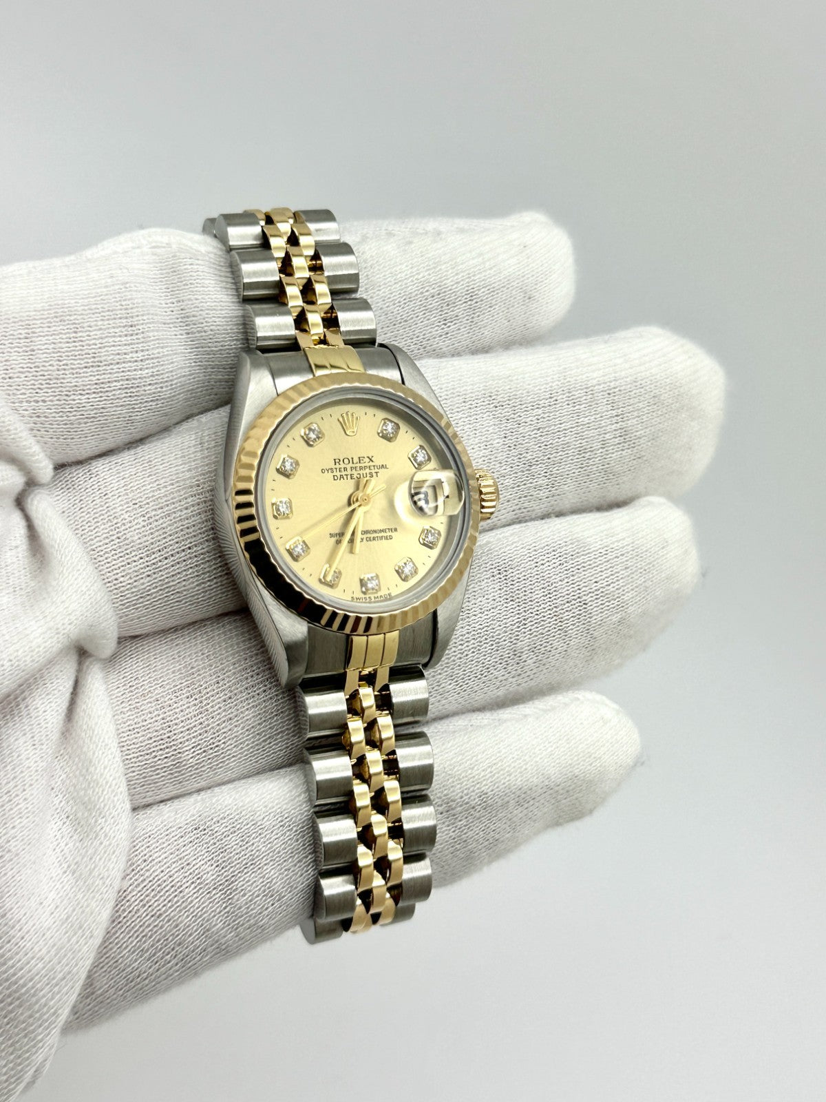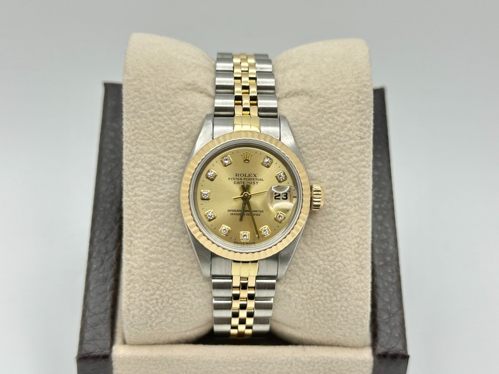 Rolex Datejust Ladies 69173 Factory Champagne Diamond Dial 18k Yellow Gold Steel Rolex Sale! from 649500 /per This item is a recurring or deferred purchase. By continuing, I agree to the cancellation policy and authorize you to charge my payment method at the prices, frequency and dates listed on this page until my order is fulfilled or I cancel, if permitted. +1 (619) 232-1273 This item is currently on backorder but you can still purchase it now and we'll ship as soon as more become available. Style Number: 69173Serial: T844***Year: 1996 Model: Rolex Ladies Datejust Case Material: Stainless Steel Band: 18K Yellow Gold & Stainless Steel Bezel: 18K Yellow Gold Dial: Factory Champagne Diamond Dial Crystal: Sapphire Crystal Case Size: 26mm Includes: - Elegant Watch Box- Certified Appraisal - One Year WarrantySKU 23552 / 17848TGC122225