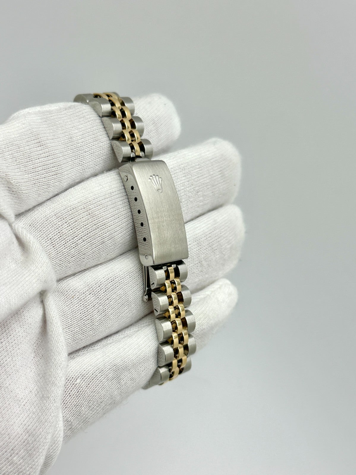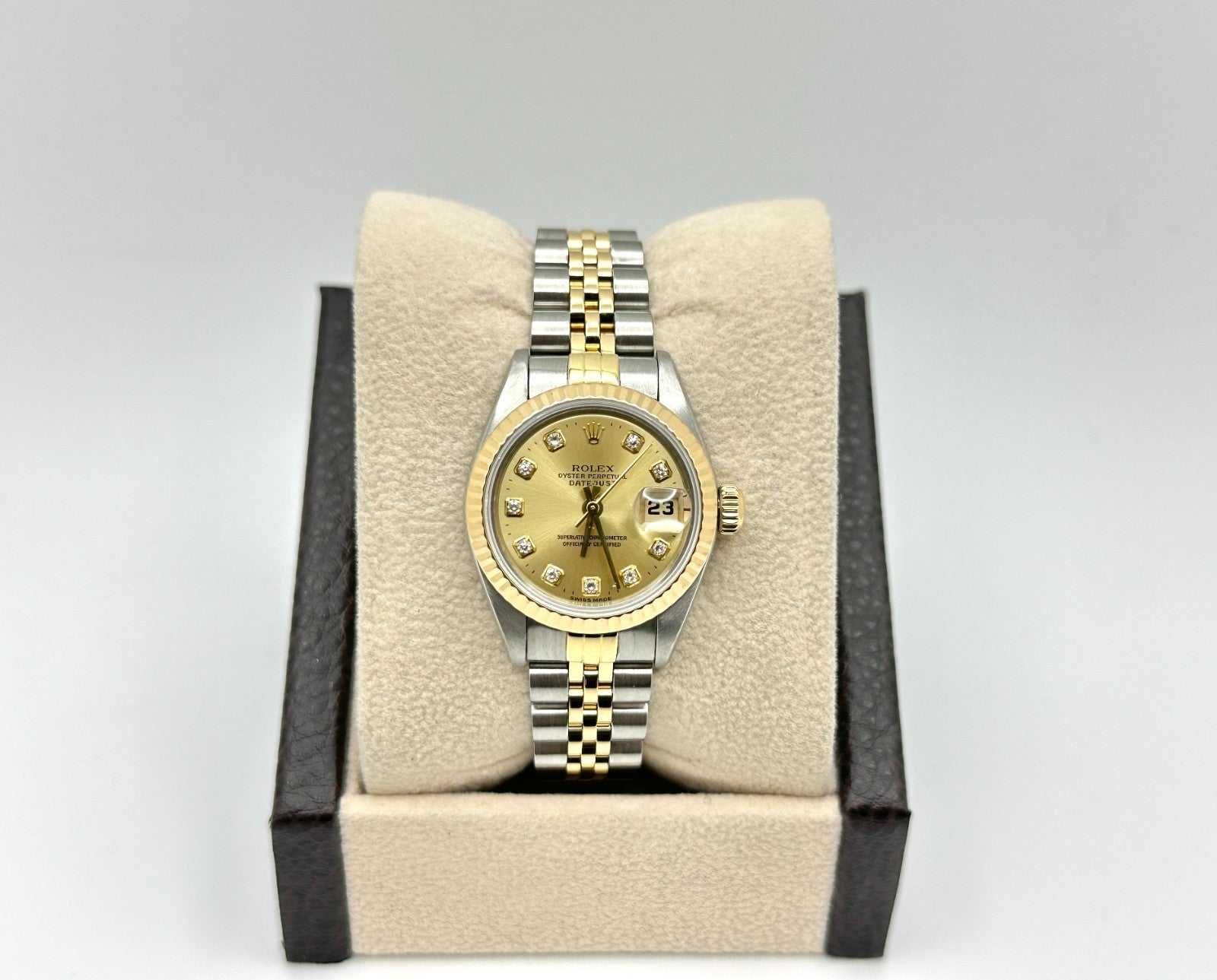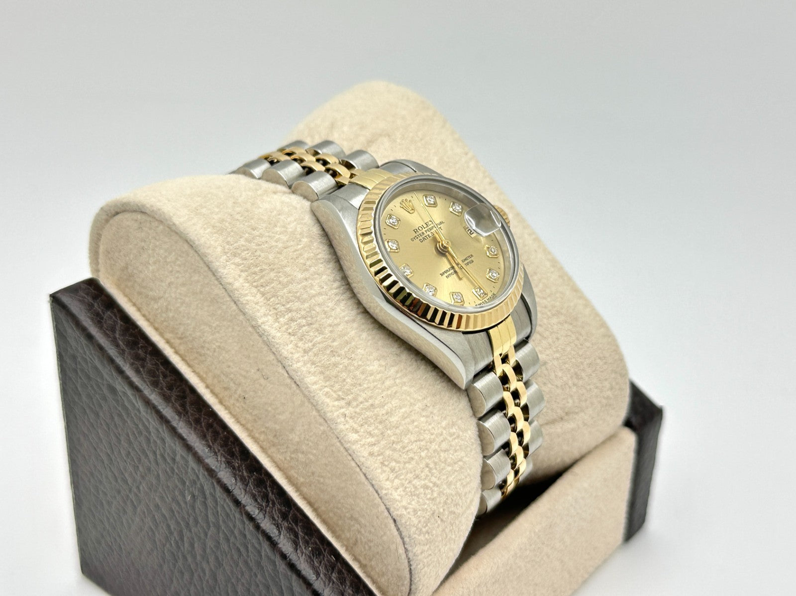 Rolex Datejust Ladies 69173 Factory Champagne Diamond Dial 18k Yellow Gold Steel Rolex Sale! from 649500 /per This item is a recurring or deferred purchase. By continuing, I agree to the cancellation policy and authorize you to charge my payment method at the prices, frequency and dates listed on this page until my order is fulfilled or I cancel, if permitted. +1 (619) 232-1273 This item is currently on backorder but you can still purchase it now and we'll ship as soon as more become available. Style Number: 69173Serial: T844***Year: 1996 Model: Rolex Ladies Datejust Case Material: Stainless Steel Band: 18K Yellow Gold & Stainless Steel Bezel: 18K Yellow Gold Dial: Factory Champagne Diamond Dial Crystal: Sapphire Crystal Case Size: 26mm Includes: - Elegant Watch Box- Certified Appraisal - One Year WarrantySKU 23552 / 17848TGC122225