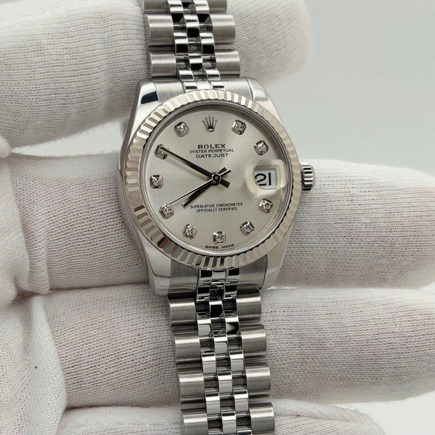 Rolex Datejust Midsize 178274 31mm Silver Diamond Dial Steel Jubilee Box Paper Rolex Sale! from 1159500 /per This item is a recurring or deferred purchase. By continuing, I agree to the cancellation policy and authorize you to charge my payment method at the prices, frequency and dates listed on this page until my order is fulfilled or I cancel, if permitted. +1 (619) 232-1273 This item is currently on backorder but you can still purchase it now and we'll ship as soon as more become available. Style Number: 178274Serial: 00C0****Year: 2017 Model: Rolex Datejust Midsize Case Material: Stainless Steel Band: Stainless Steel Jubilee Bezel: 18k White Gold Fluted Dial: Factory Silver Diamond Dial Crystal: Sapphire Case Size: 31mm Includes: - Rolex Box & Paper- Certified Appraisal - 1 Year WarrantySKU 23468 / 123865TJD121825