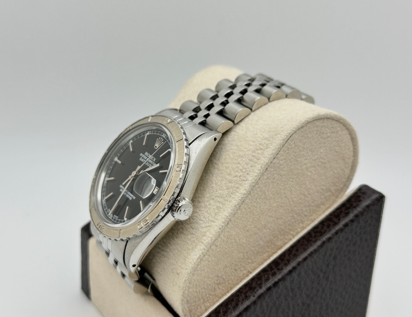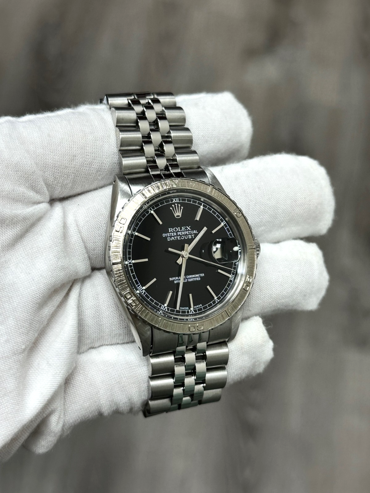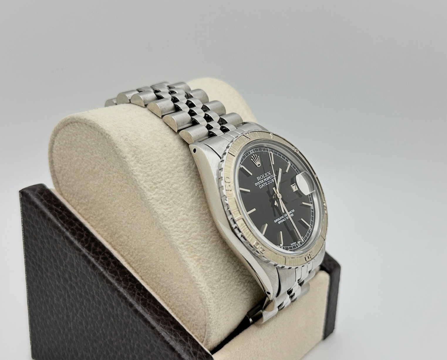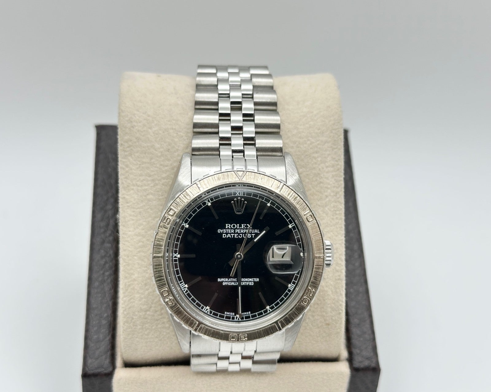 Rolex Datejust Thunderbird Turn O Graph 16250 36mm Black Dial Stainless Steel Rolex Sale! from 499500 /per This item is a recurring or deferred purchase. By continuing, I agree to the cancellation policy and authorize you to charge my payment method at the prices, frequency and dates listed on this page until my order is fulfilled or I cancel, if permitted. +1 (619) 232-1273 This item is currently on backorder but you can still purchase it now and we'll ship as soon as more become available. Style Number: 16250Serial: 6046***Year: 1979 Model: Rolex Datejust Turn-O-Graph Case Material: Stainless Steel Band: Custom Stainless Steel Band Dial: Black Crystal: Acrylic Case Size: 36mm Includes: - Elegant Watch Box- Certified Appraisal - One Year WarrantySKU 22987 / 19600JD082725