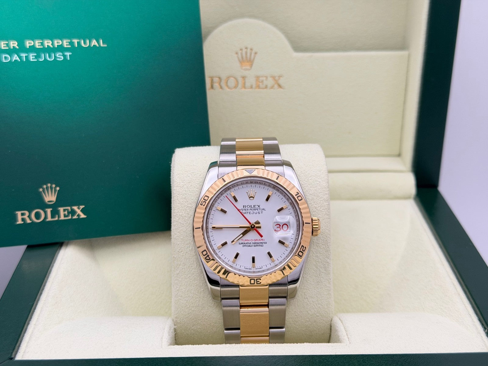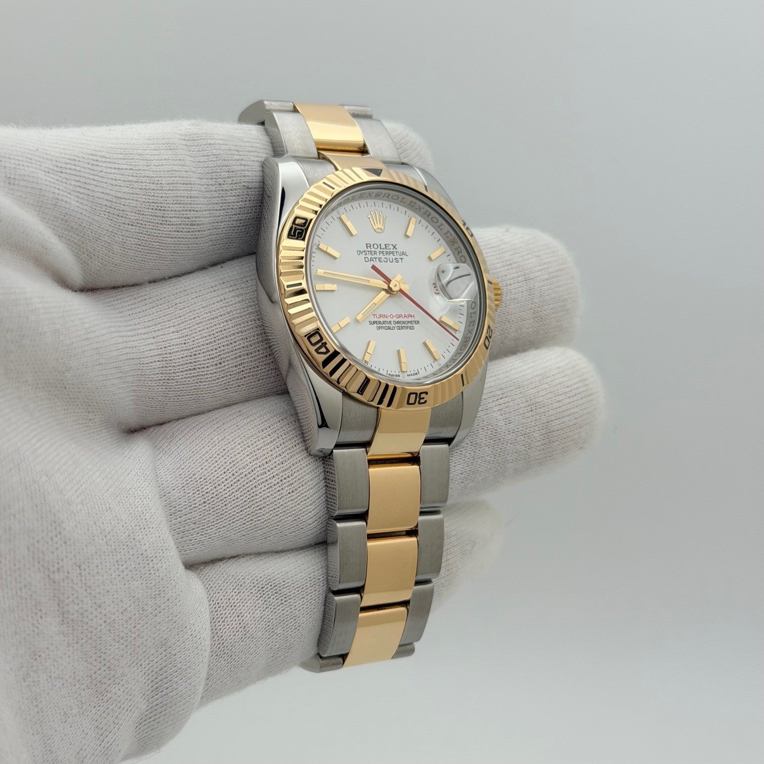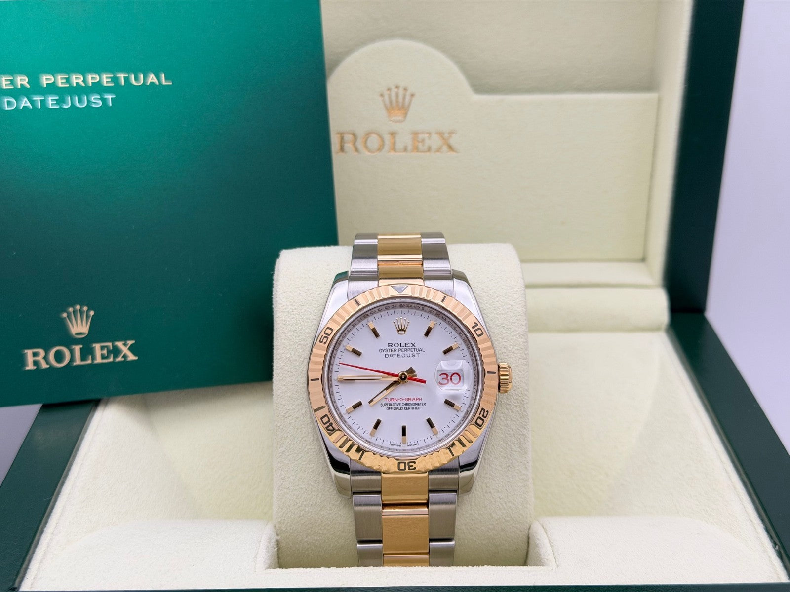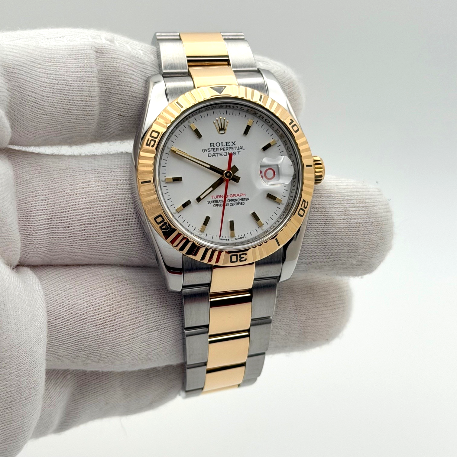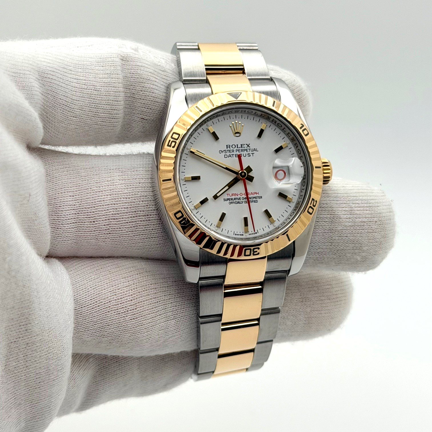 Rolex Datejust Turn O Graph 116263 White Dial 18k Yellow Gold Steel Box Rolex Sale! from 939500 /per This item is a recurring or deferred purchase. By continuing, I agree to the cancellation policy and authorize you to charge my payment method at the prices, frequency and dates listed on this page until my order is fulfilled or I cancel, if permitted. +1 (619) 232-1273 This item is currently on backorder but you can still purchase it now and we'll ship as soon as more become available. Style Number: 116263Serial: F38****Year: 2004 Model: Rolex Datejust Turn-O-Graph Case Material: Stainless Steel Band: 18k Yellow Gold & Stainless Steel Bezel: 18k Yellow Gold Fluted Dial: White Crystal: Sapphire Case Size: 36mm Includes: - Rolex Box & Booklet- Certified Appraisal - 1 Year WarrantySKU 23301 / 121525TOC103025