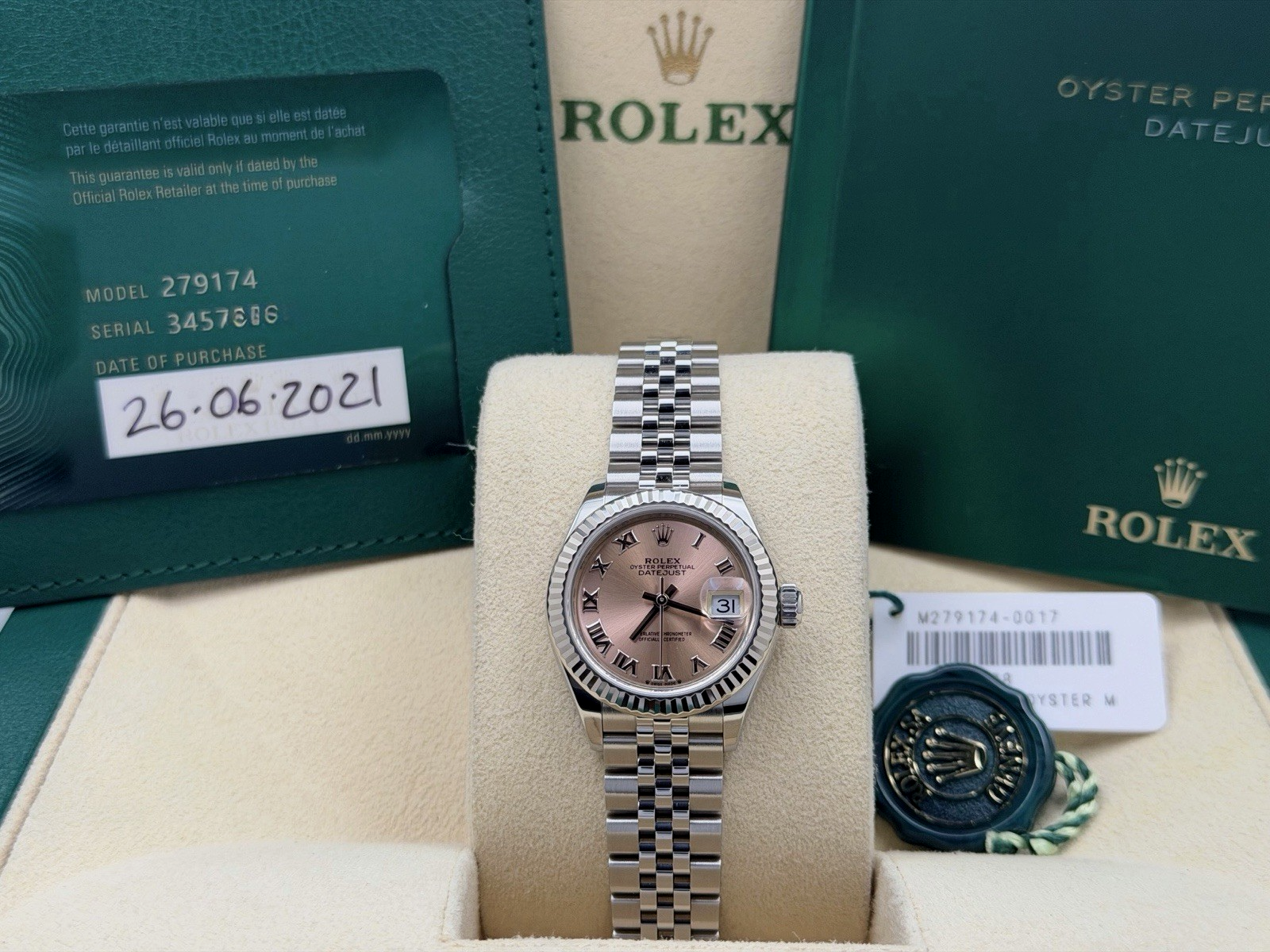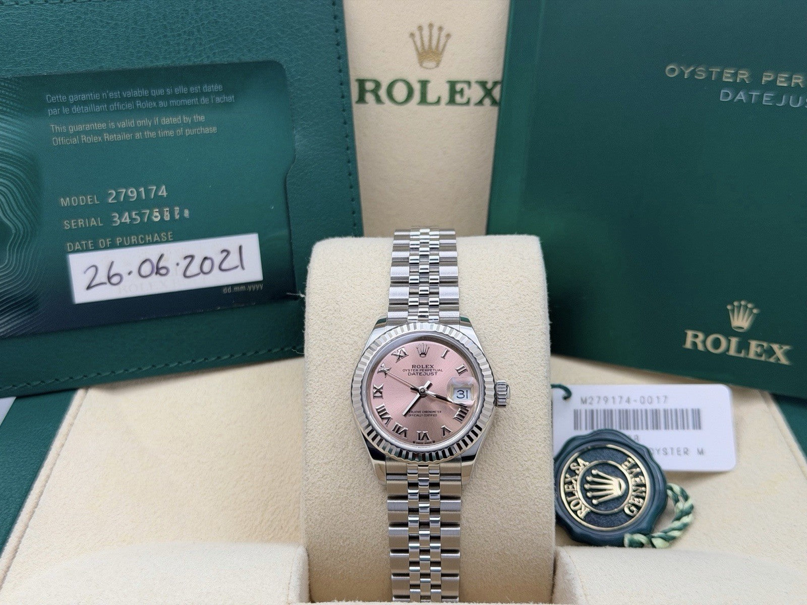 Rolex Ladies Datejust 279174 28mm Pink Roman Dial 18k White Gold Steel Box Paper