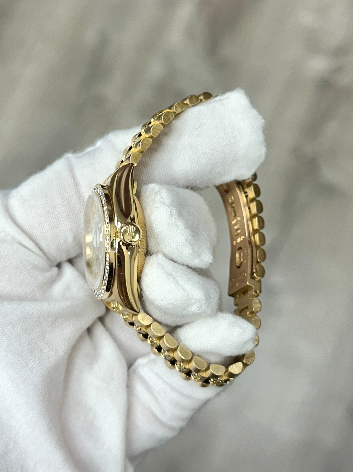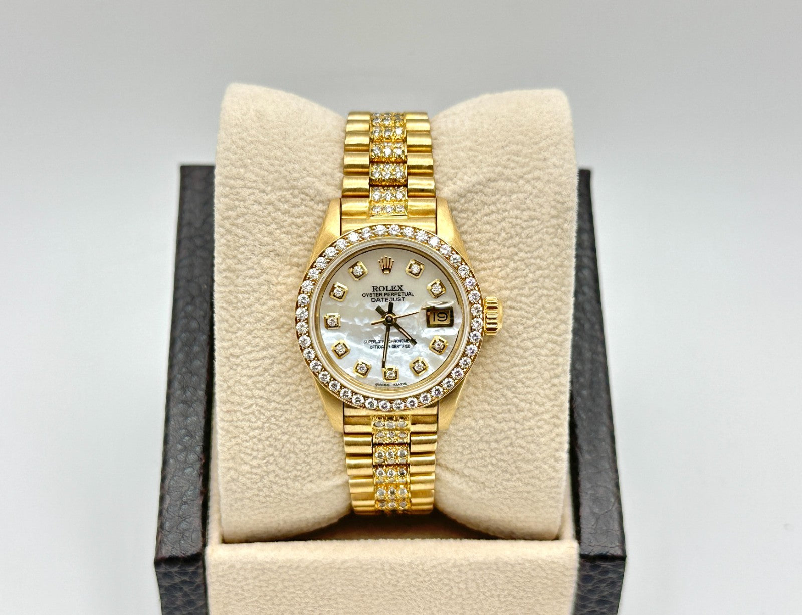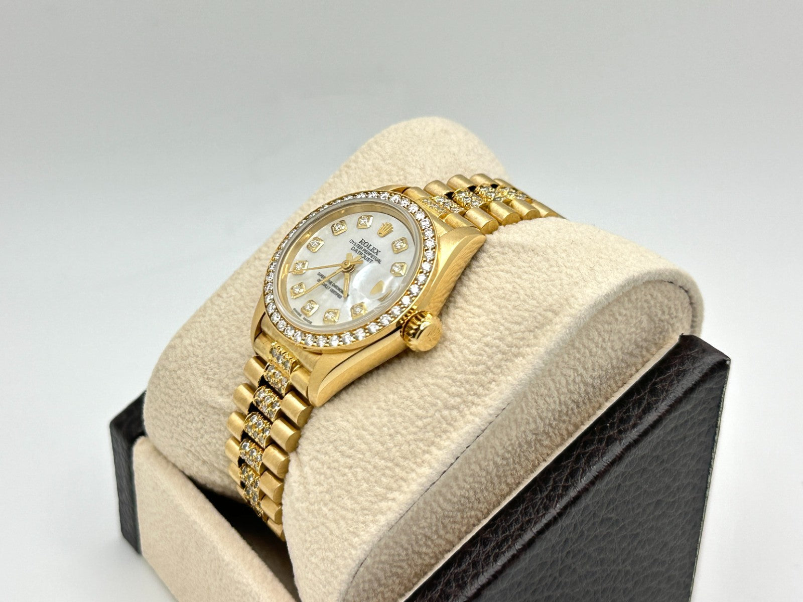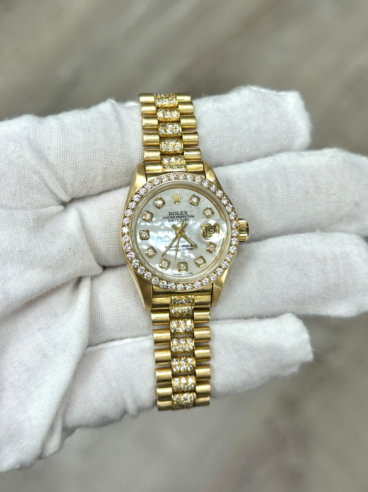 Rolex Ladies President Datejust 69178 Mother of Pearl Diamond Dial Band 18k Gold Rolex Sale! from 1199500 /per This item is a recurring or deferred purchase. By continuing, I agree to the cancellation policy and authorize you to charge my payment method at the prices, frequency and dates listed on this page until my order is fulfilled or I cancel, if permitted. +1 (619) 232-1273 This item is currently on backorder but you can still purchase it now and we'll ship as soon as more become available. Style Number: 69178Serial: N138***Year: 1991 Model: Rolex Ladies President Datejust Case Material: 18K Yellow Gold Band: Custom 18K Yellow Gold Diamond Band Bezel: Custom Diamond Bezel Dial: Custom Mother of Pearl Diamond Dial Crystal: Sapphire Crystal Case Size: 26mm Includes: - Elegant Watch Box- Certified Appraisal - One Year WarrantySKU 23083 / 123400TSTADEN092725