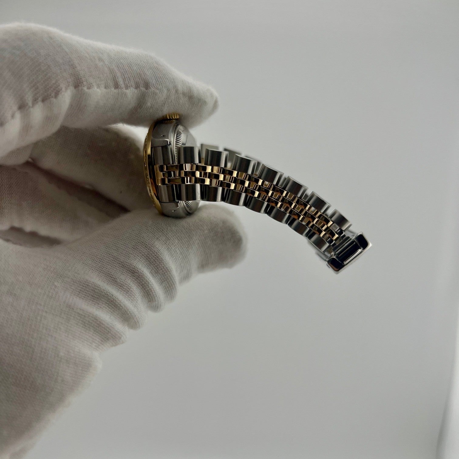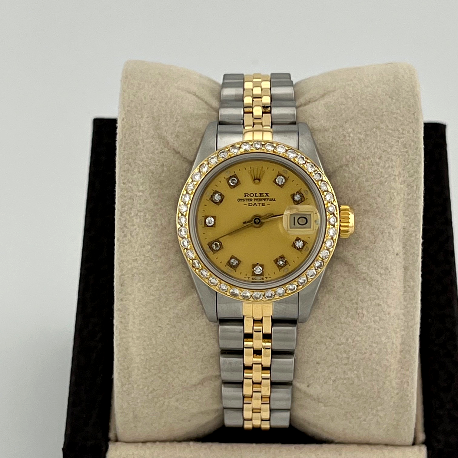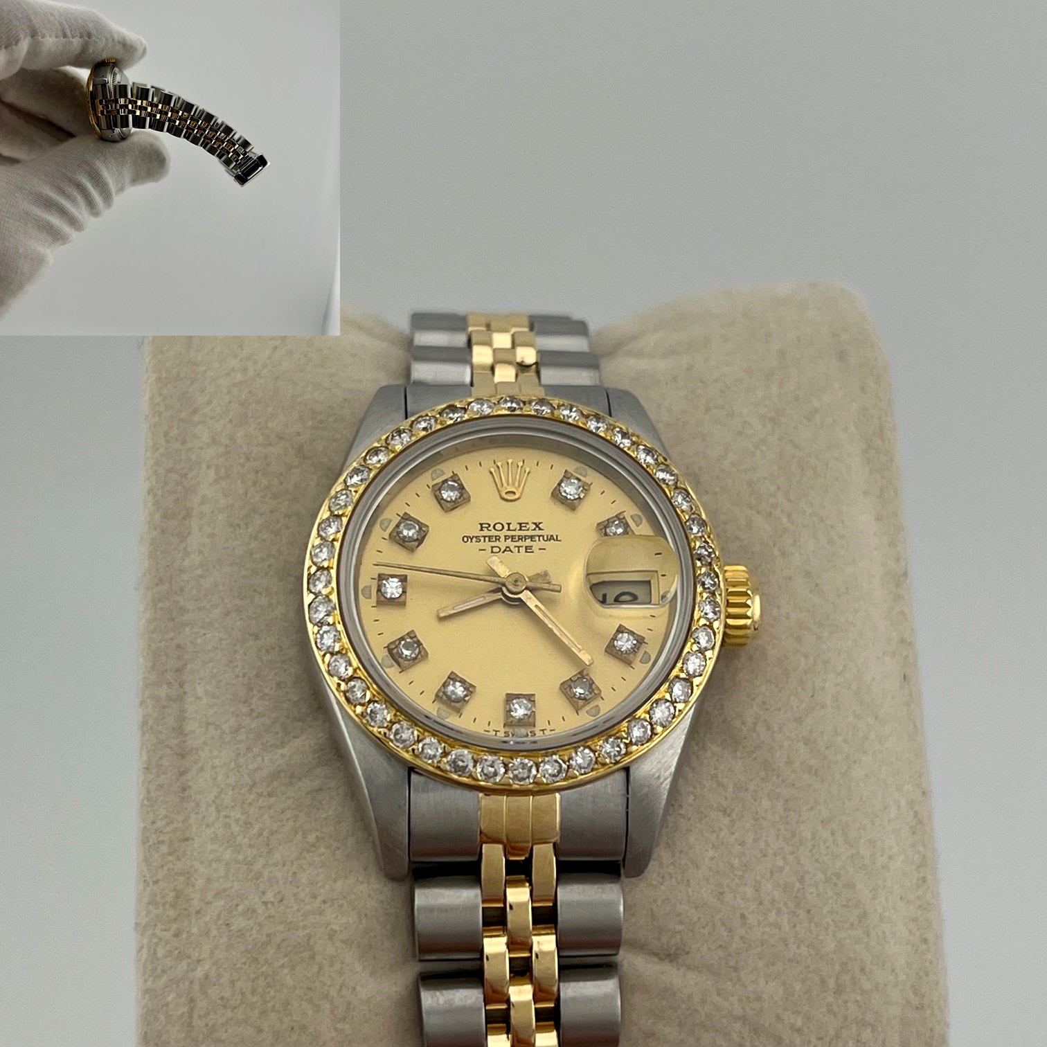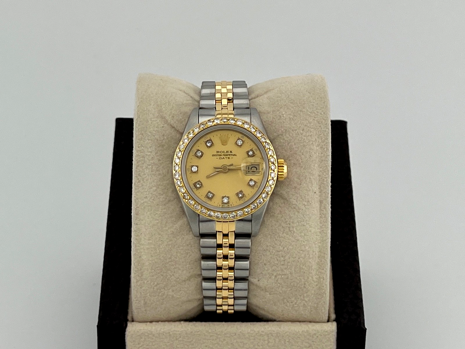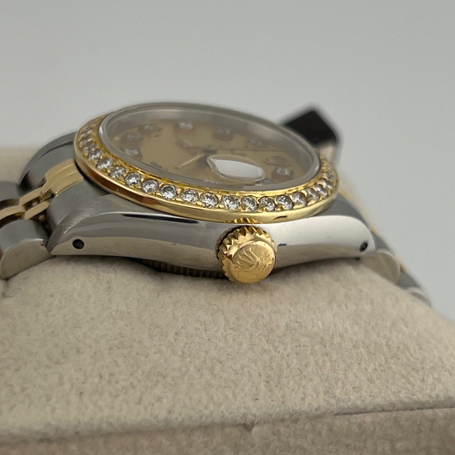 Rolex Lady Datejust 69173 26mm Champagne Diamond Dial and Bezel 18k Gold Steel Rolex Sale! from 499500 /per This item is a recurring or deferred purchase. By continuing, I agree to the cancellation policy and authorize you to charge my payment method at the prices, frequency and dates listed on this page until my order is fulfilled or I cancel, if permitted. +1 (619) 232-1273 This item is currently on backorder but you can still purchase it now and we'll ship as soon as more become available. Style Number: 69173Serial: 981****Year: 1987 Model: Rolex Ladies Datejust Case Material: Stainless Steel Band: 18k Yellow Gold & Stainless Steel Jubilee Bezel: Custom Diamond Bezel Dial: Custom Champagne Diamond Dial Crystal: Sapphire Case Size: 26mm Includes: - Elegant Watch Box- Certified Appraisal - 1 Year WarrantySKU 22884 / 16240T072925