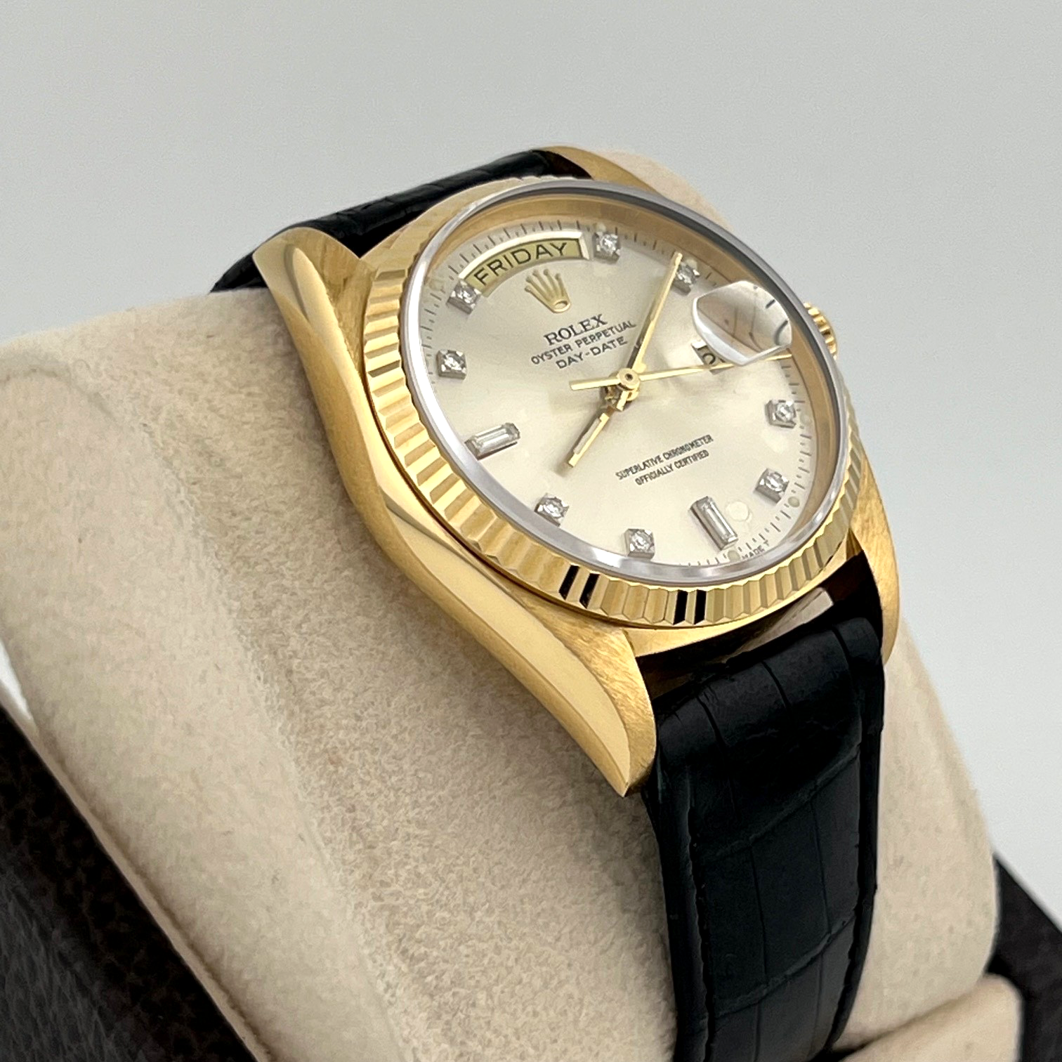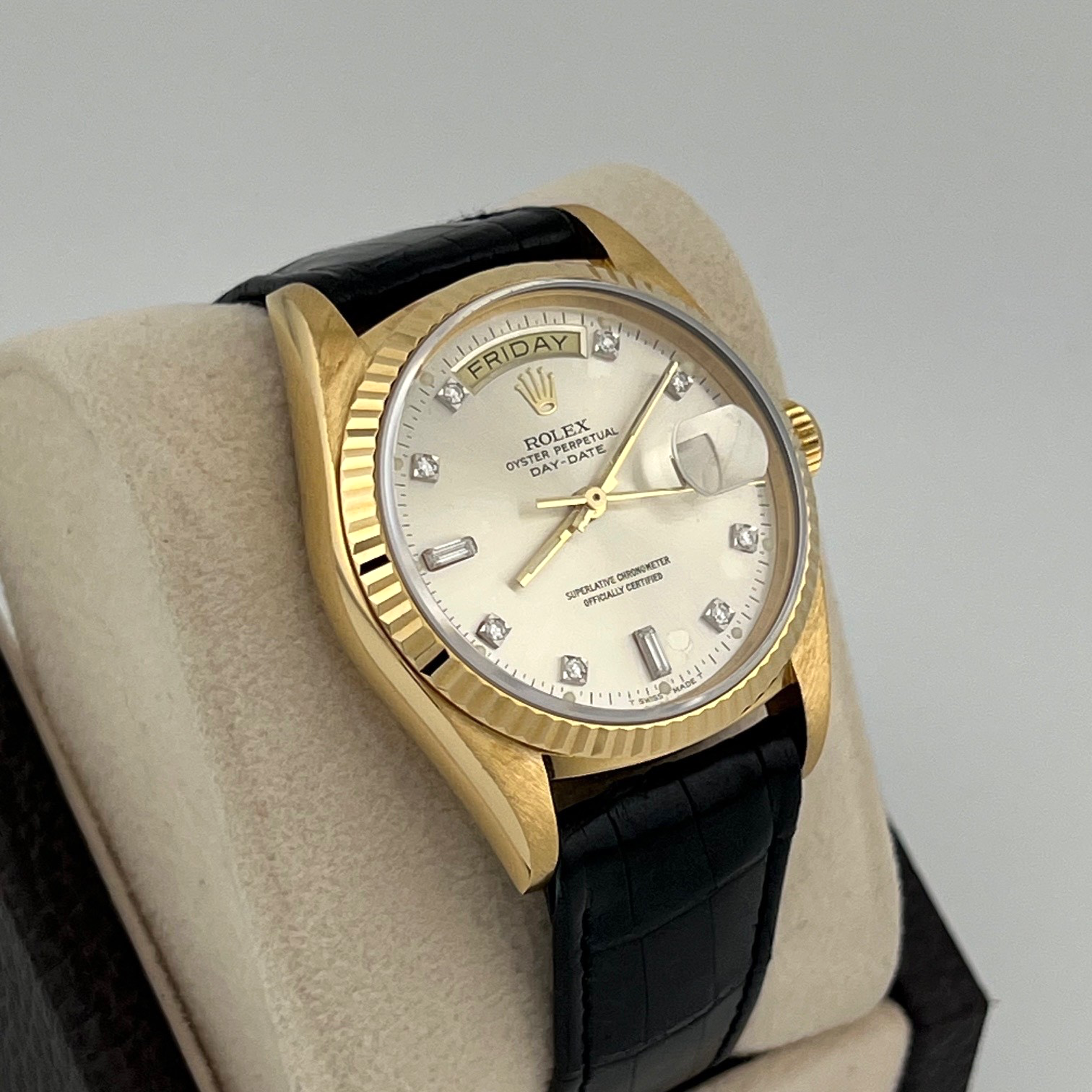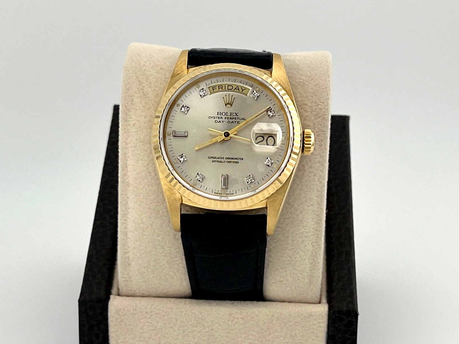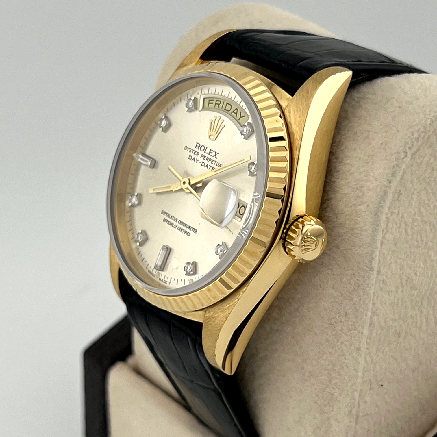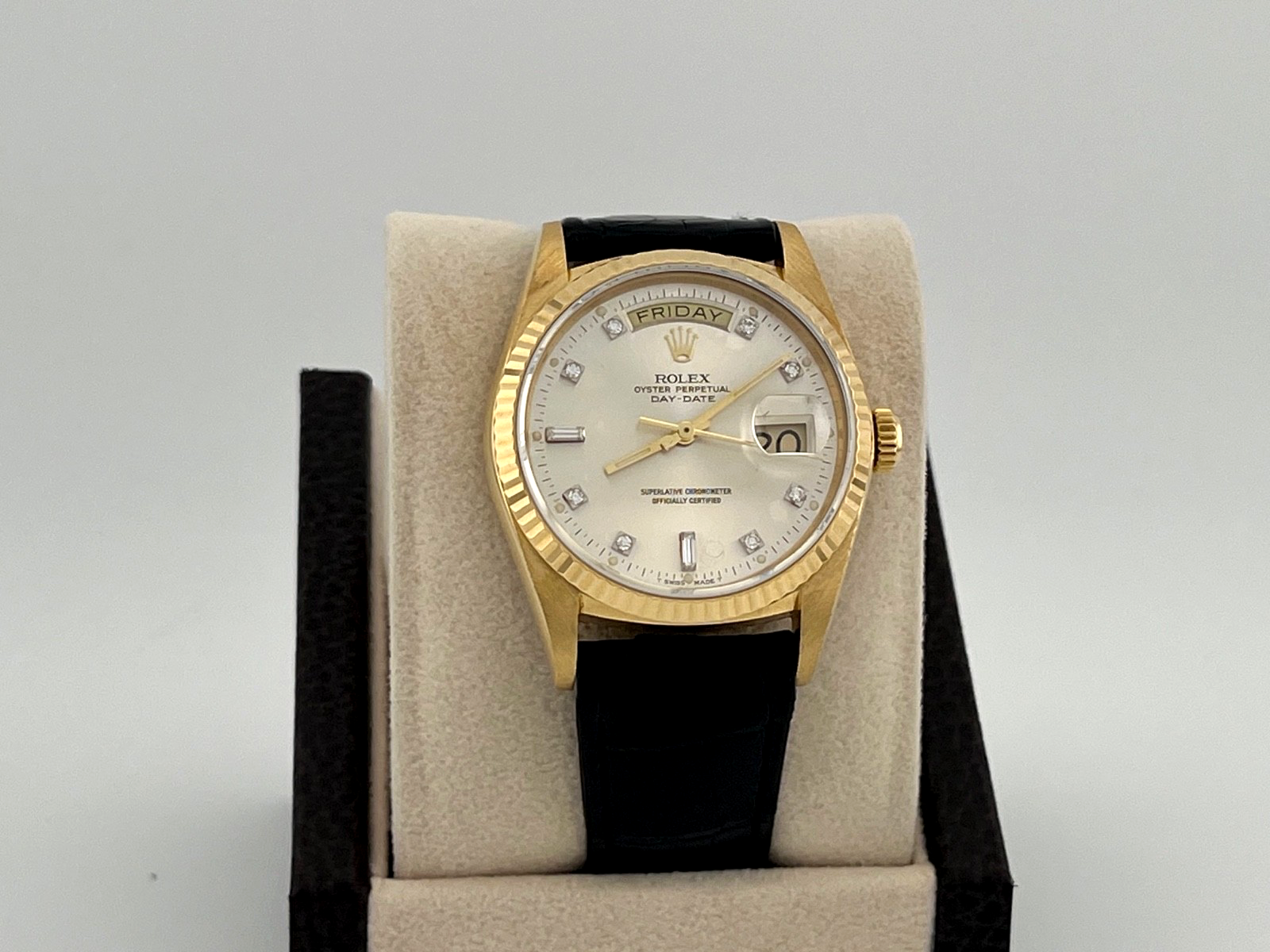 Rolex Day Date 18038 36mm Factory Diamond Dial and Leather Strap 18k Yellow Gold Rolex Sale! from 1179500 /per This item is a recurring or deferred purchase. By continuing, I agree to the cancellation policy and authorize you to charge my payment method at the prices, frequency and dates listed on this page until my order is fulfilled or I cancel, if permitted. +1 (619) 232-1273 This item is currently on backorder but you can still purchase it now and we'll ship as soon as more become available. Style Number: 18038Serial: 962****Year: 1987 Model: Rolex Day Date Case Material: 18k Yellow Gold Band: Factory Rolex Leather Strap & Clasp Bezel: 18k Yellow Gold Fluted Dial: Factory Diamond Dial Crystal: Sapphire Case Size: 36mm Includes: - Elegant Watch Box- Certified Appraisal - 1 Year WarrantySKU 19619 / 121900TOFC