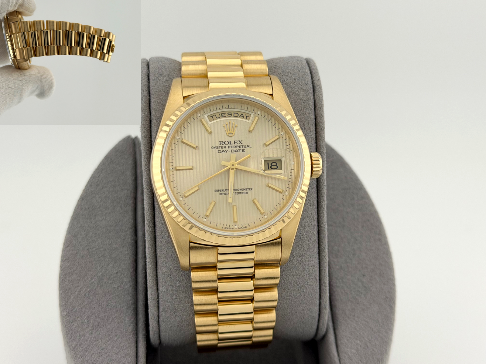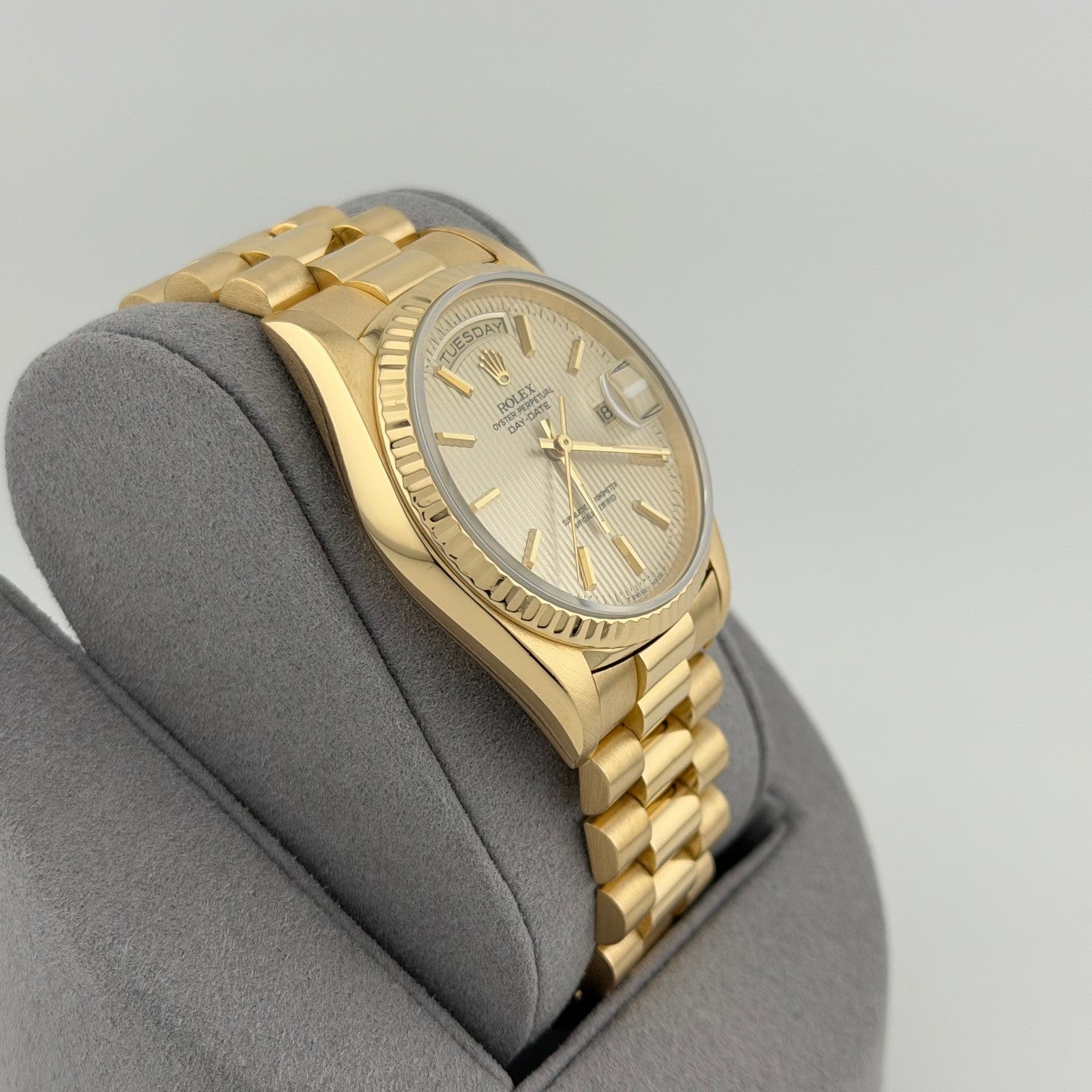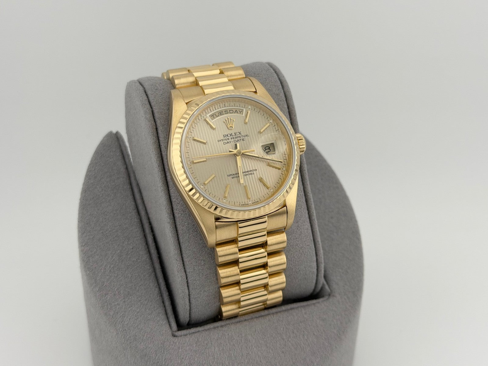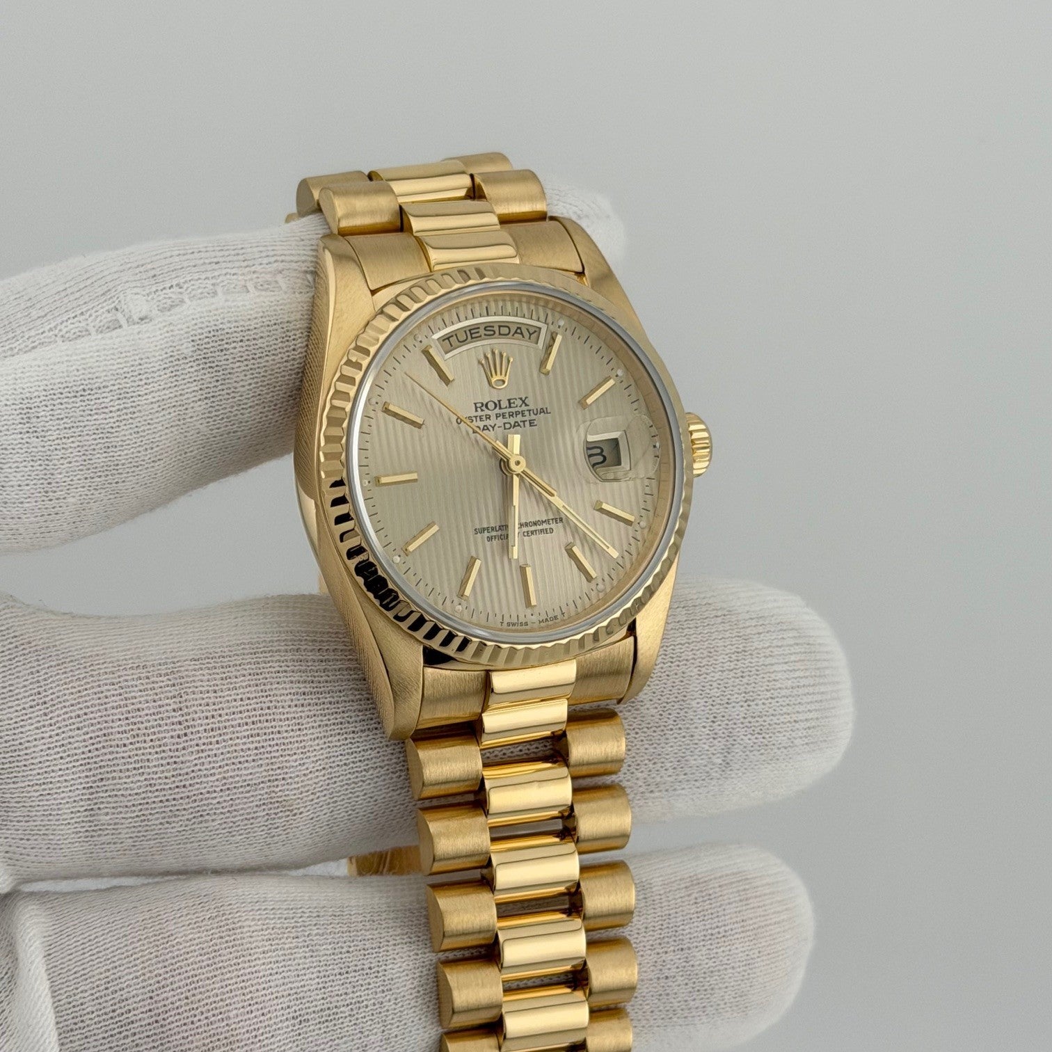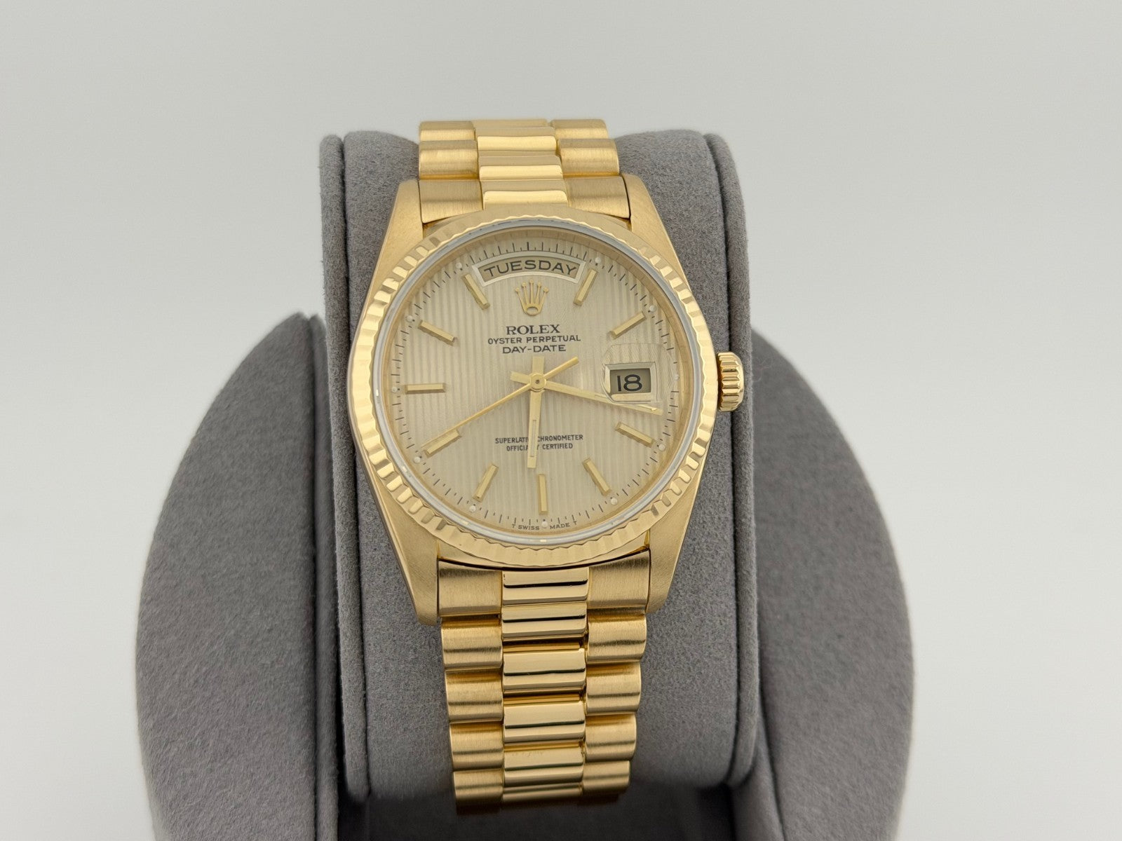 Rolex Day Date President 18238 36mm Champagne Tapestry Dial 18k Yellow Gold Rolex Sale! from 1999500 /per This item is a recurring or deferred purchase. By continuing, I agree to the cancellation policy and authorize you to charge my payment method at the prices, frequency and dates listed on this page until my order is fulfilled or I cancel, if permitted. +1 (619) 232-1273 This item is currently on backorder but you can still purchase it now and we'll ship as soon as more become available. Style Number: 18238Serial: E19****Year: 1990 Model: Rolex Day Date President Case Material: 18k Yellow Gold Band: 18k Yellow Gold President Bezel: 18k Yellow Gold Fluted Dial: Champagne Tapestry Dial Crystal: Sapphire Case Size: 36mm Includes: - Elegant Watch Box- Certified Appraisal - 1 Year WarrantySKU 23283 / 146575TJD111025