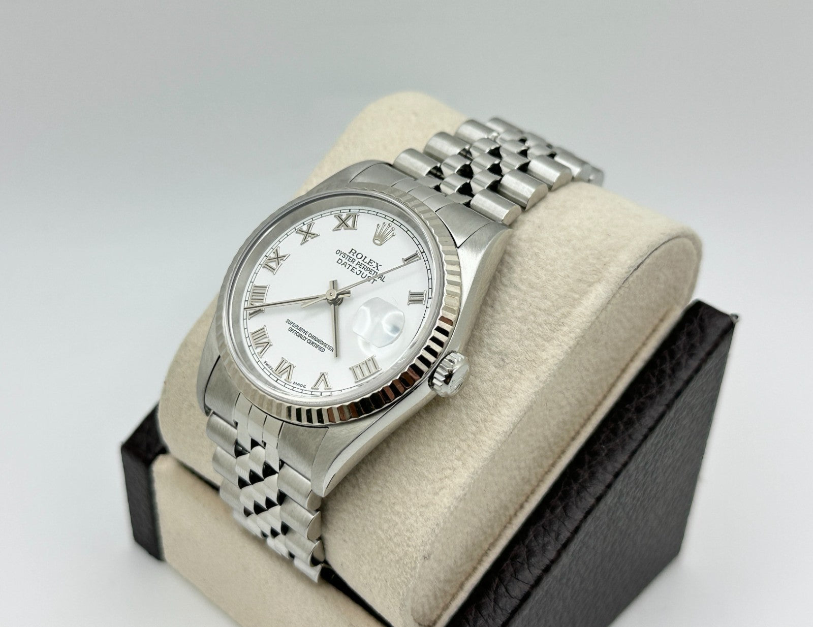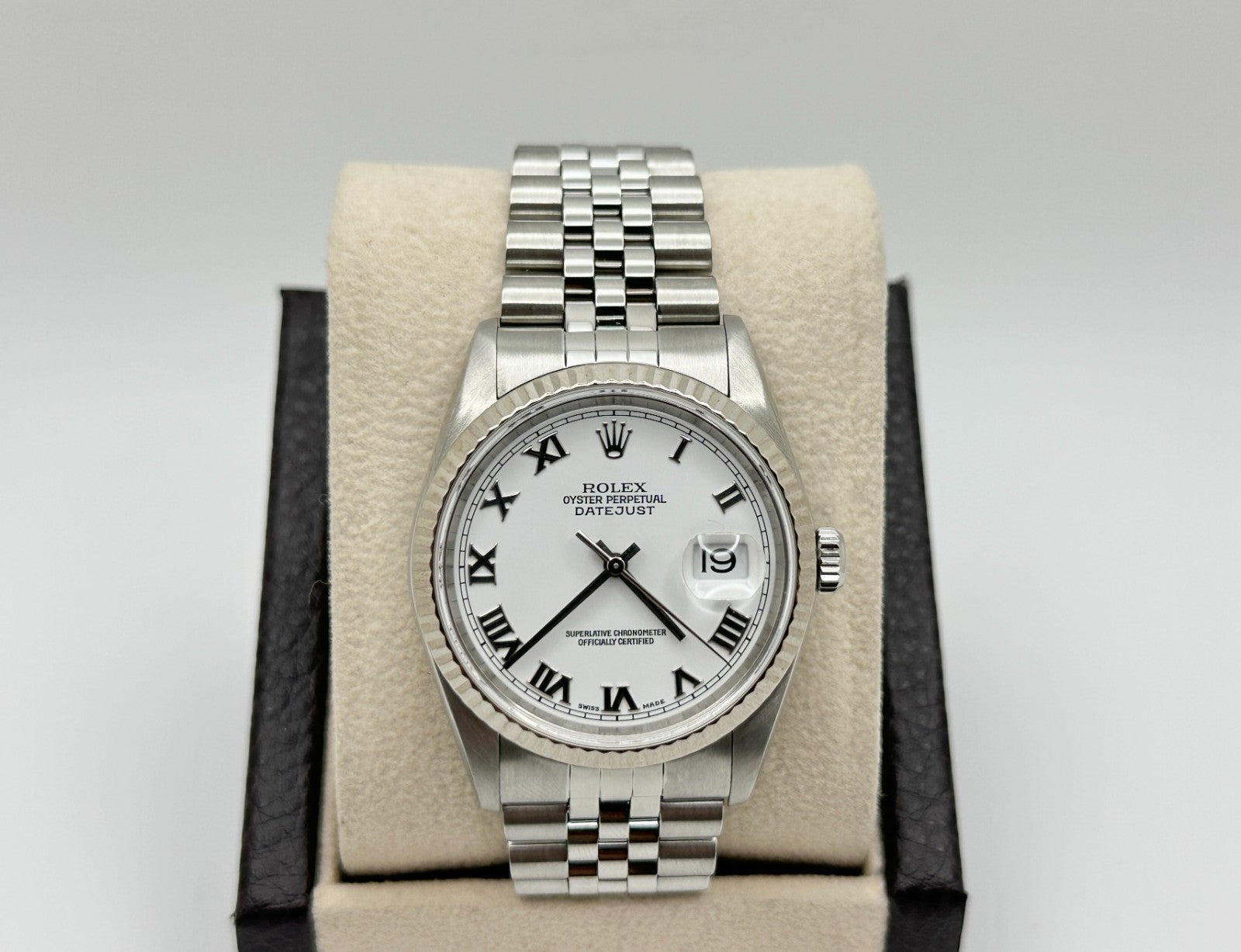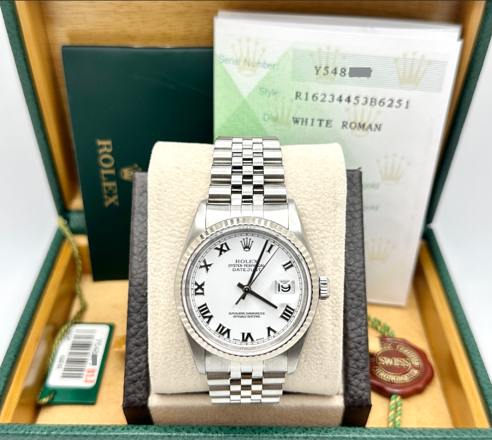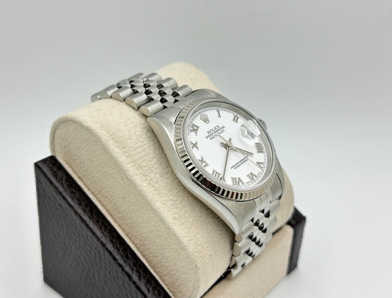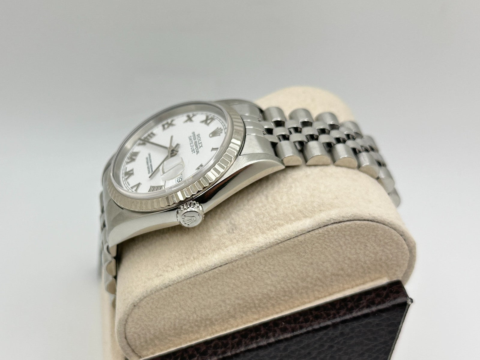 2003 Rolex Datejust 16234 36mm White Roman Dial 18k Gold Bezel Steel Box Paper