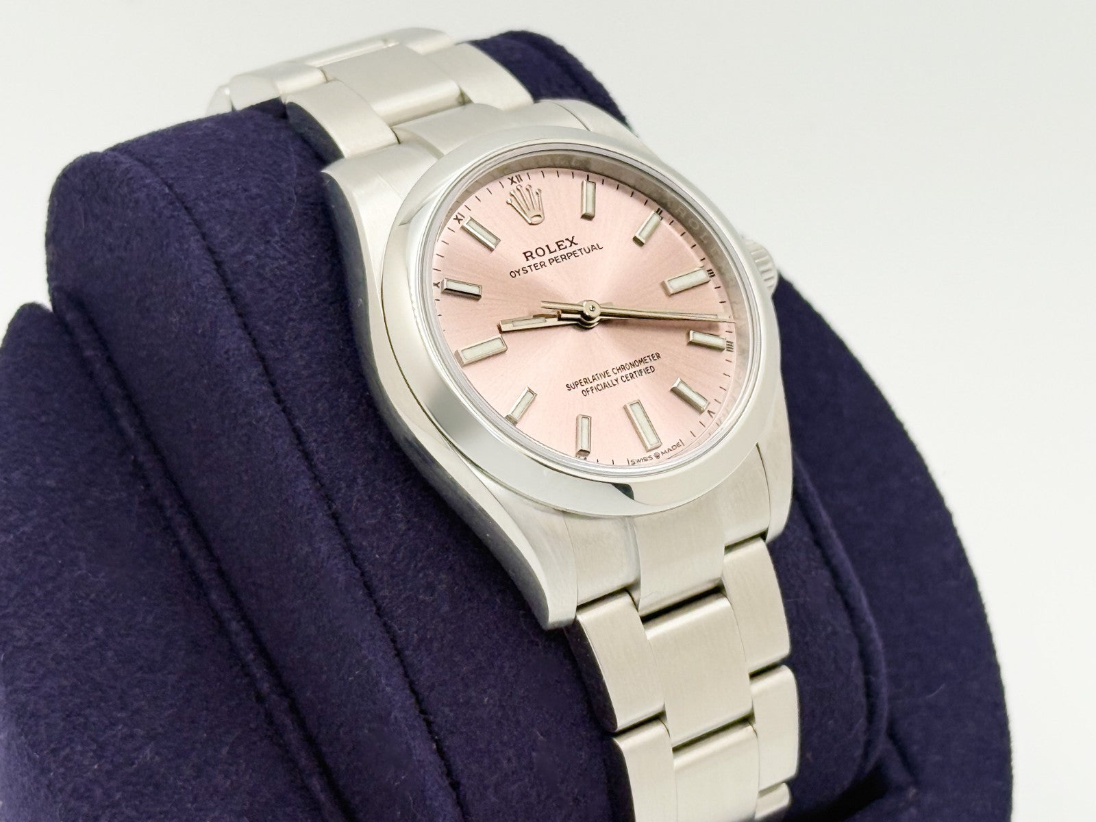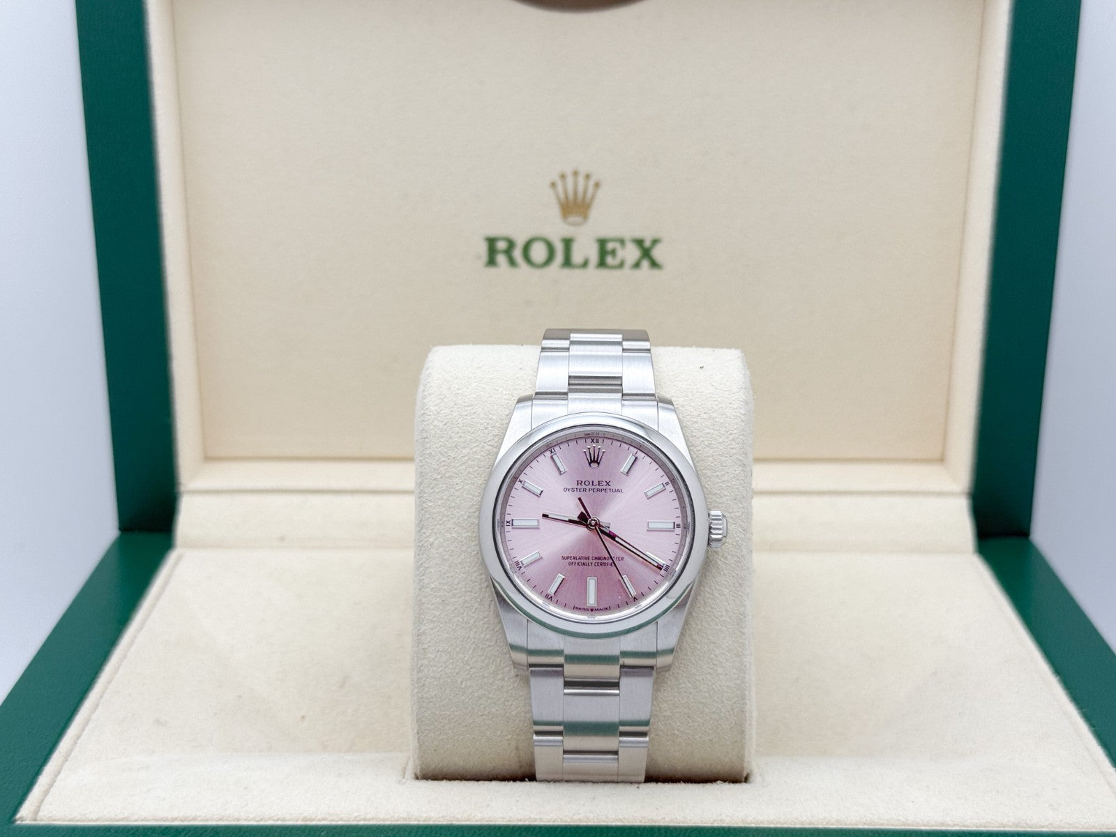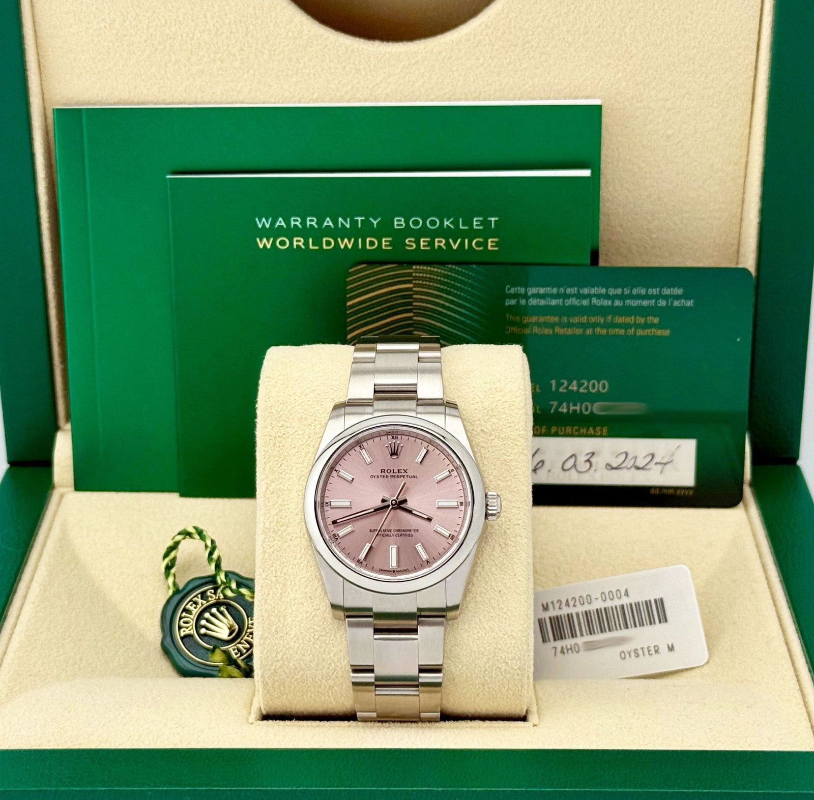 2024 Rolex Oyster Perpetual 124200 34mm Pink Dial Steel Box Paper Rolex Sale! from 879500 /per This item is a recurring or deferred purchase. By continuing, I agree to the cancellation policy and authorize you to charge my payment method at the prices, frequency and dates listed on this page until my order is fulfilled or I cancel, if permitted. +1 (619) 232-1273 This item is currently on backorder but you can still purchase it now and we'll ship as soon as more become available. Style Number: 124200Serial: 74H*****Year: 2024 Model: Rolex Oyster Perpetual Case Material: Stainless Steel Band: Stainless Steel Bezel: Stainless Steel Dial: Pink Crystal: Sapphire Crystal Case Size: 34mm Includes: - 2024 Rolex Box & Paper- Certified Appraisal - 5 Year Factory Warranty from Original Purchase DateSKU 23033 / 116062TSTADEN091225