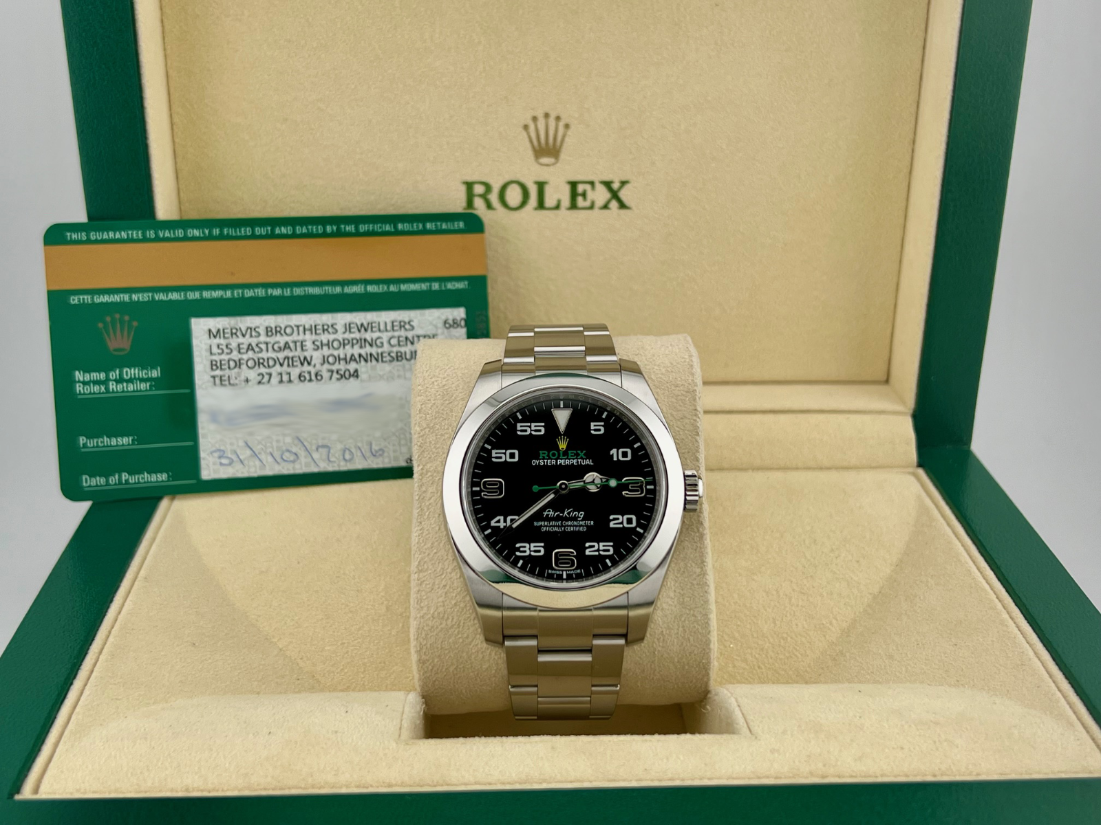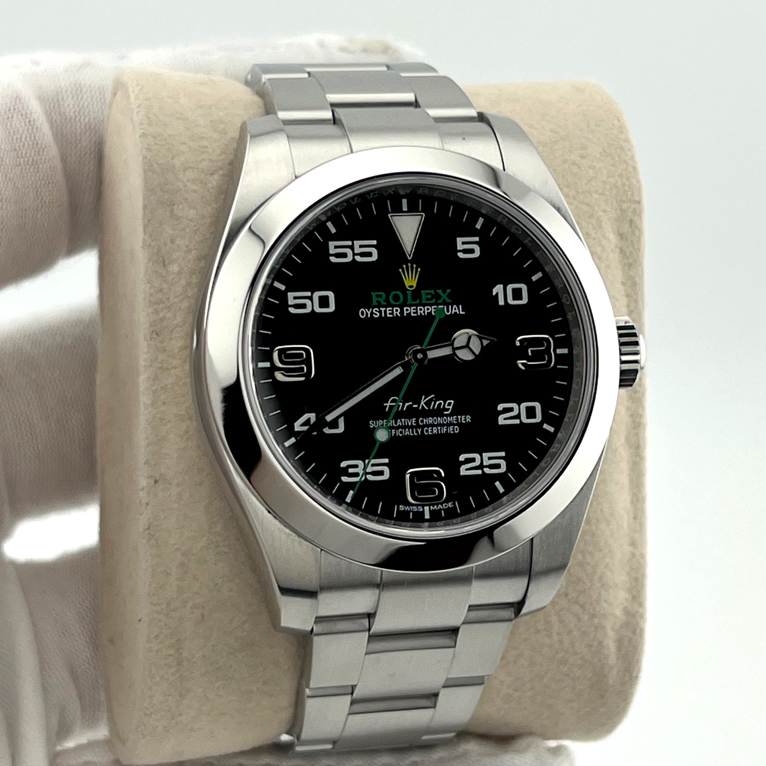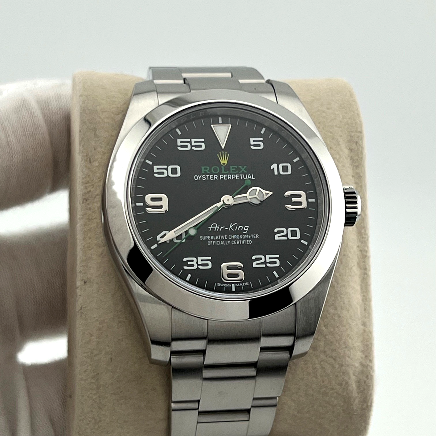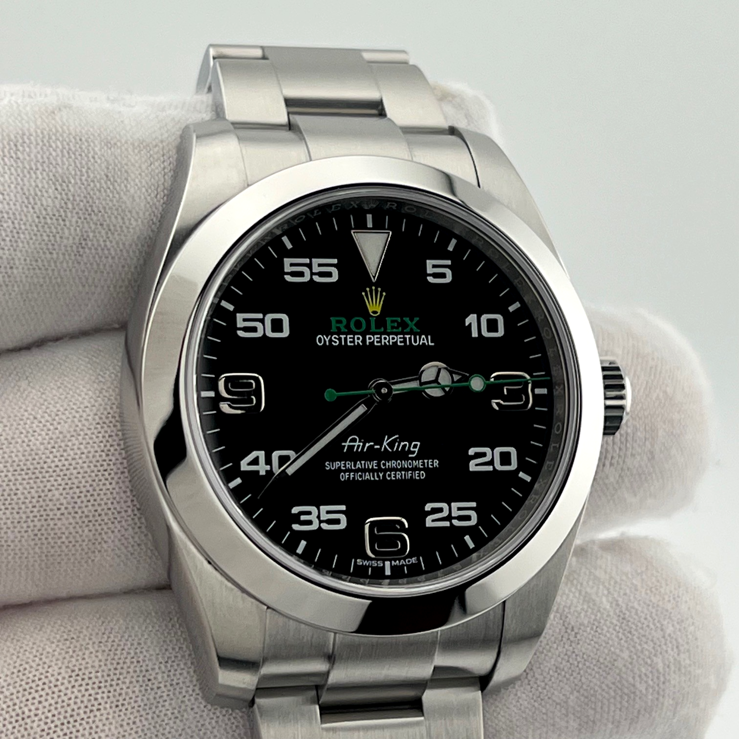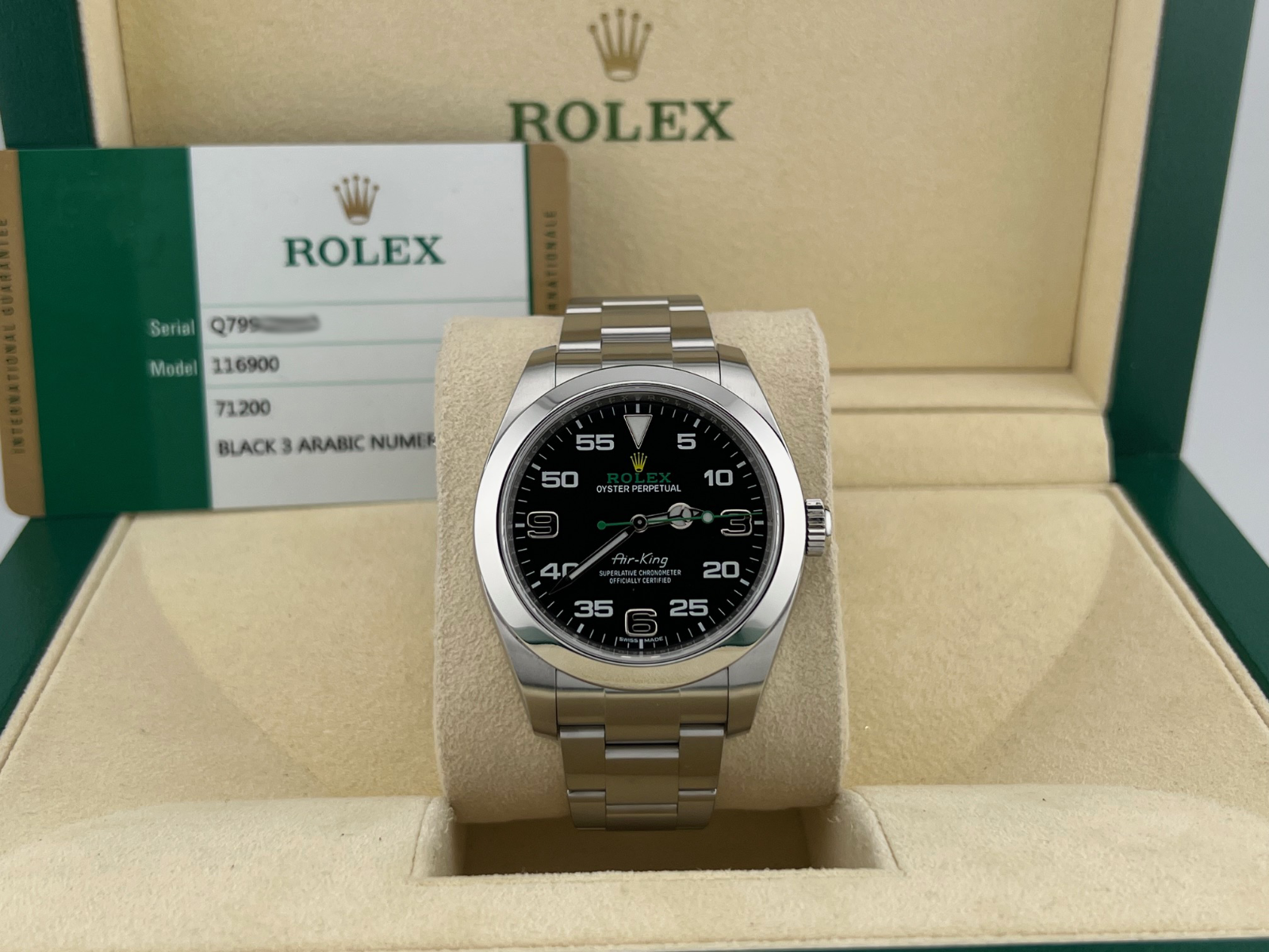 Rolex Air King 116900 40mm Black Arabic Dial Stainless Steel Box Papers Rolex Sale! from 769500 /per This item is a recurring or deferred purchase. By continuing, I agree to the cancellation policy and authorize you to charge my payment method at the prices, frequency and dates listed on this page until my order is fulfilled or I cancel, if permitted. +1 (619) 232-1273 This item is currently on backorder but you can still purchase it now and we'll ship as soon as more become available. Style Number: 116900Serial: Q799****Year: 2016 Model: Rolex Air King Case Material: Stainless Steel Band: Stainless Steel Bezel: Stainless Steel Dial: Black Crystal: Sapphire Case Size: 40mm Includes: - Rolex Box & Paper- Certified Appraisal - 1 Year WarrantySKU 23076 / 116770TBJ091925