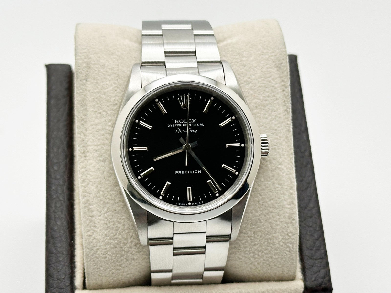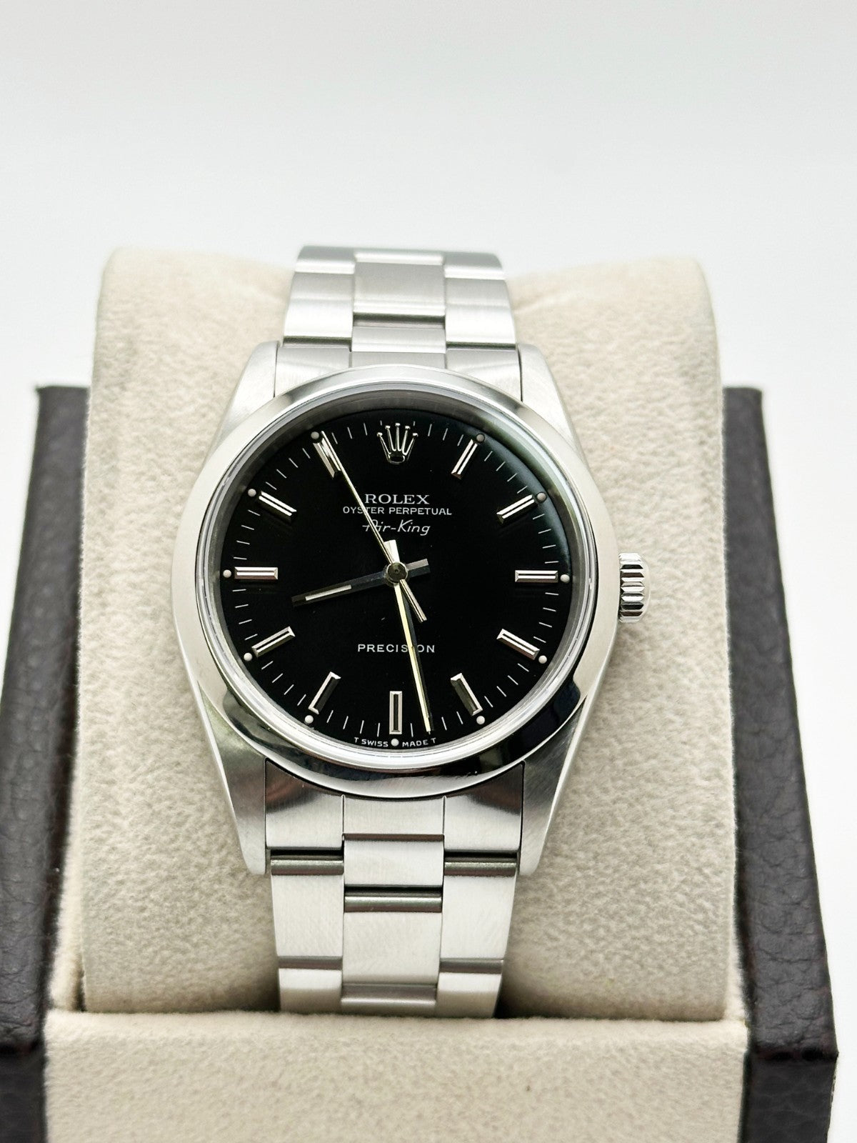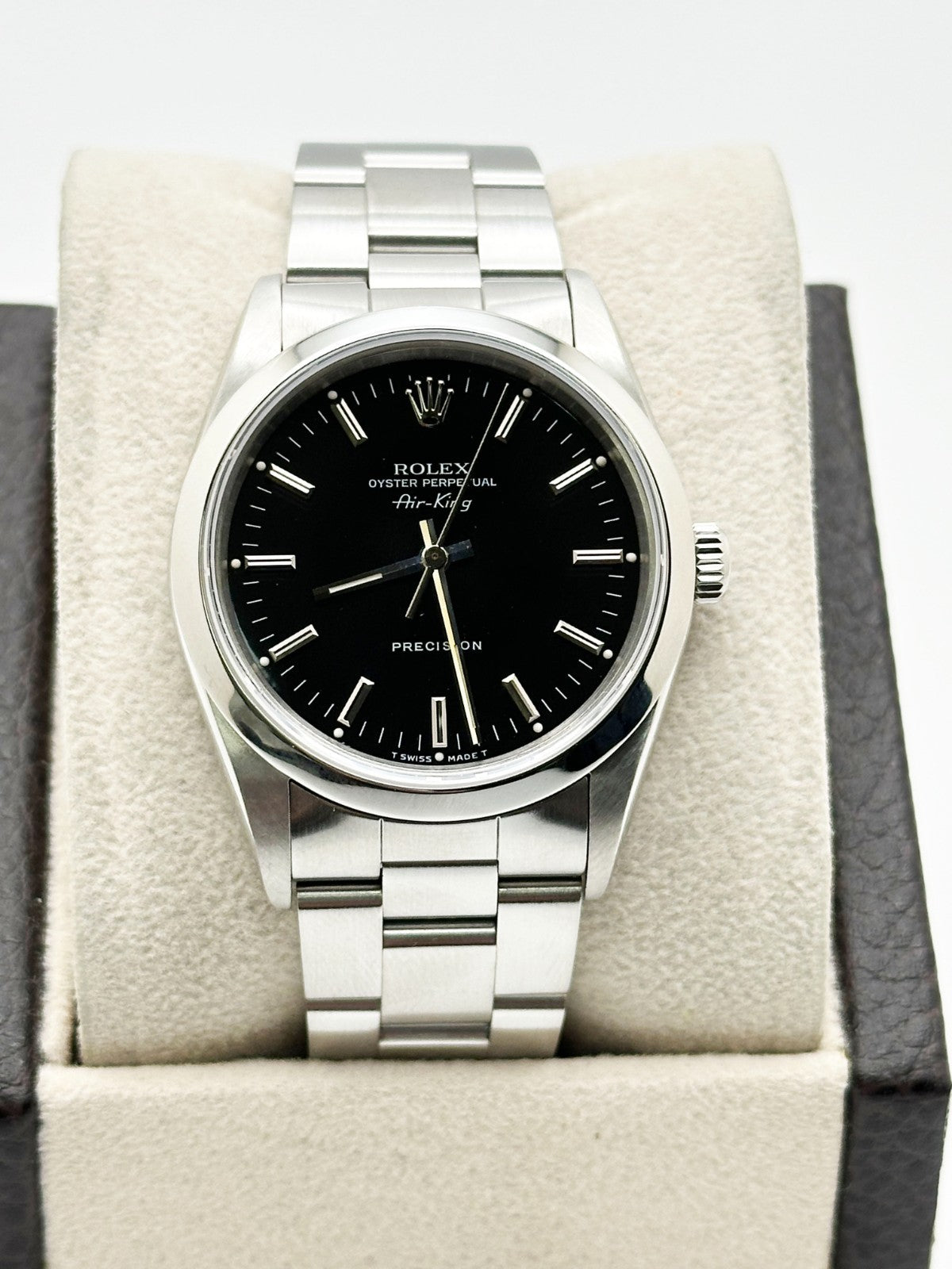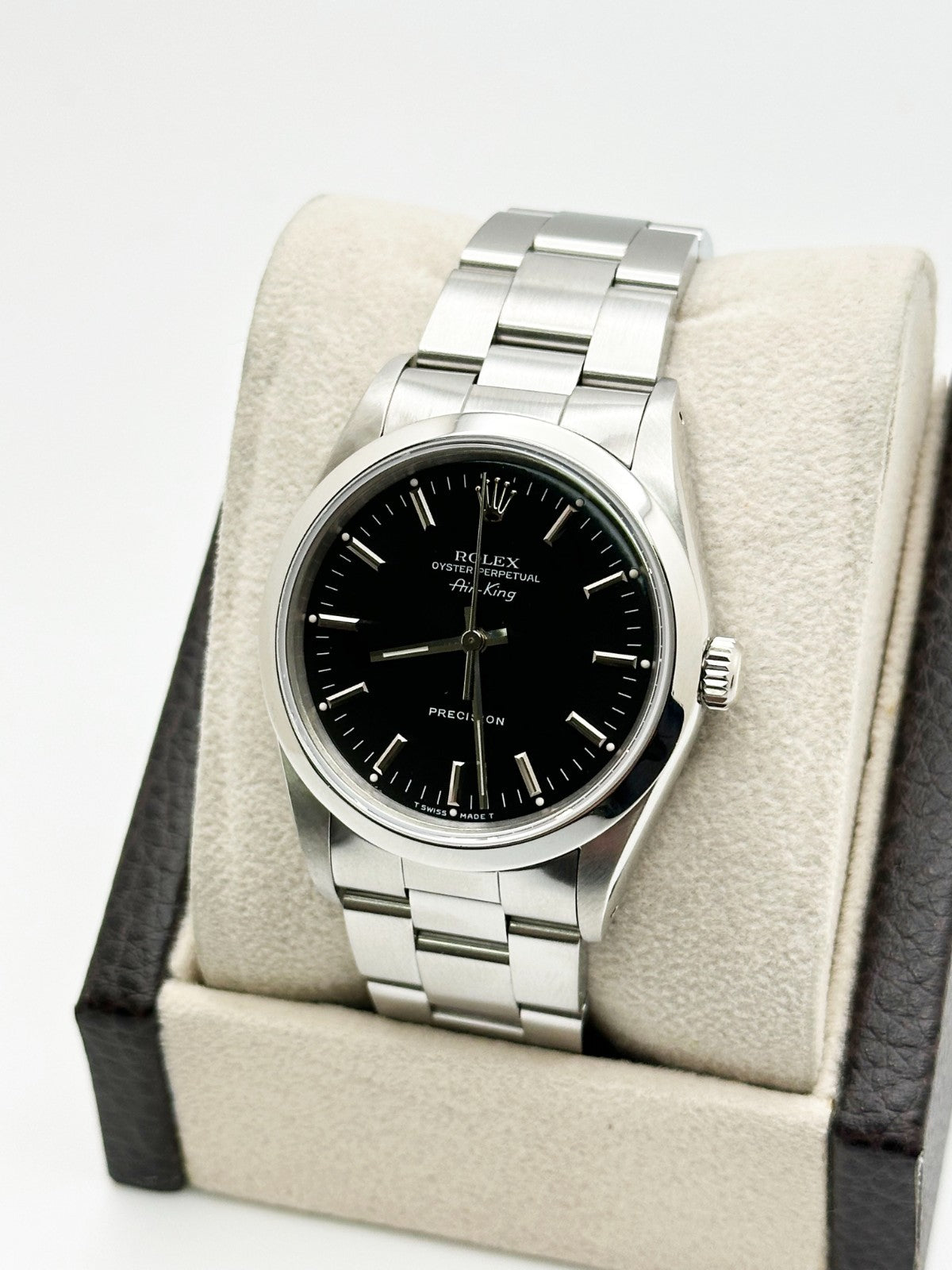 Rolex Air King 14000 34mm Black Dial Stainless Steel Rolex Sale! from 439500 /per This item is a recurring or deferred purchase. By continuing, I agree to the cancellation policy and authorize you to charge my payment method at the prices, frequency and dates listed on this page until my order is fulfilled or I cancel, if permitted. +1 (619) 232-1273 This item is currently on backorder but you can still purchase it now and we'll ship as soon as more become available. Style Number: 14000Serial: N23****Year: 1991 Model: Rolex Air King Case Material: Stainless Steel Band: Stainless Steel Bezel: Stainless Steel Dial: Black Dial Crystal: Sapphire Crystal Case Size: 34mm Includes: -Elegant Watch Box -Certified Appraisal -1 Year WarrantySKU 22740 / 17470TJD062625