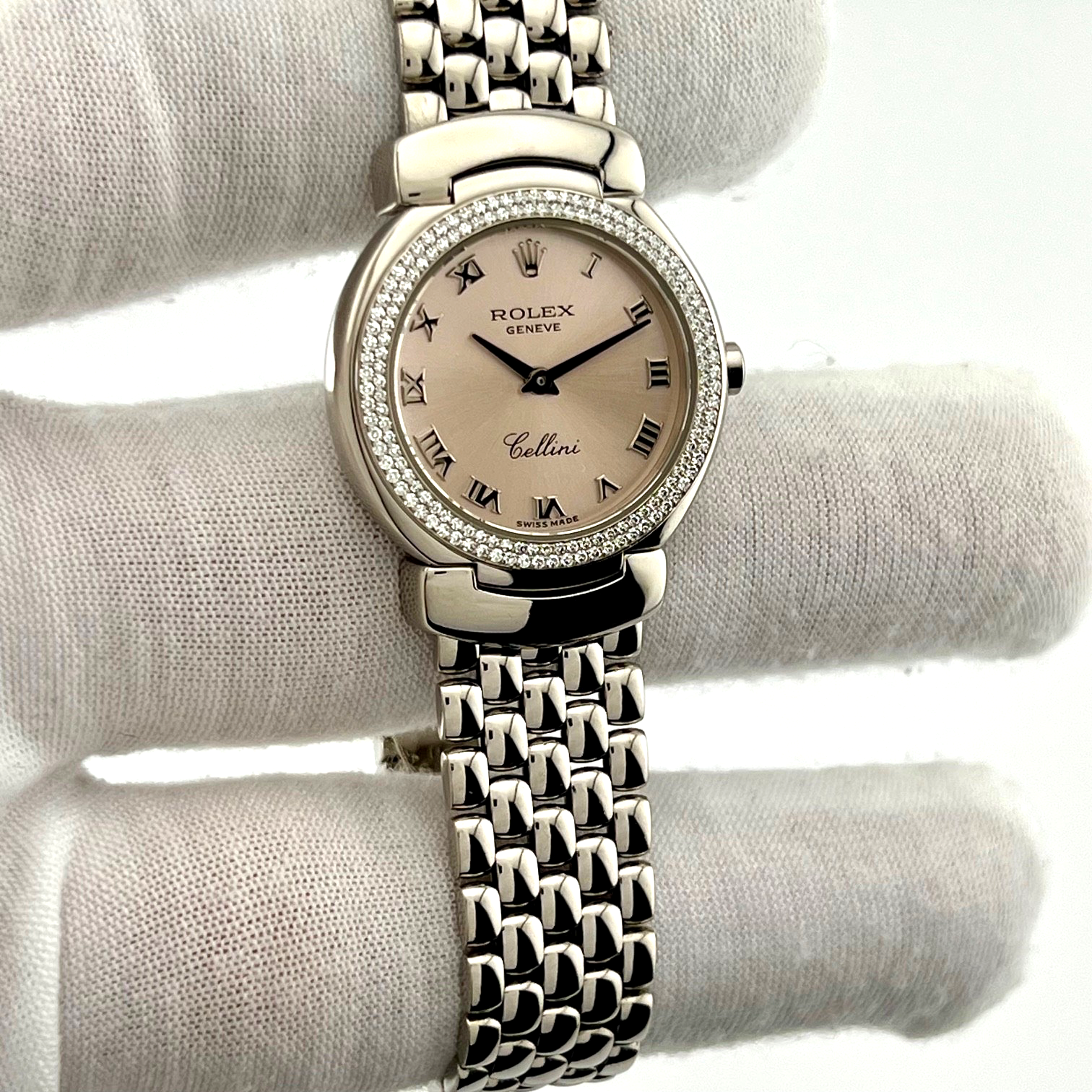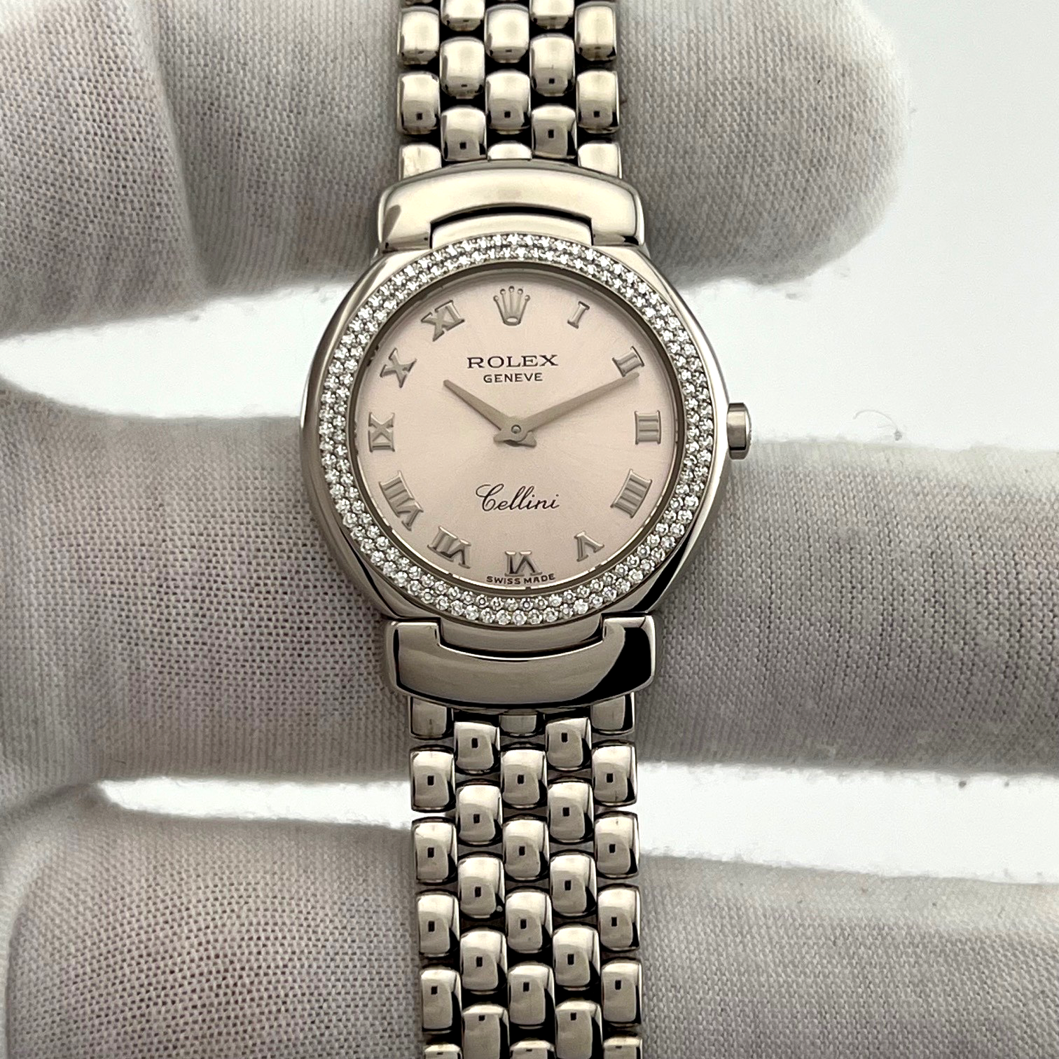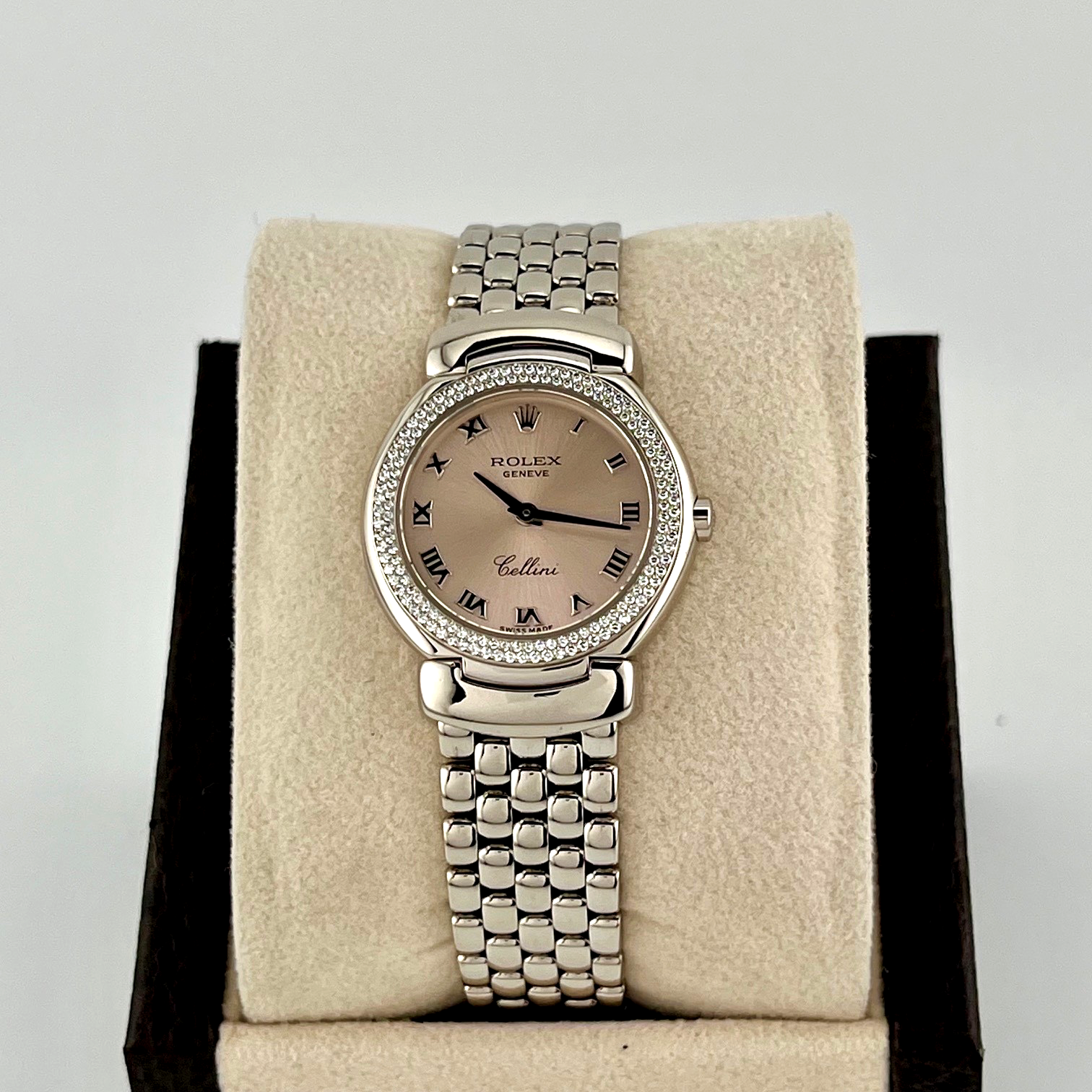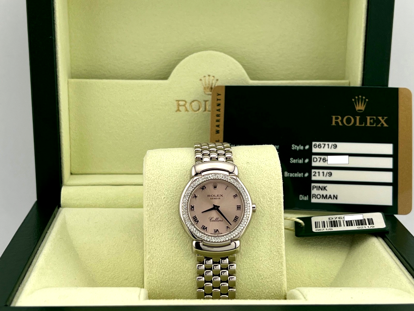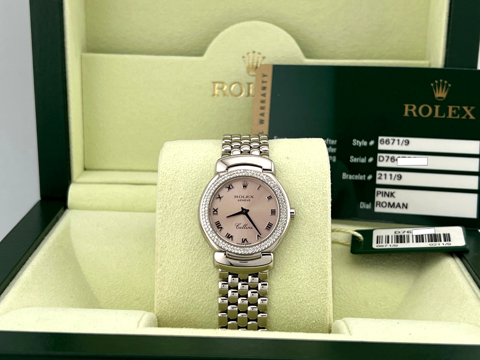 Rolex Cellini Cellissima 6671/9 26mm Pink Dial Diamond Bezel 18k Gold Box Papers Rolex Sale! from 1379500 /per This item is a recurring or deferred purchase. By continuing, I agree to the cancellation policy and authorize you to charge my payment method at the prices, frequency and dates listed on this page until my order is fulfilled or I cancel, if permitted. +1 (619) 232-1273 This item is currently on backorder but you can still purchase it now and we'll ship as soon as more become available. Style Number: 6671/9Serial: D76****Year: 2009 Model: Rolex Cellini Cellissima Case Material: 18k White Gold Band: 18k White Gold Bezel: Factory 2 Row Diamond Bezel Dial: Pink Roman Numeral Dial Crystal: Sapphire Case Size: 26mm Includes: - Rolex Box & Paper- Certified Appraisal - 1 Year WarrantySKU 23029 / 122110TBJ090925