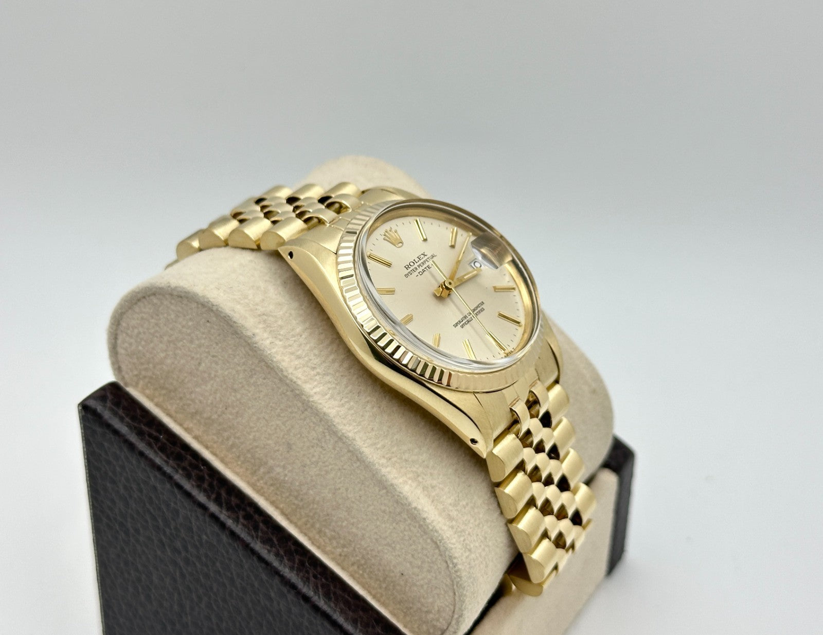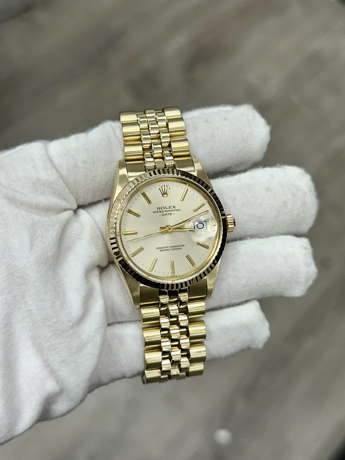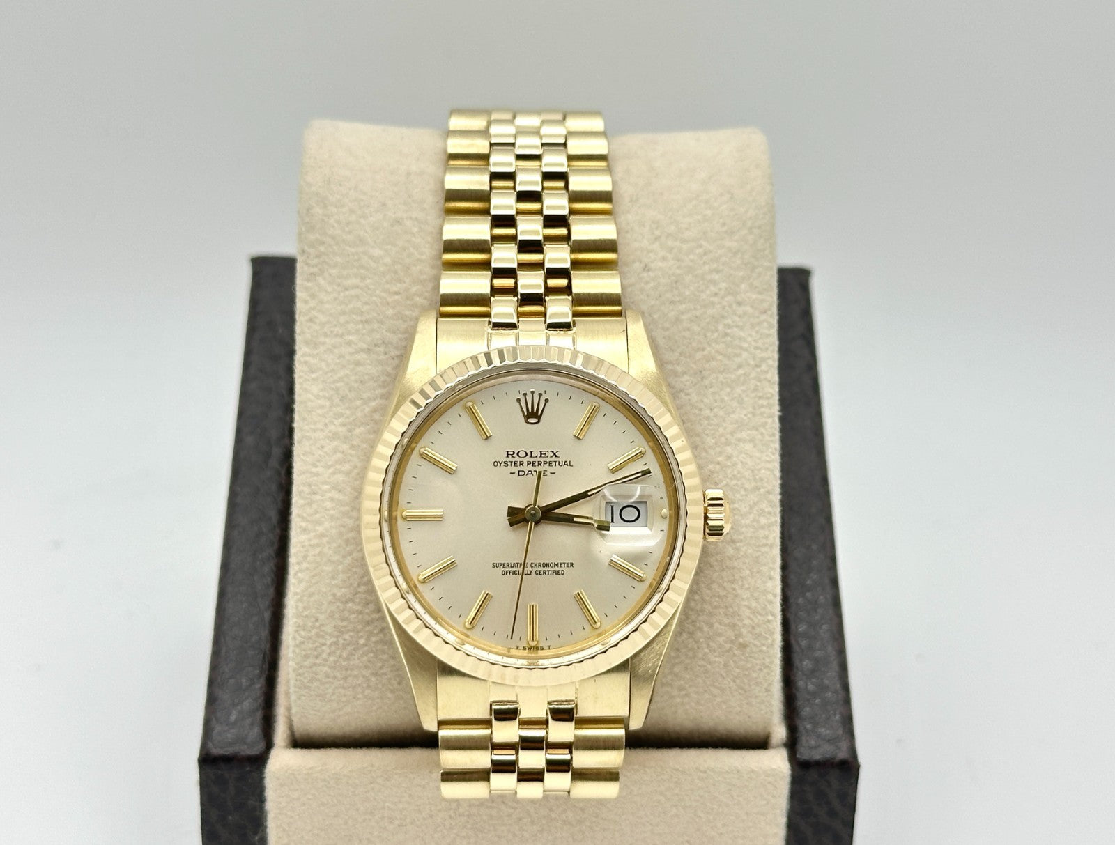 Rolex Date 15037 34mm Silver Dial 14k Yellow Gold Service Papers Rolex Sale! from 1199500 /per This item is a recurring or deferred purchase. By continuing, I agree to the cancellation policy and authorize you to charge my payment method at the prices, frequency and dates listed on this page until my order is fulfilled or I cancel, if permitted. +1 (619) 232-1273 This item is currently on backorder but you can still purchase it now and we'll ship as soon as more become available. Style Number: 15037Serial: 6735***Year: 1981 Model: Rolex Date Case Material: 14K Yellow Gold Band: 14K Yellow Gold Bezel: 14K Yellow Gold Dial: Silver Crystal: Sapphire Crystal Case Size: 34mm Includes: - Rolex Service Box & Service Paper- Certified Appraisal - One Year WarrantySKU 23117 / 123475TOFC