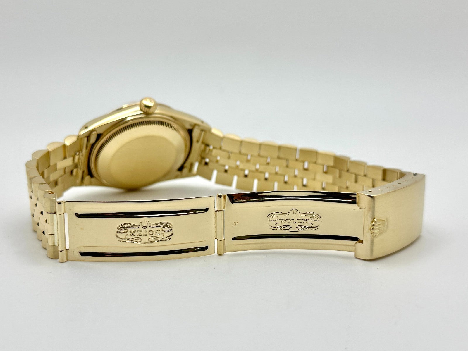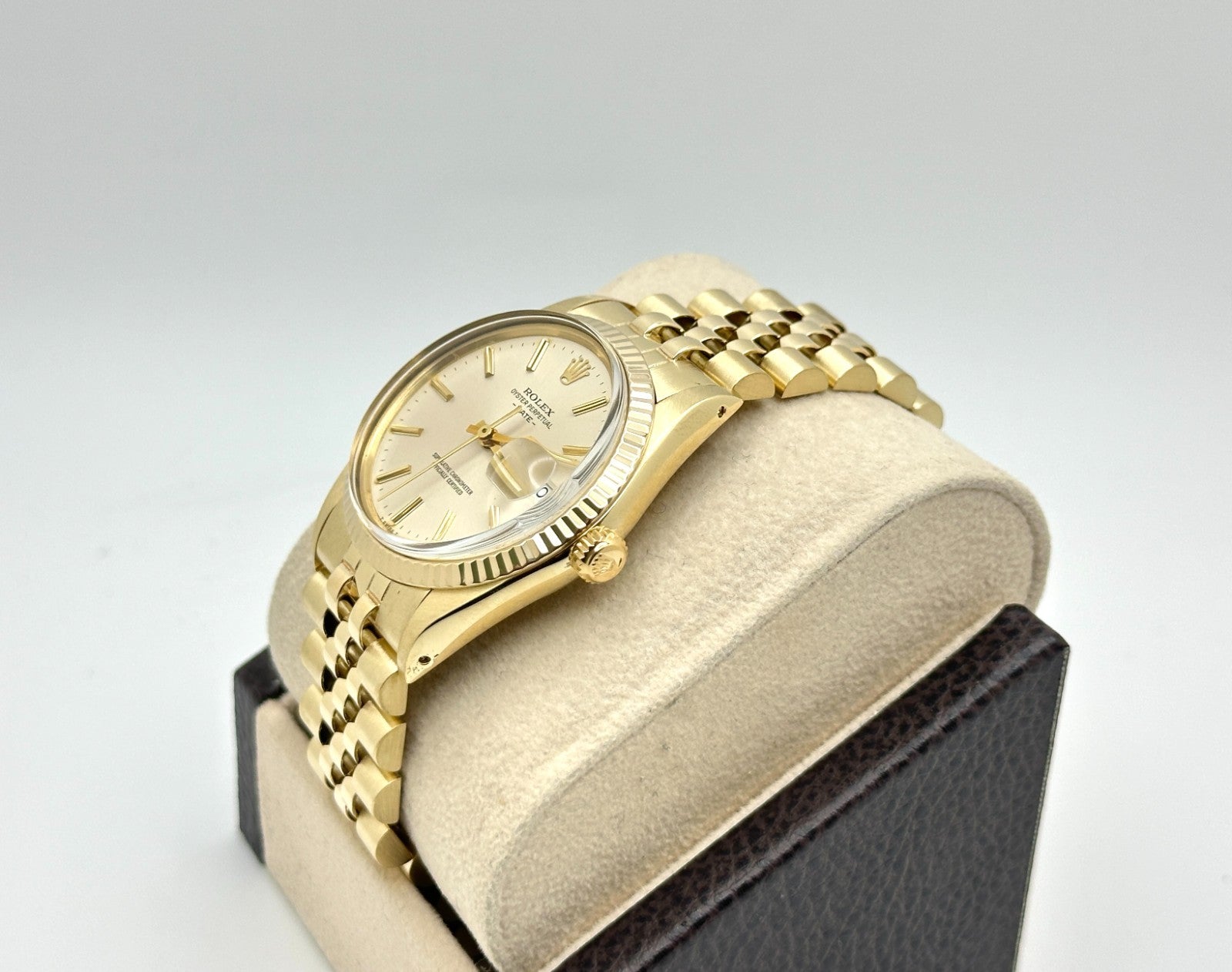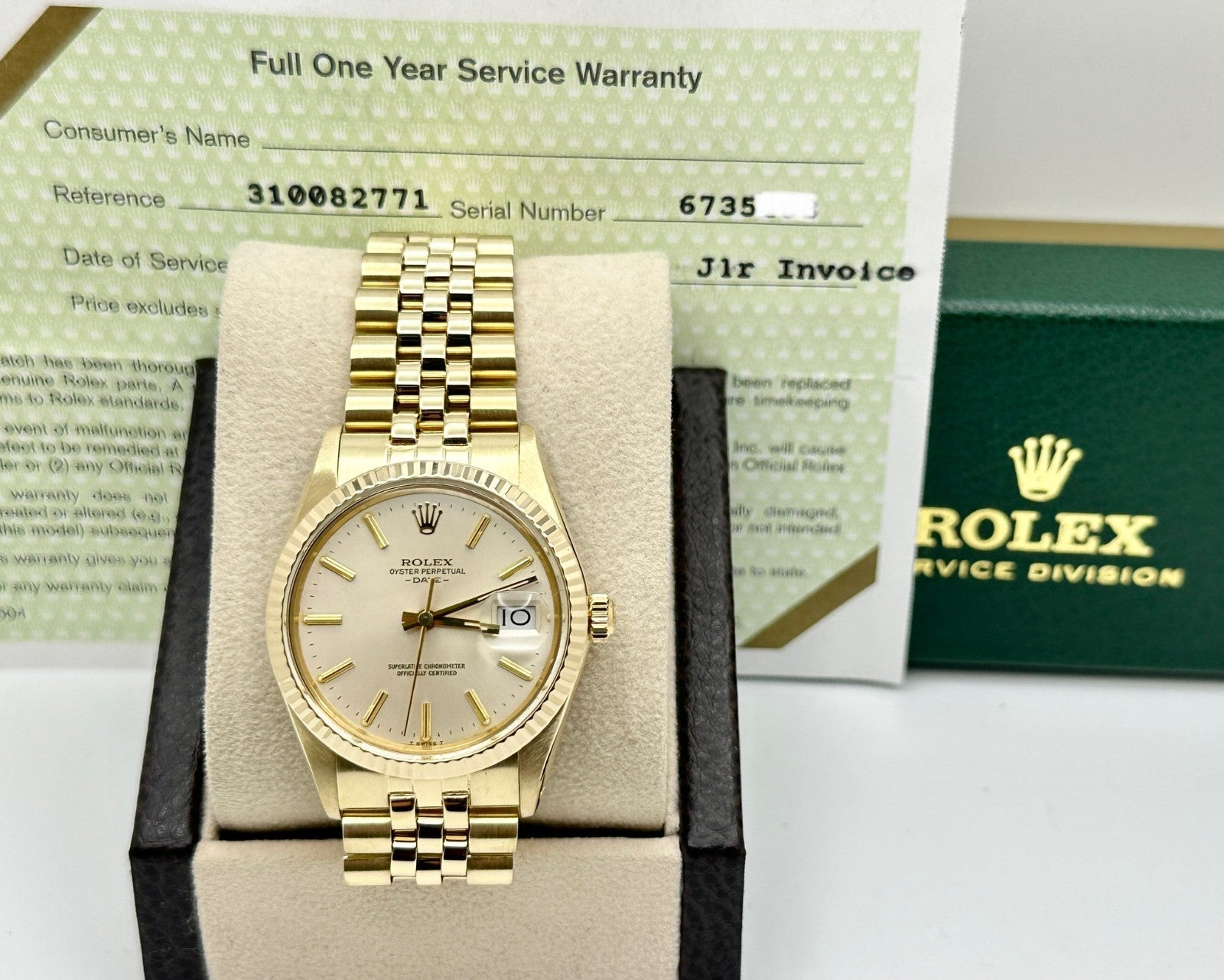 Rolex Date 15037 34mm Silver Dial 14k Yellow Gold Service Papers Rolex Sale! from 1199500 /per This item is a recurring or deferred purchase. By continuing, I agree to the cancellation policy and authorize you to charge my payment method at the prices, frequency and dates listed on this page until my order is fulfilled or I cancel, if permitted. +1 (619) 232-1273 This item is currently on backorder but you can still purchase it now and we'll ship as soon as more become available. Style Number: 15037Serial: 6735***Year: 1981 Model: Rolex Date Case Material: 14K Yellow Gold Band: 14K Yellow Gold Bezel: 14K Yellow Gold Dial: Silver Crystal: Sapphire Crystal Case Size: 34mm Includes: - Rolex Service Box & Service Paper- Certified Appraisal - One Year WarrantySKU 23117 / 123475TOFC