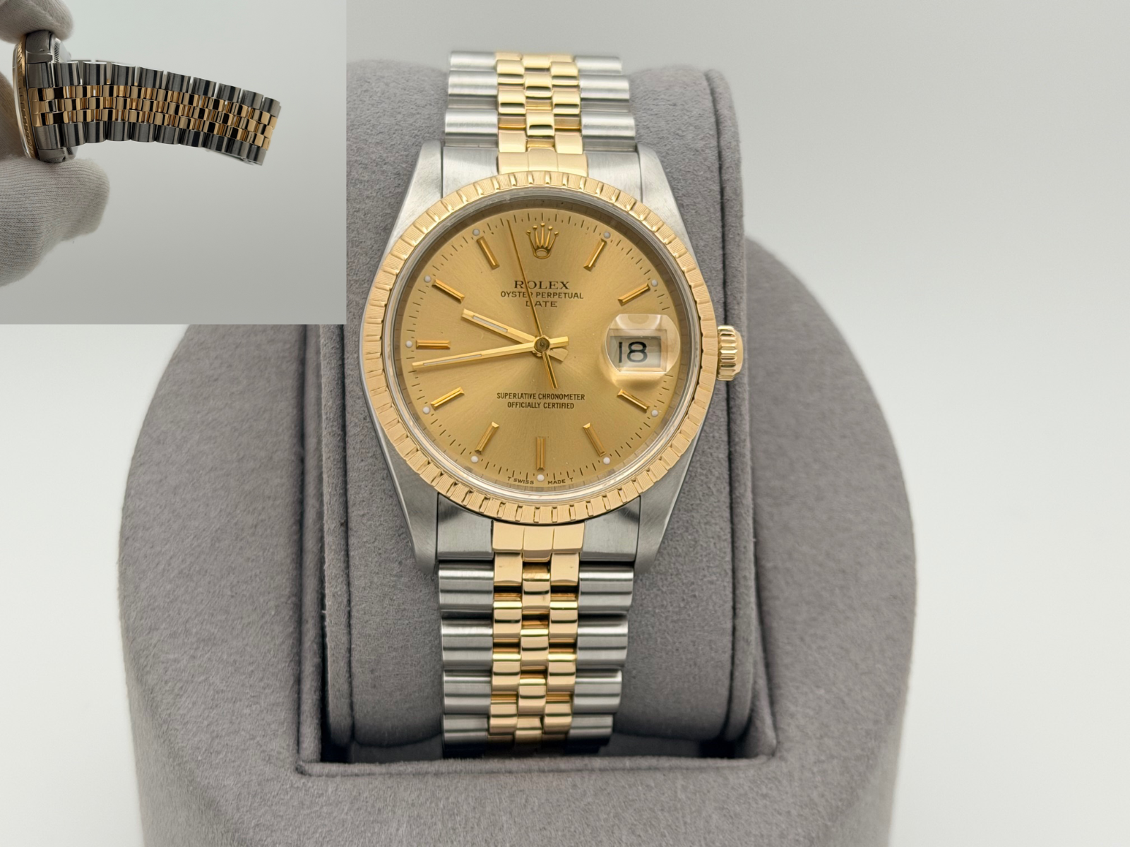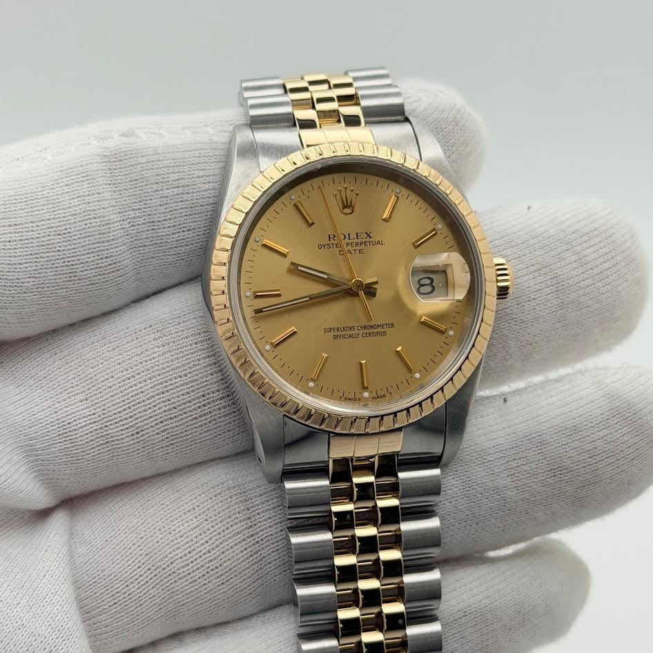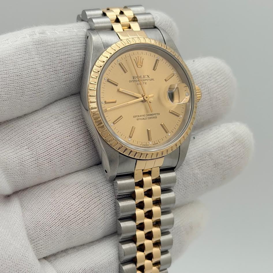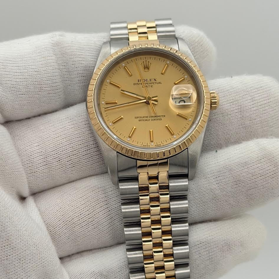 Rolex Date 15223 34mm Champagne Dial 18k Yellow Gold Stainless Steel Jubilee Rolex Sale! from 639500 /per This item is a recurring or deferred purchase. By continuing, I agree to the cancellation policy and authorize you to charge my payment method at the prices, frequency and dates listed on this page until my order is fulfilled or I cancel, if permitted. +1 (619) 232-1273 This item is currently on backorder but you can still purchase it now and we'll ship as soon as more become available. Style Number: 15223Serial: E43****Year: 1990 Model: Rolex Date Case Material: Stainless Steel Band: 18k Yellow Gold & Stainless Steel Jubilee Bezel: 18k Yellow Gold Dial: Champagne Crystal: Sapphire Case Size: 34mm Includes: - Elegant Watch Box- Certified Appraisal - 1 Year WarrantySKU 22543 / 18202TJD042325