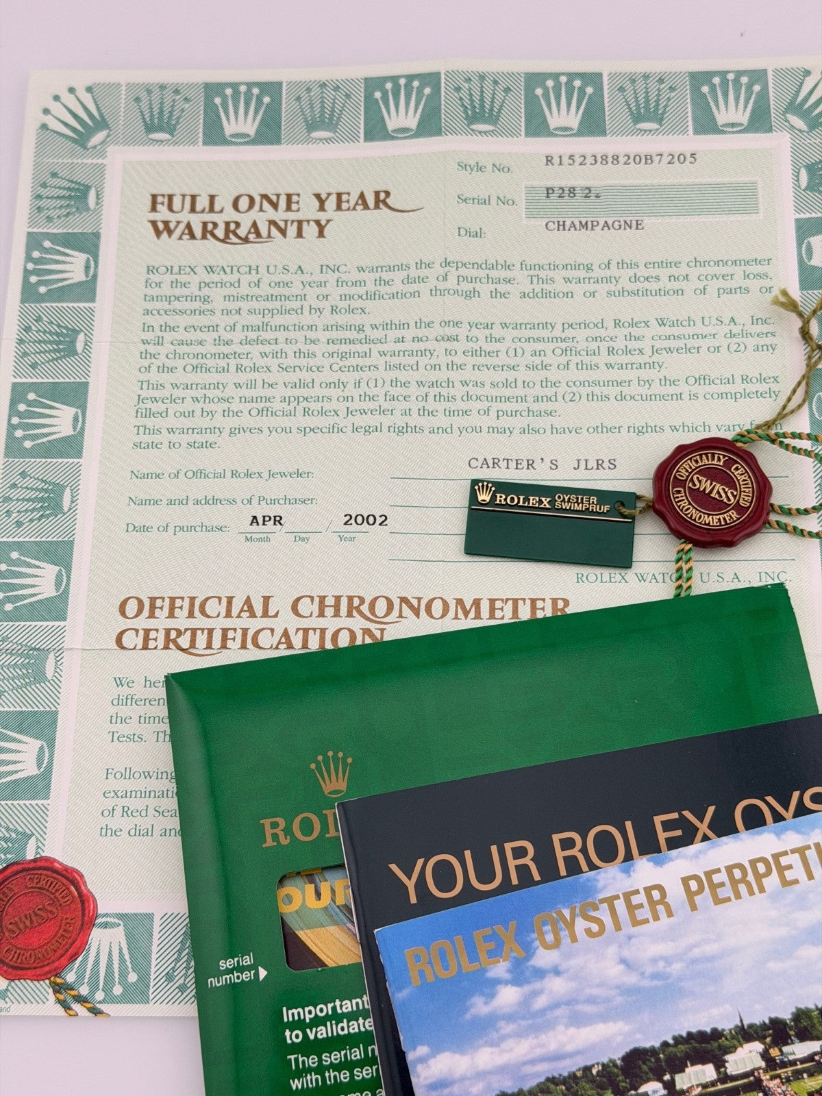 Rolex Date 15238 34mm Champagne Dial 18k Yellow Gold Oyster Box Paper 2002