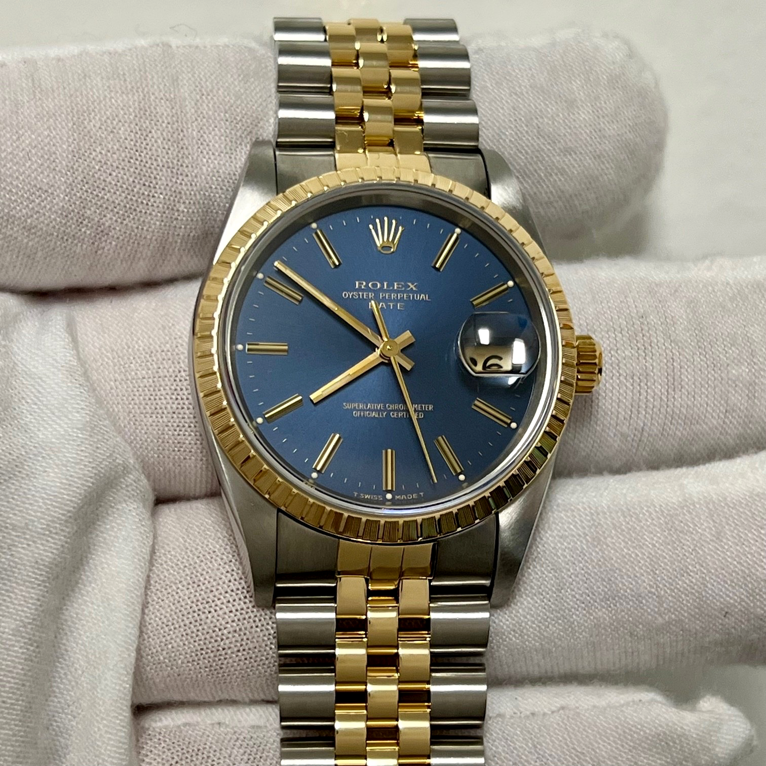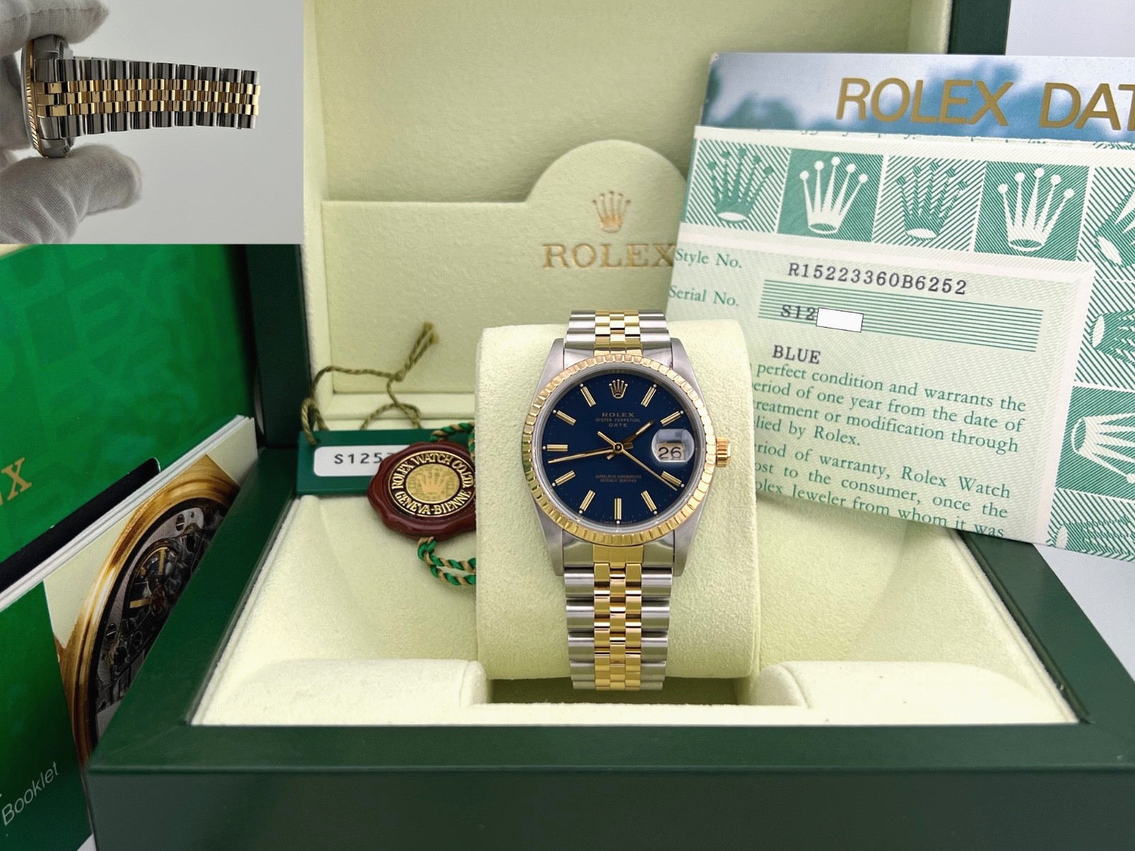 Rolex Datejust 15223 34mm Blue Dial 18k Gold Stainless Steel Jubilee Box Papers