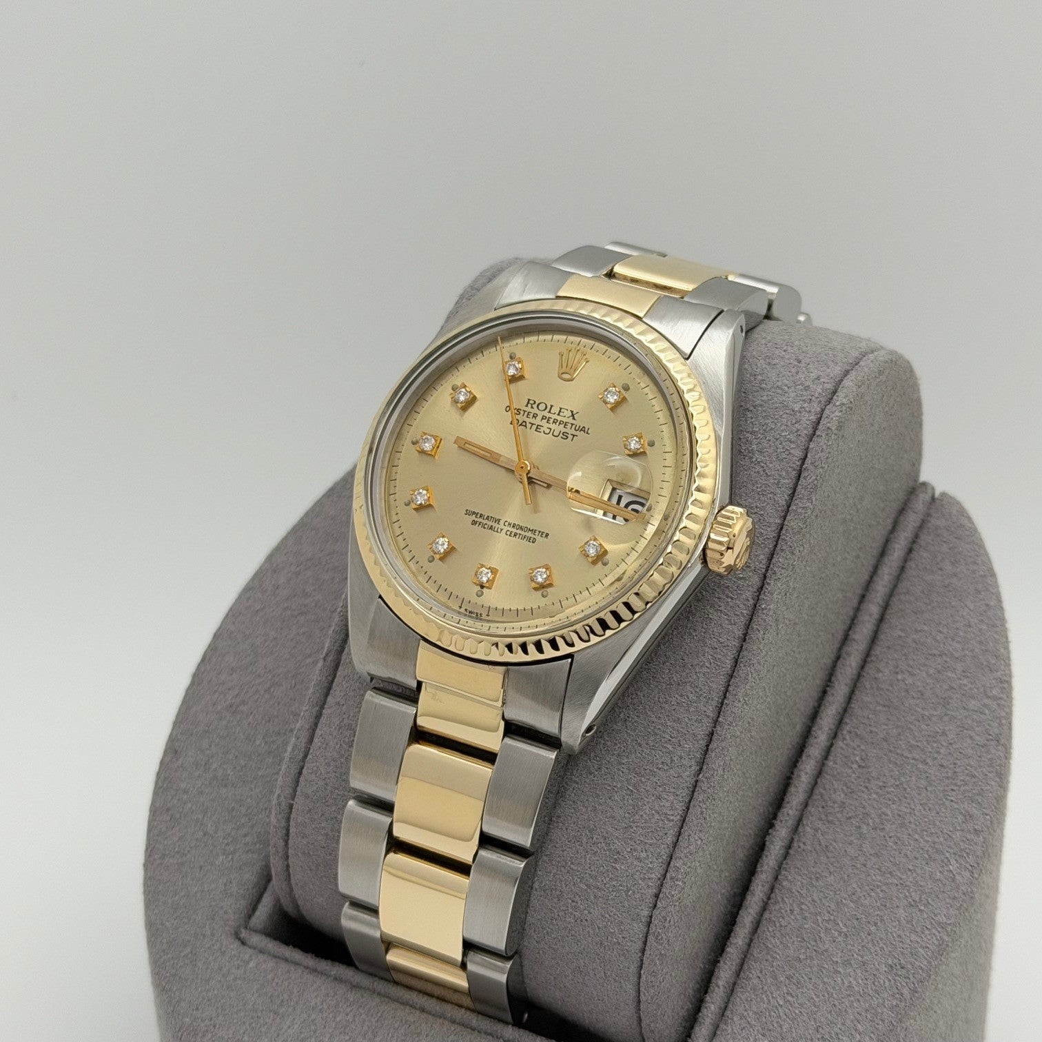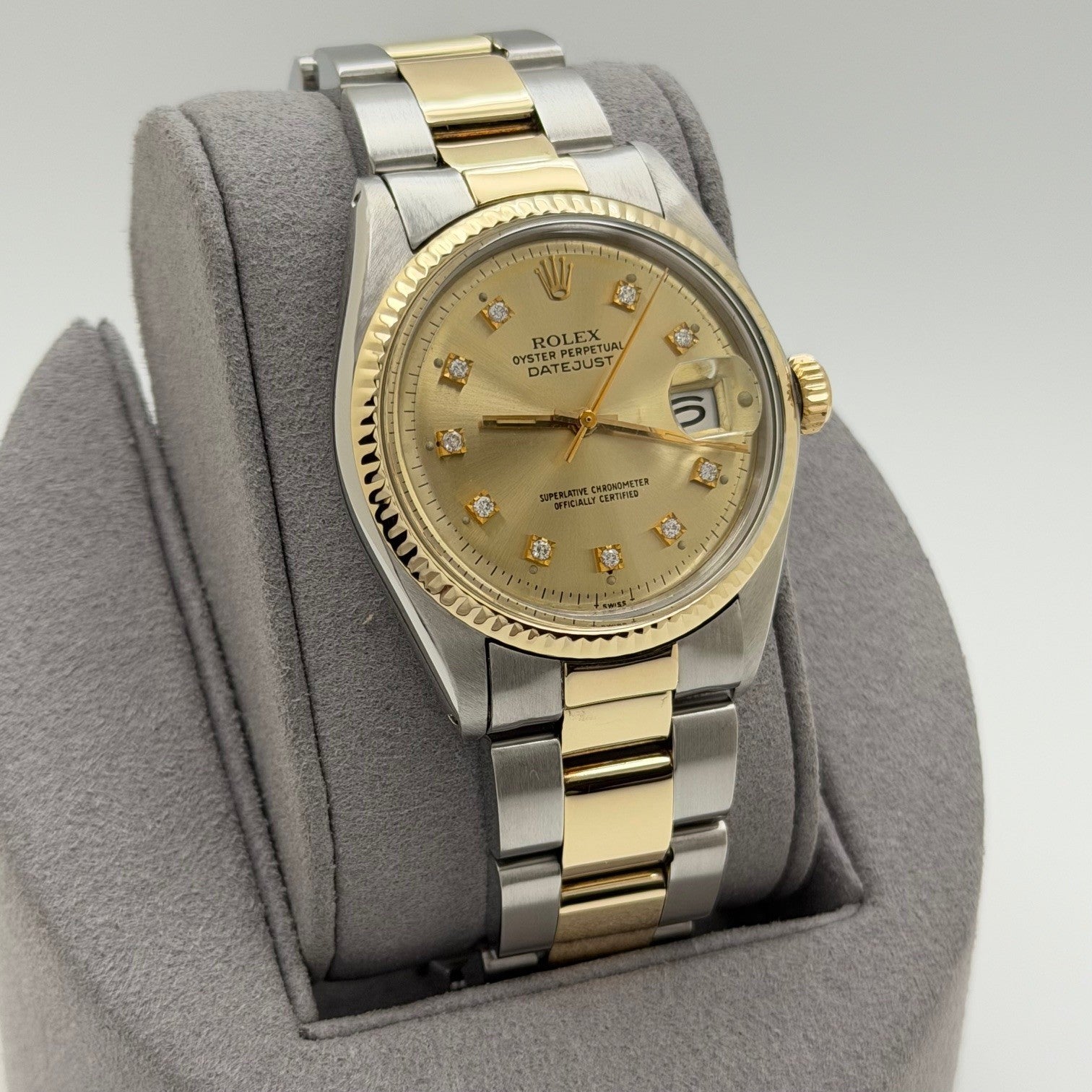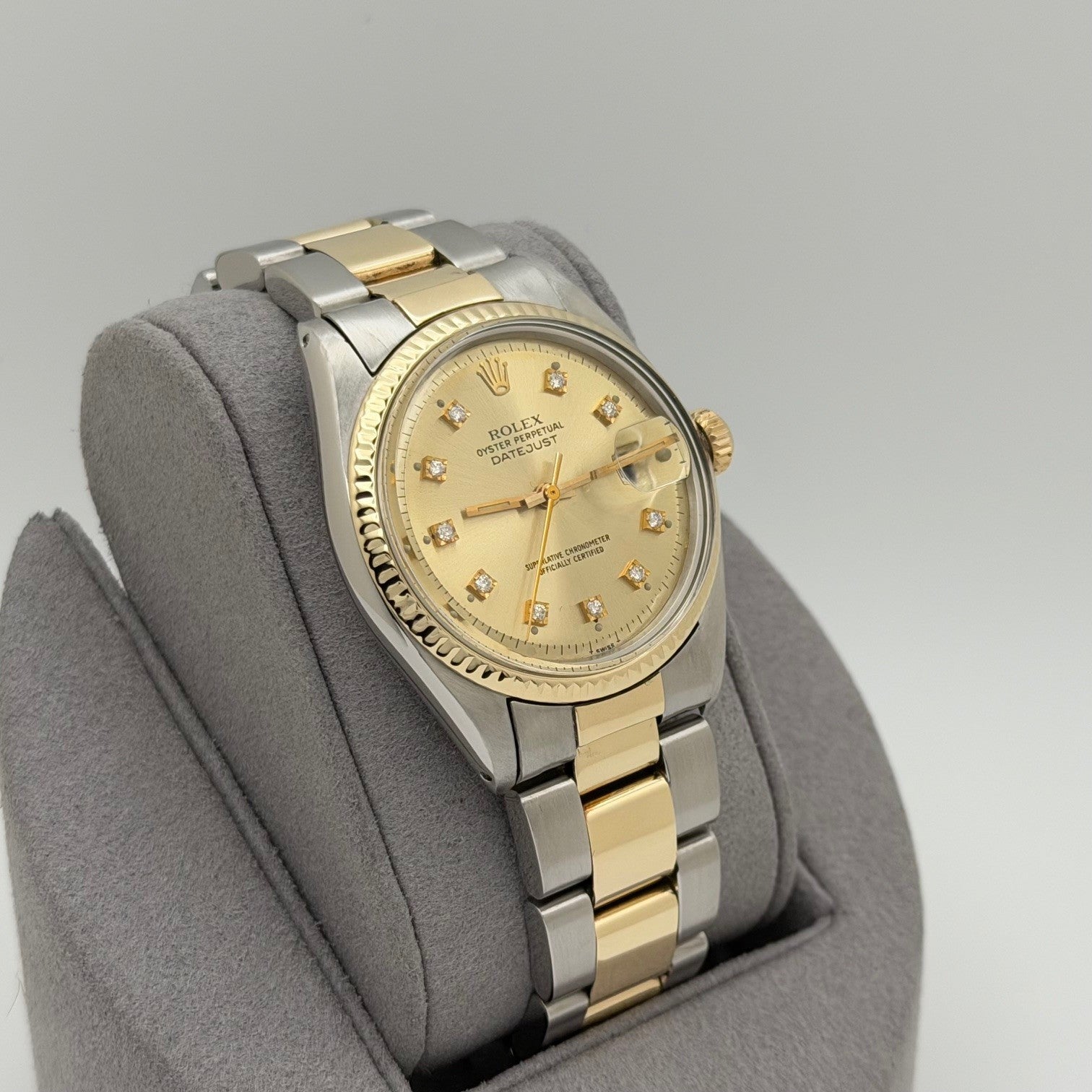 Rolex Datejust 1601 36mm Champagne Diamond Dial 14k Yellow Gold Stainless Steel Rolex Sale! from 499500 /per This item is a recurring or deferred purchase. By continuing, I agree to the cancellation policy and authorize you to charge my payment method at the prices, frequency and dates listed on this page until my order is fulfilled or I cancel, if permitted. +1 (619) 232-1273 This item is currently on backorder but you can still purchase it now and we'll ship as soon as more become available. Style Number: 1601Serial: 328****Year: 1973 Model: Rolex Datejust Case Material: Stainless Steel Band: 14k Yellow Gold & Stainless Steel Bezel: 14k Yellow Gold Fluted Dial: Custom Champagne Diamond Dial Crystal: Acrylic Case Size: 36mm Includes: - Elegant Watch Box- Certified Appraisal - 1 Year WarrantySKU 23116 / 17845TBJ092325