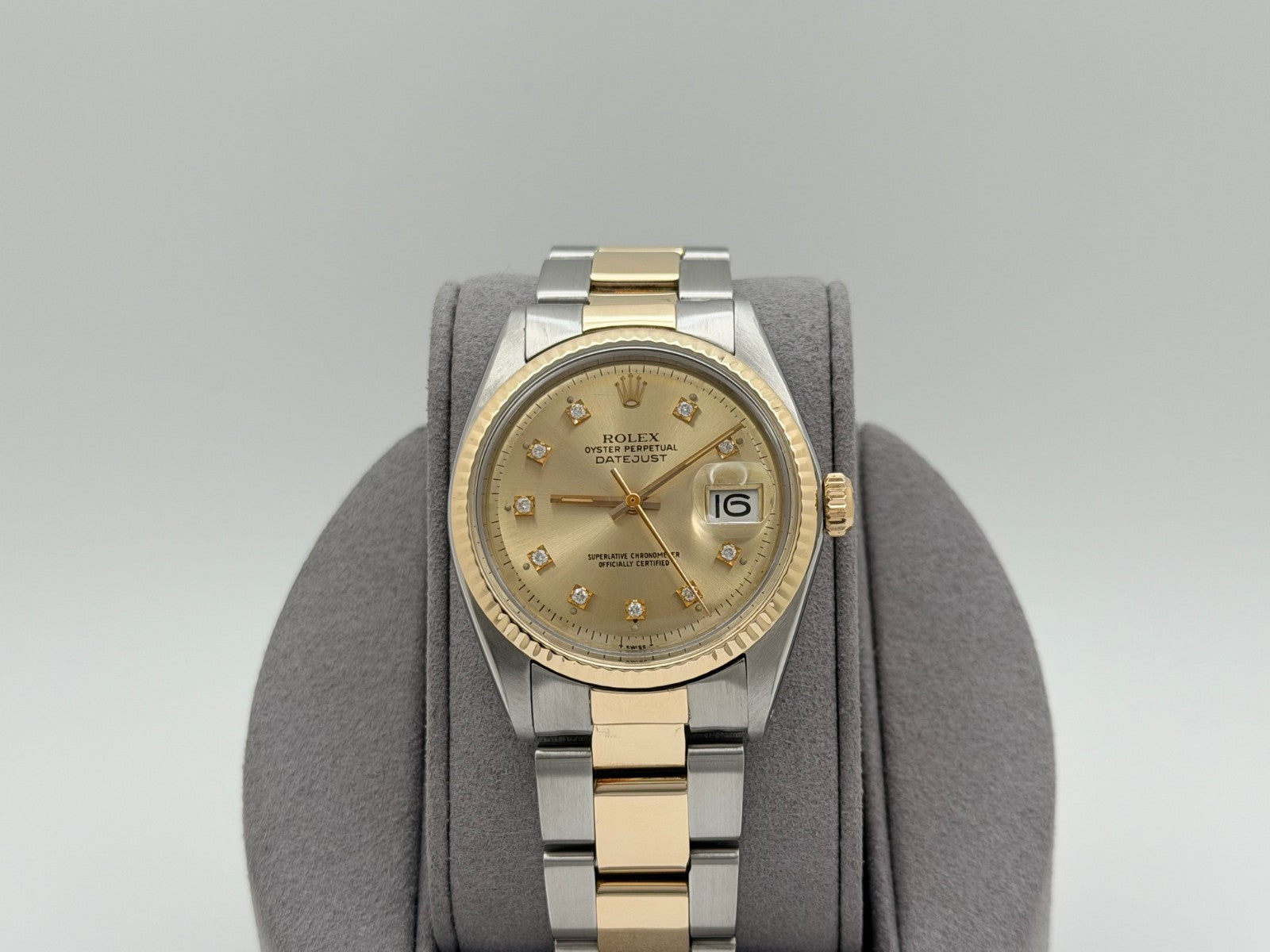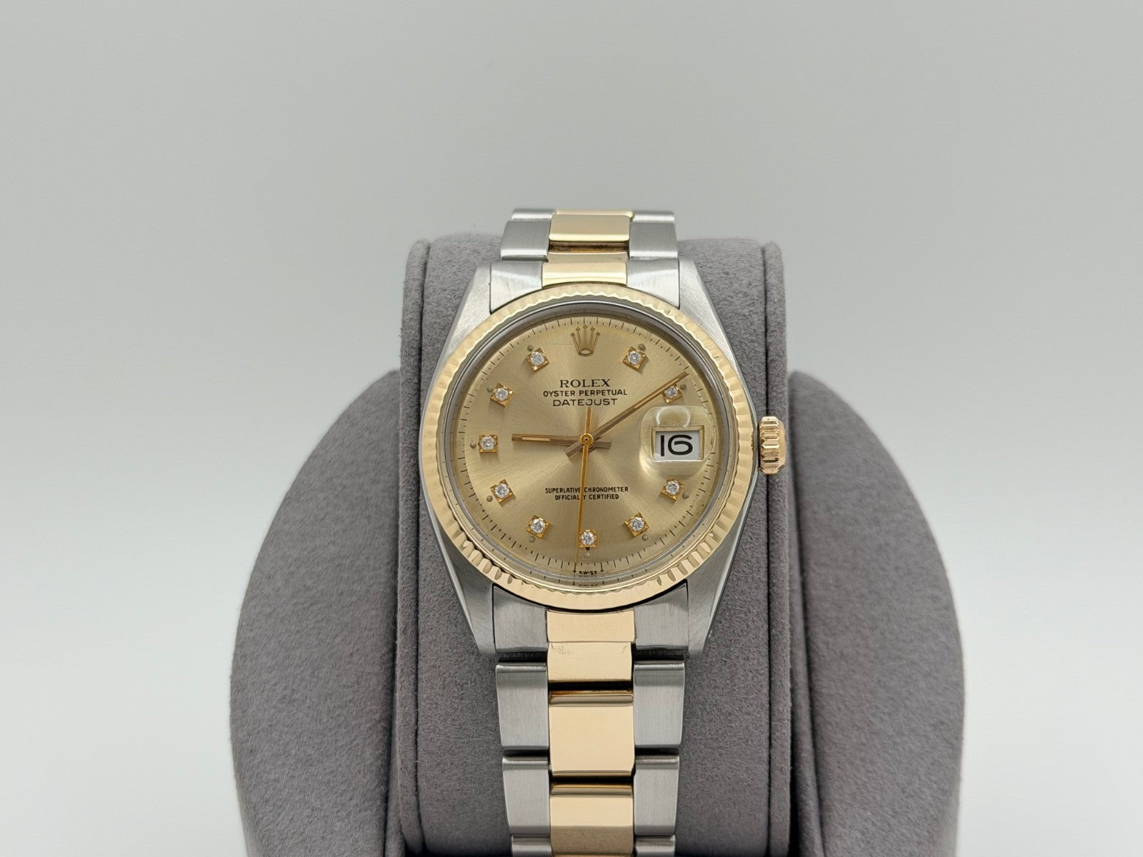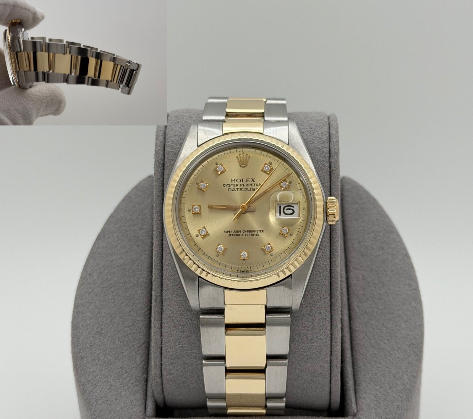 Rolex Datejust 1601 36mm Champagne Diamond Dial 14k Yellow Gold Stainless Steel Rolex Sale! from 499500 /per This item is a recurring or deferred purchase. By continuing, I agree to the cancellation policy and authorize you to charge my payment method at the prices, frequency and dates listed on this page until my order is fulfilled or I cancel, if permitted. +1 (619) 232-1273 This item is currently on backorder but you can still purchase it now and we'll ship as soon as more become available. Style Number: 1601Serial: 328****Year: 1973 Model: Rolex Datejust Case Material: Stainless Steel Band: 14k Yellow Gold & Stainless Steel Bezel: 14k Yellow Gold Fluted Dial: Custom Champagne Diamond Dial Crystal: Acrylic Case Size: 36mm Includes: - Elegant Watch Box- Certified Appraisal - 1 Year WarrantySKU 23116 / 17845TBJ092325
