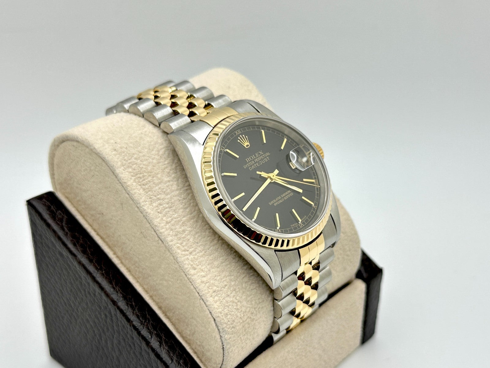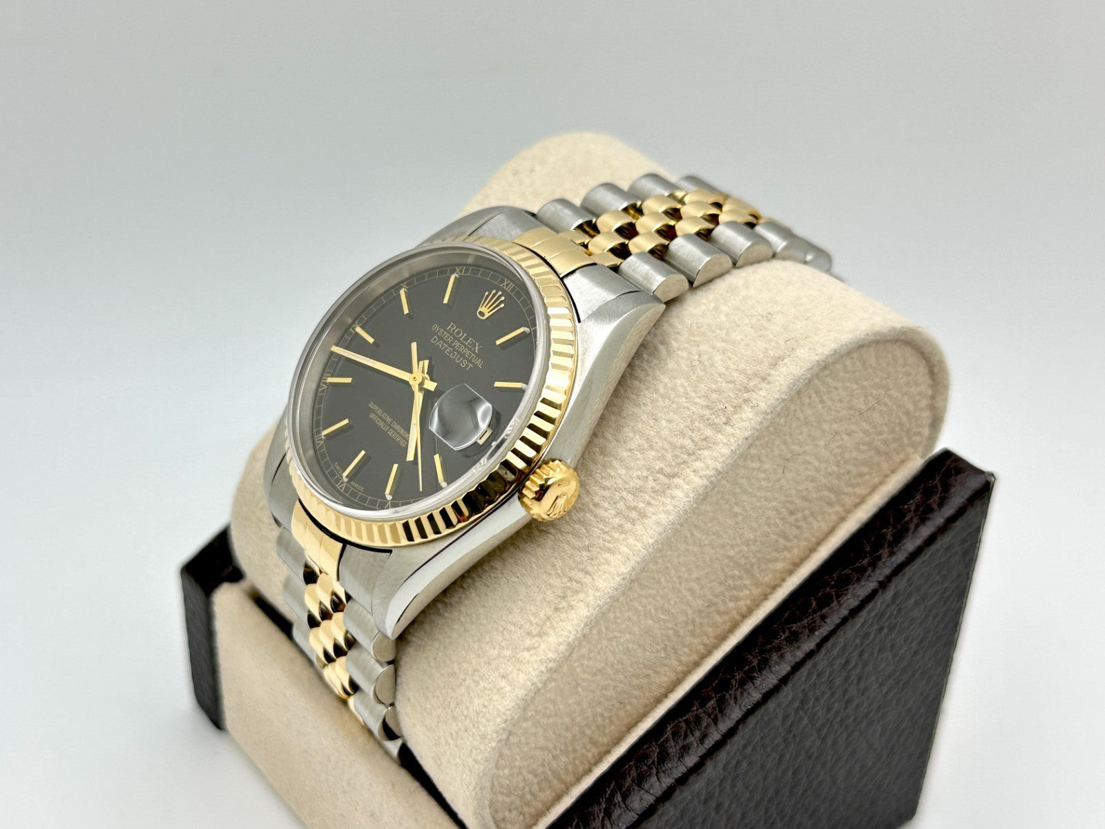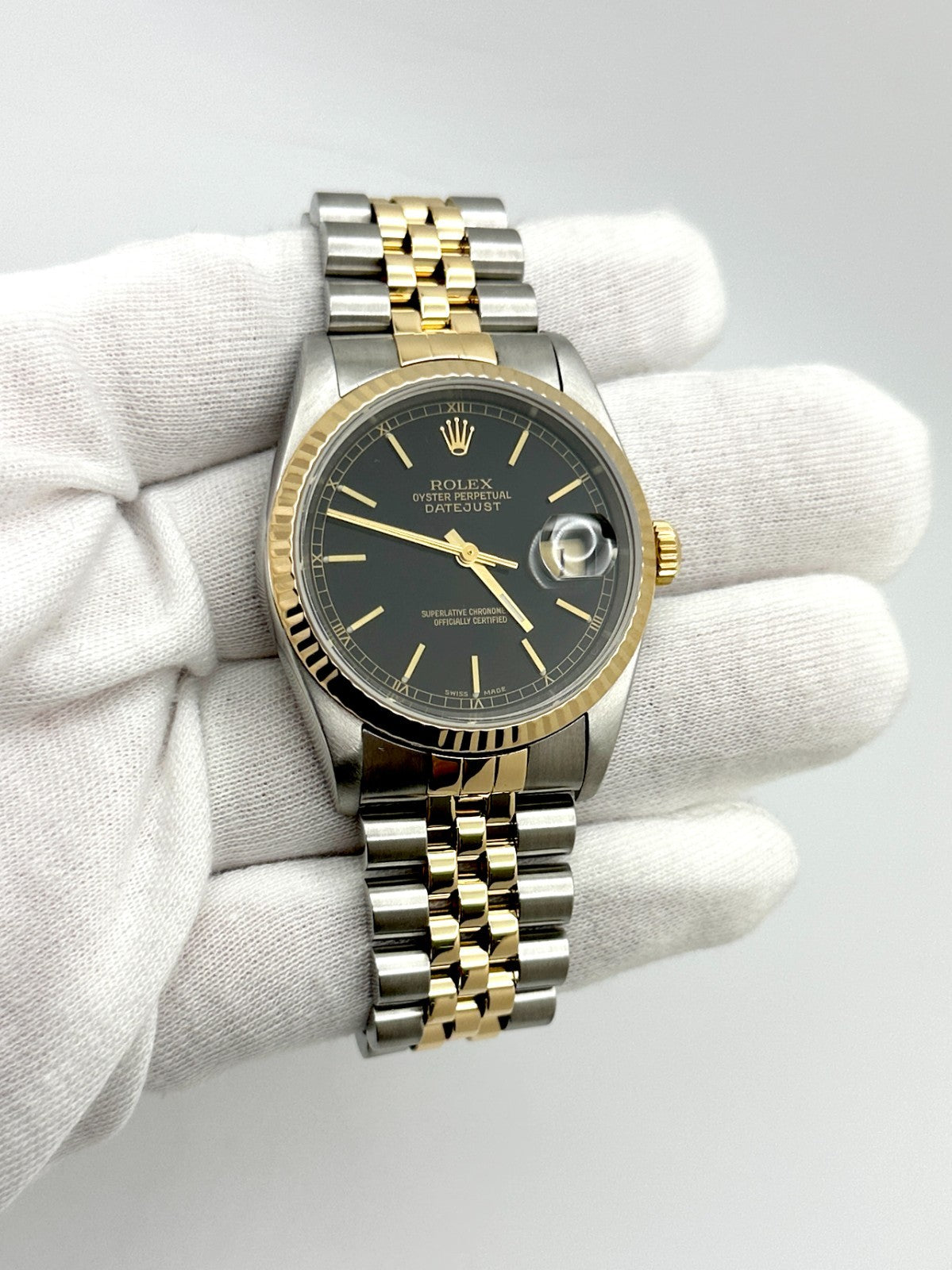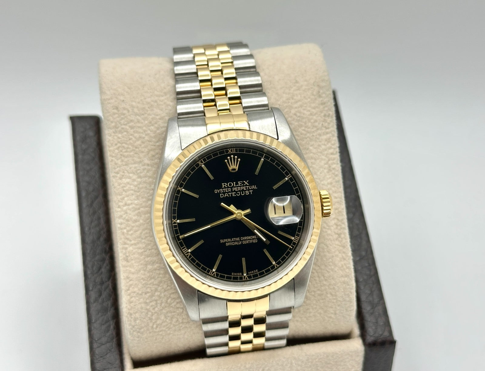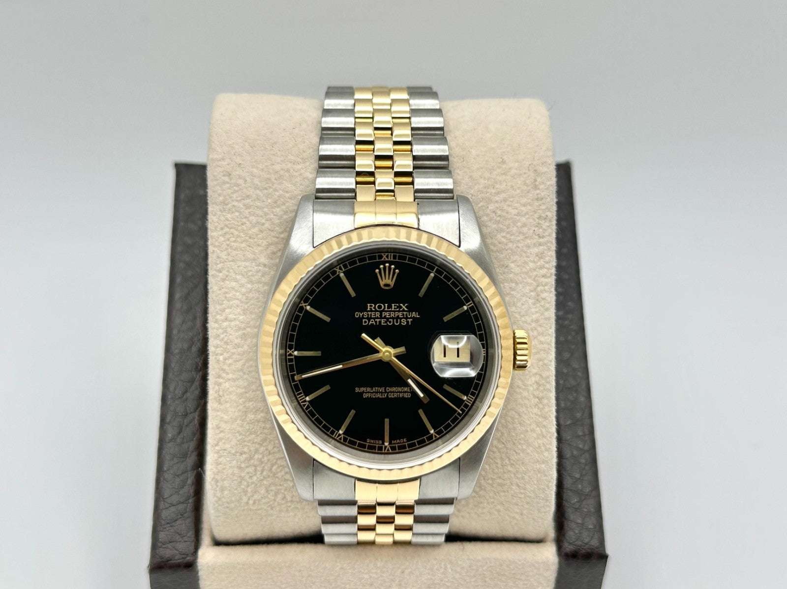 Rolex Datejust 16233 36mm Black Dial 18K Yellow Gold Stainless Steel Rolex Sale! from 779500 /per This item is a recurring or deferred purchase. By continuing, I agree to the cancellation policy and authorize you to charge my payment method at the prices, frequency and dates listed on this page until my order is fulfilled or I cancel, if permitted. +1 (619) 232-1273 This item is currently on backorder but you can still purchase it now and we'll ship as soon as more become available. Style Number: 16233Serial: K602***Year: 2001 Model: Rolex Datejust Case Material: Stainless Steel Band: 18K Yellow Gold & Stainless Steel Bezel: 18K Yellow Gold Dial: Black Crystal: Sapphire Crystal Case Size: 36mm Includes: - Elegant Watch Box- Certified Appraisal - One Year WarrantySKU 23610 / 114190TSD010826