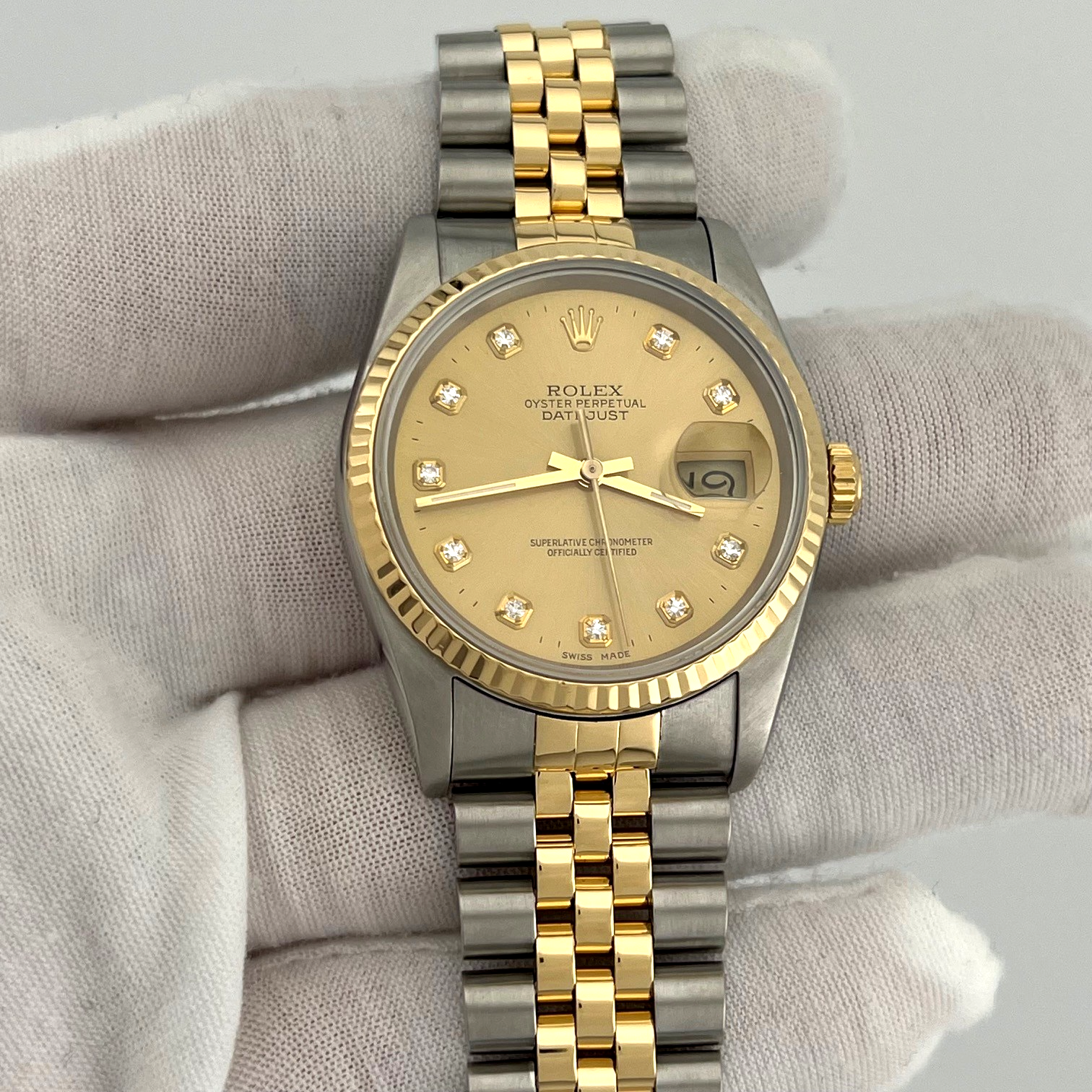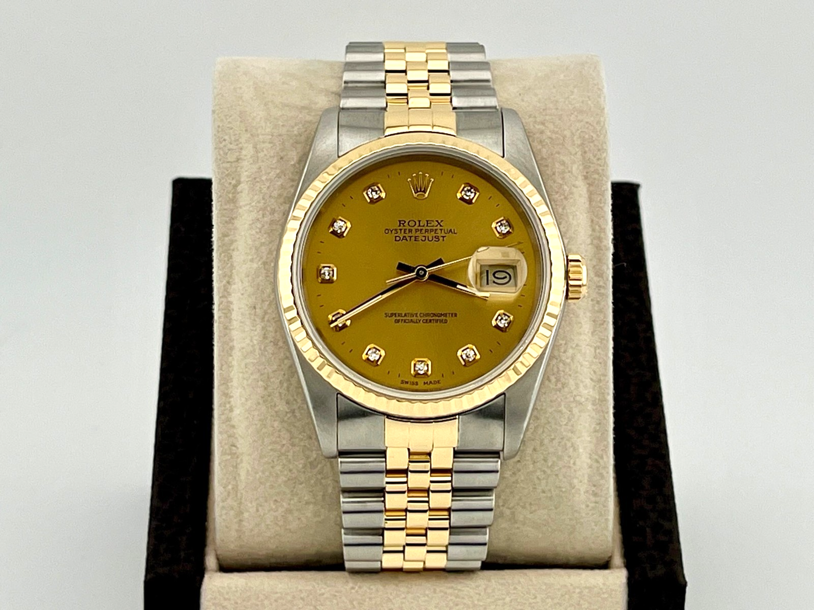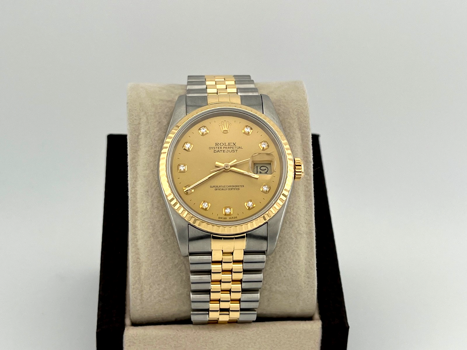 Rolex Datejust 16233 36mm Factory Champagne Diamond Dial 18k Gold Steel Rolex Sale! from 679500 /per This item is a recurring or deferred purchase. By continuing, I agree to the cancellation policy and authorize you to charge my payment method at the prices, frequency and dates listed on this page until my order is fulfilled or I cancel, if permitted. +1 (619) 232-1273 This item is currently on backorder but you can still purchase it now and we'll ship as soon as more become available. Style Number: 16233Serial: R73****Year: 1988 Model: Rolex Datejust Case Material: Stainless Steel Band: 18k Yellow Gold & Stainless Steel Jubilee Bezel: 18k Yellow Gold Fluted Dial: Factory Champagne Diamond Dial Crystal: Sapphire Case Size: 36mm Includes: - Elegant Watch Box- Certified Appraisal - 1 Year WarrantySKU 22912 / 114550TBJ081325