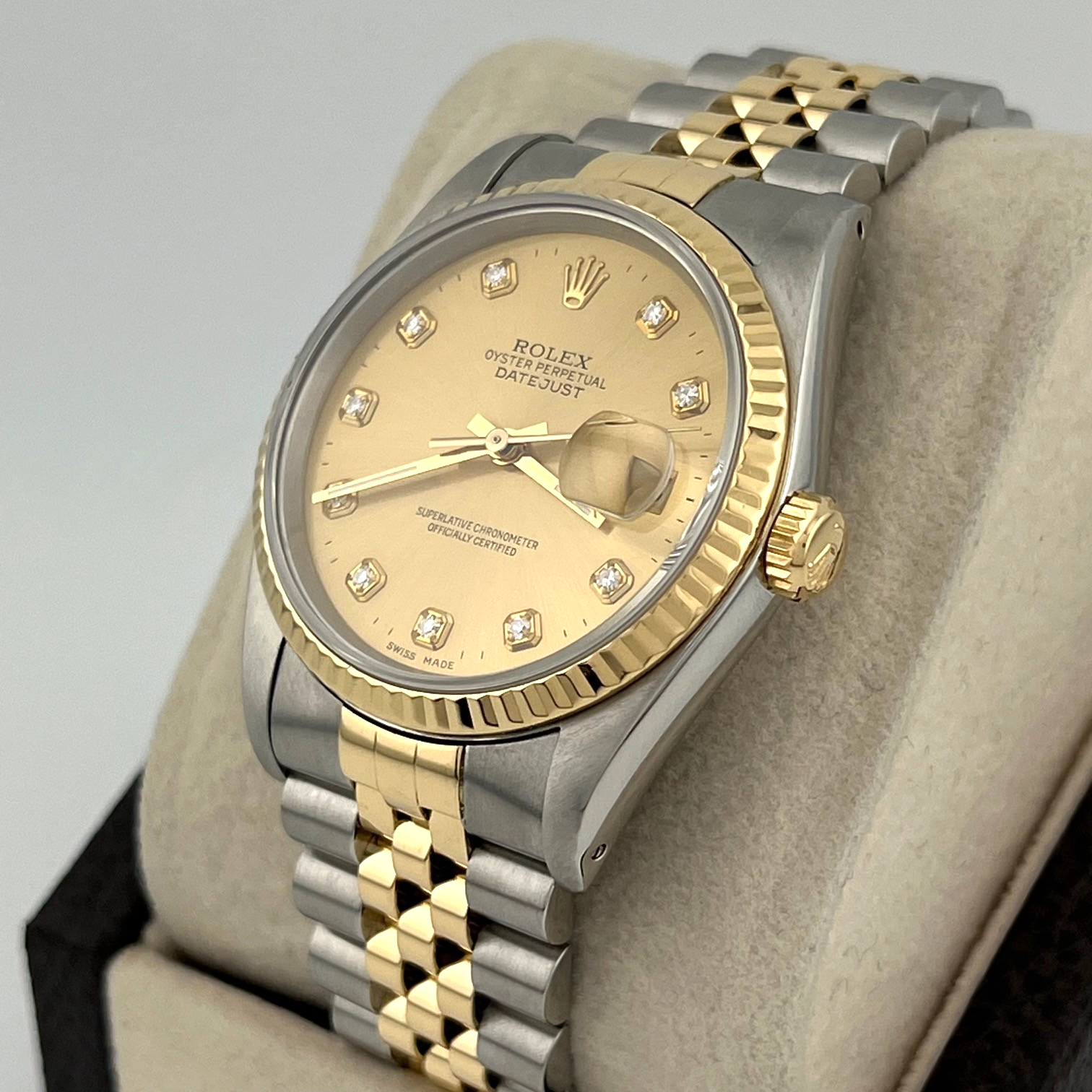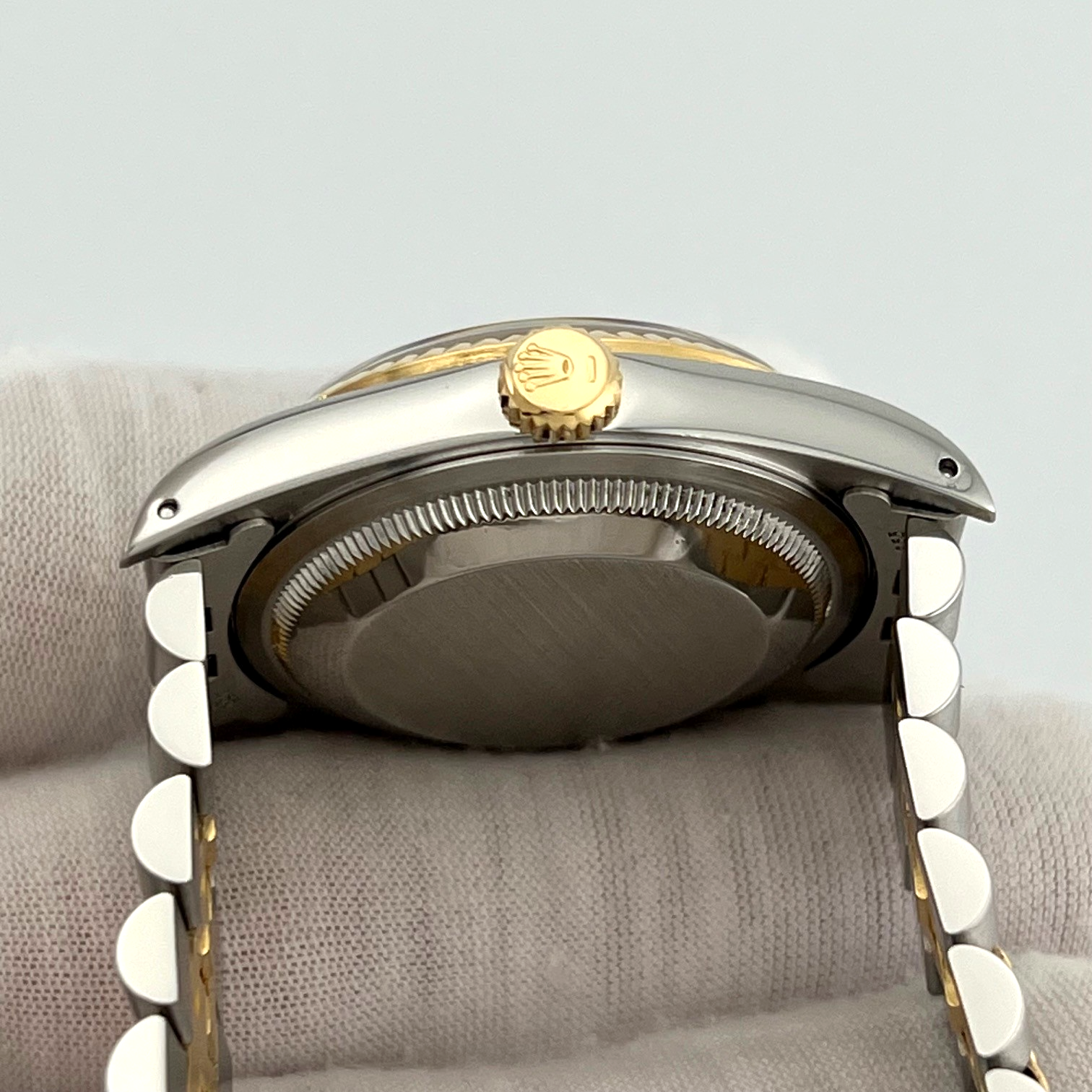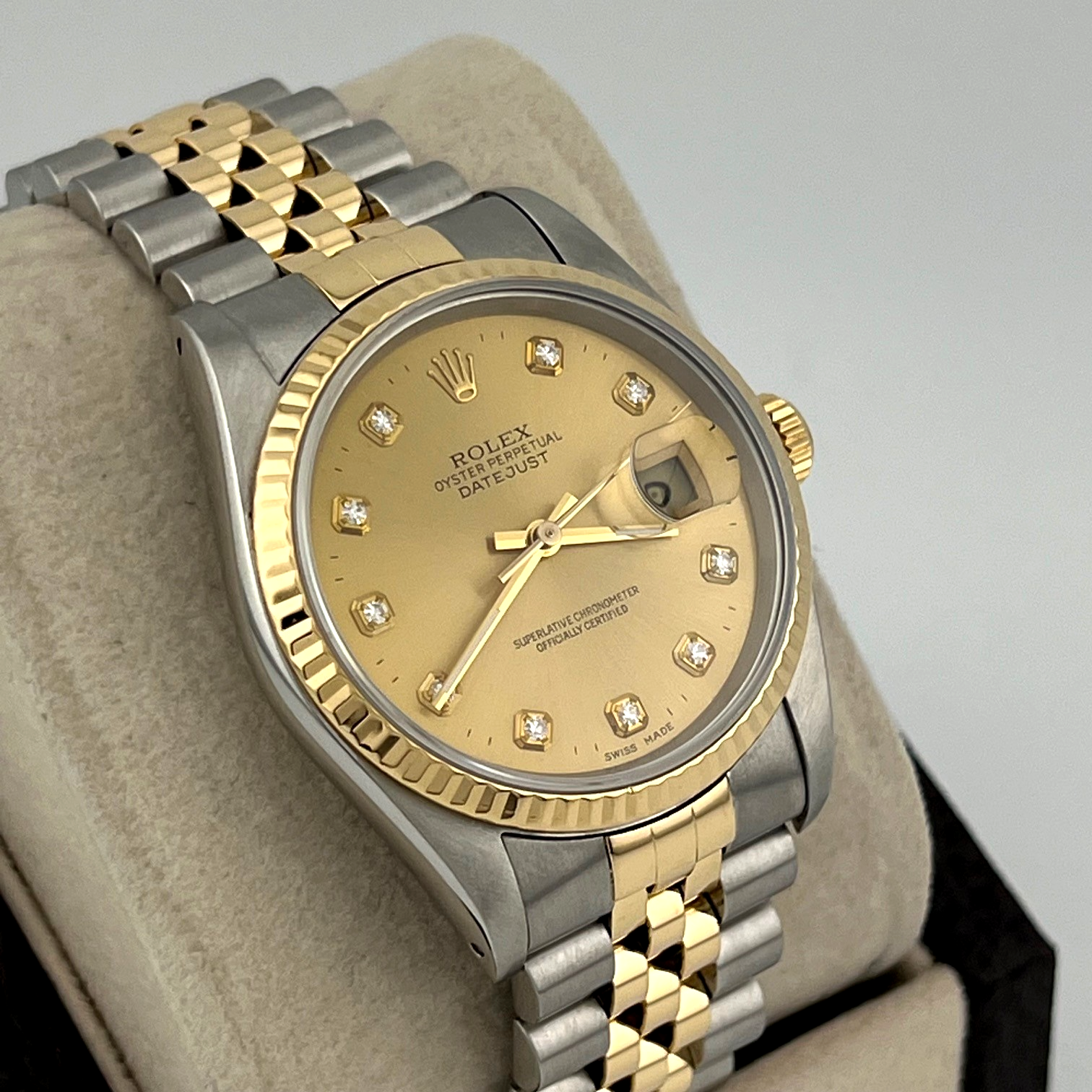 Rolex Datejust 16233 36mm Factory Champagne Diamond Dial 18k Gold Steel Rolex Sale! from 679500 /per This item is a recurring or deferred purchase. By continuing, I agree to the cancellation policy and authorize you to charge my payment method at the prices, frequency and dates listed on this page until my order is fulfilled or I cancel, if permitted. +1 (619) 232-1273 This item is currently on backorder but you can still purchase it now and we'll ship as soon as more become available. Style Number: 16233Serial: R73****Year: 1988 Model: Rolex Datejust Case Material: Stainless Steel Band: 18k Yellow Gold & Stainless Steel Jubilee Bezel: 18k Yellow Gold Fluted Dial: Factory Champagne Diamond Dial Crystal: Sapphire Case Size: 36mm Includes: - Elegant Watch Box- Certified Appraisal - 1 Year WarrantySKU 22912 / 114550TBJ081325