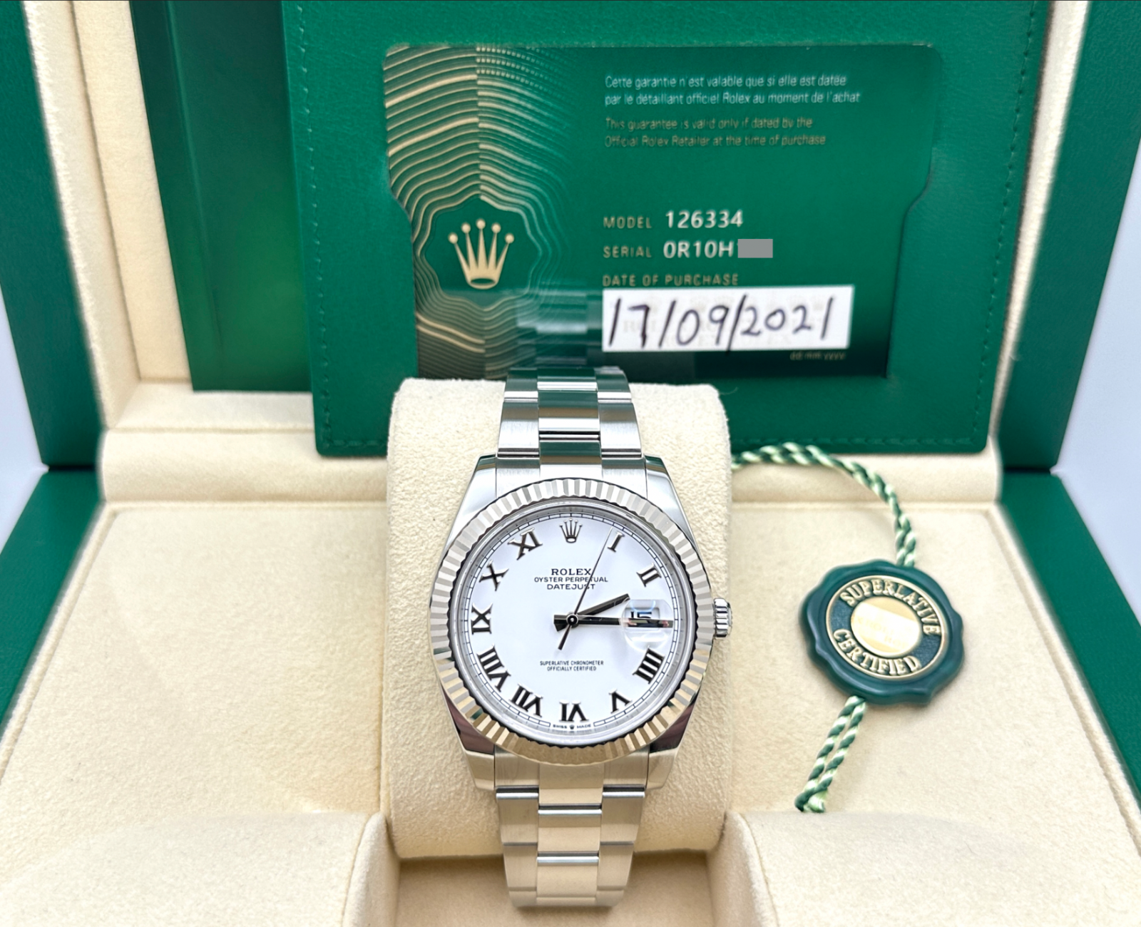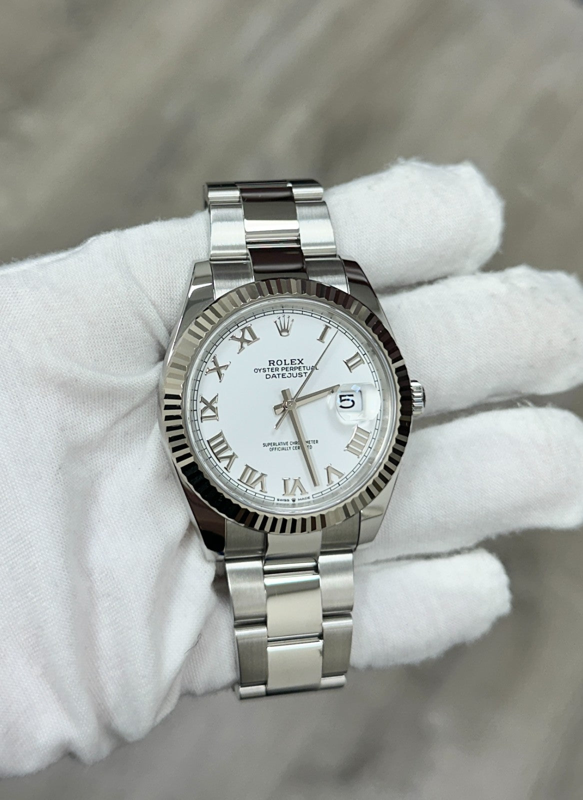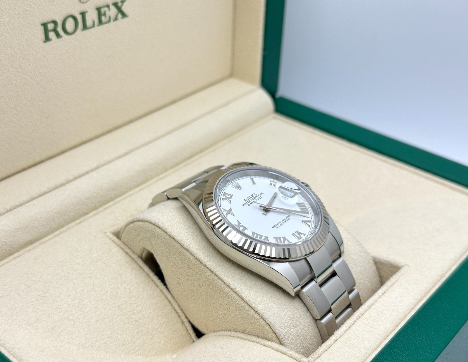 Rolex Datejust 41 126334 White Roman Dial 18k Gold Bezel Steel Box Paper 2021 Rolex Sale! from 1289500 /per This item is a recurring or deferred purchase. By continuing, I agree to the cancellation policy and authorize you to charge my payment method at the prices, frequency and dates listed on this page until my order is fulfilled or I cancel, if permitted. +1 (619) 232-1273 This item is currently on backorder but you can still purchase it now and we'll ship as soon as more become available. Style Number: 126334Serial: 0R10H***Year: 2021 Model: Rolex Datejust 41 Case Material: Stainless Steel Band: Stainless Steel Bezel: 18K White Gold Fluted Dial: White Roman Crystal: Sapphire Crystal Case Size: 41mm Includes: - Rolex Box & Paper- Certified Appraisal - One Year WarrantySKU 23559 / 133120TMF011226