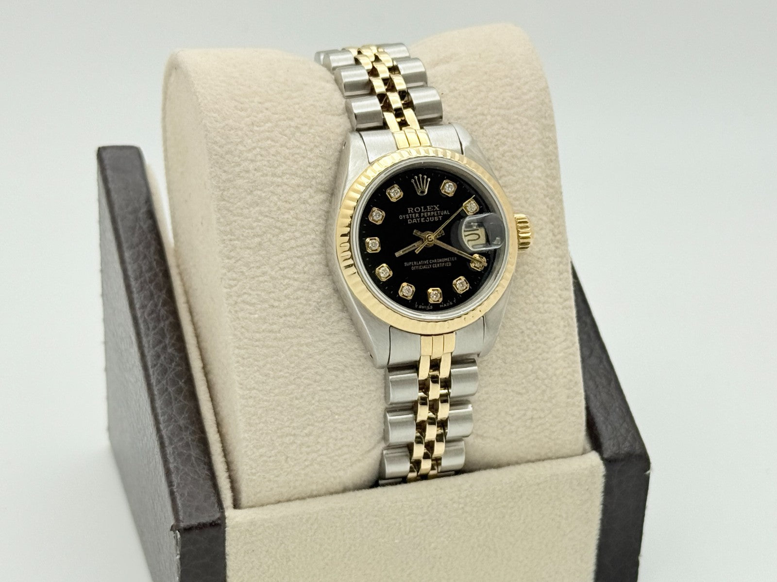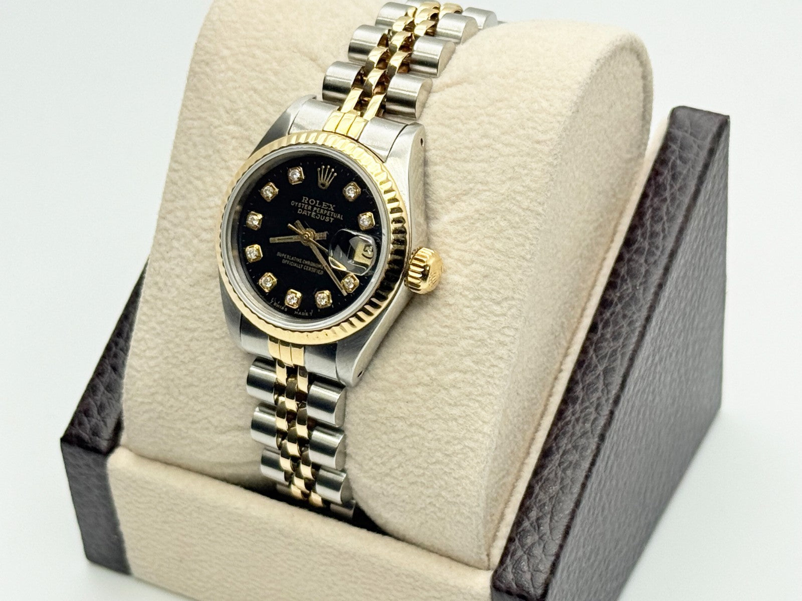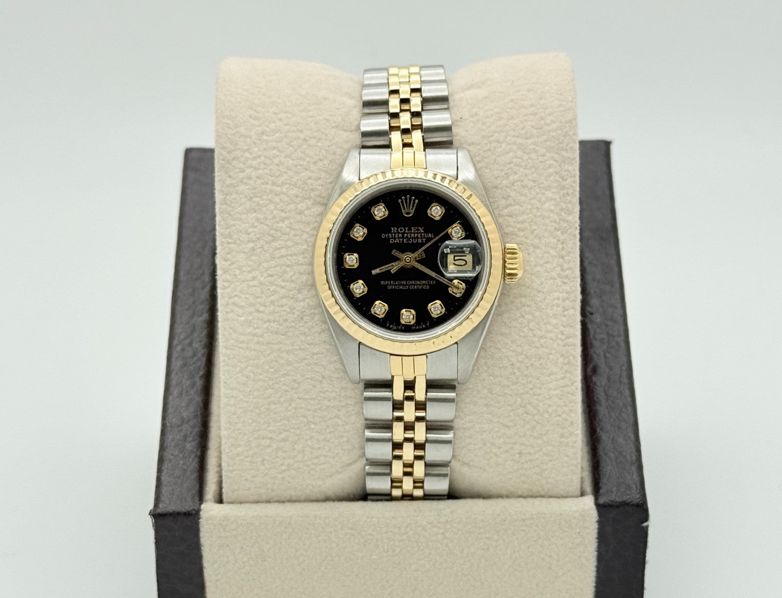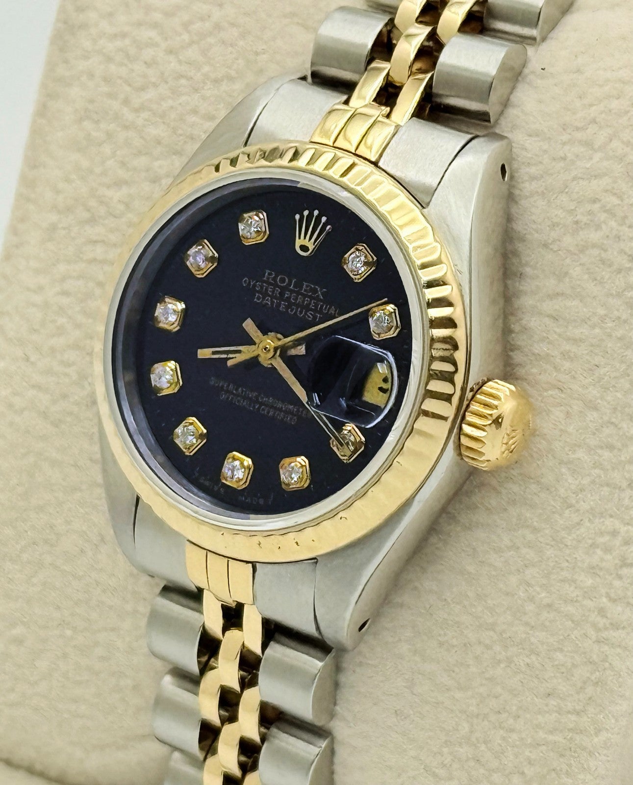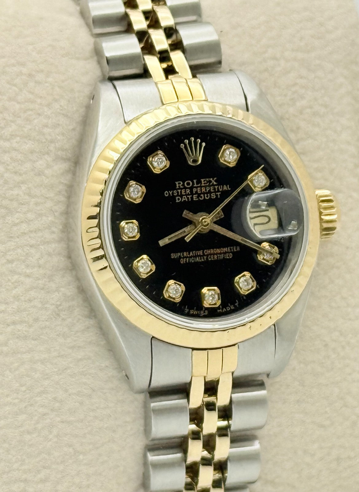 Rolex Datejust Ladies 69173 Black Diamond Dial 18k Yellow Gold Stainless Steel Rolex Sale! from 439500 /per This item is a recurring or deferred purchase. By continuing, I agree to the cancellation policy and authorize you to charge my payment method at the prices, frequency and dates listed on this page until my order is fulfilled or I cancel, if permitted. +1 (619) 232-1273 This item is currently on backorder but you can still purchase it now and we'll ship as soon as more become available. Style Number: 69173Serial: E84****Year: 1990 Model: Rolex Ladies Datejust Case Material: Stainless Steel Band: 18k Yellow Gold & Stainless Steel Jubilee Bezel: 18k Yellow Gold Fluted Dial: Custom Black Diamond Dial Crystal: Sapphire Crystal Case Size: 26mm Includes: - Elegant Watch Box- Certified Appraisal - 1 Year WarrantySKU 22248 / 16738TCF013025SF