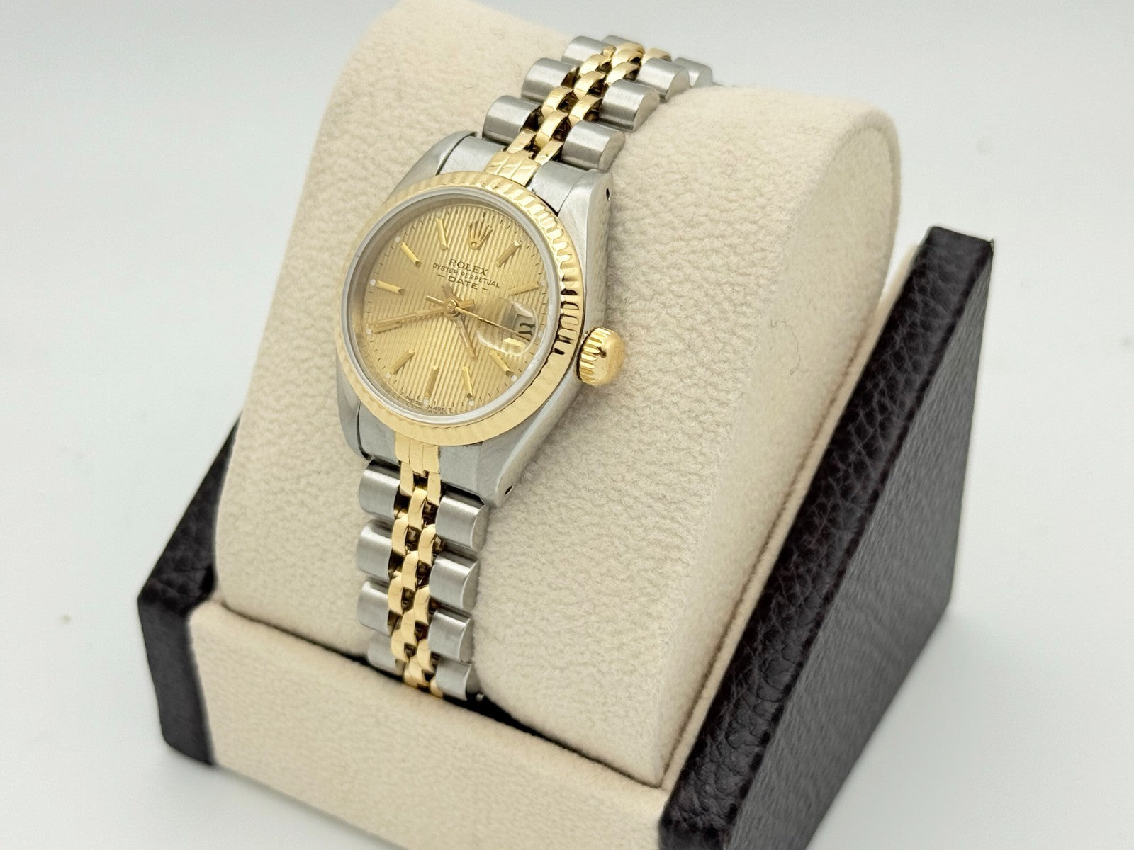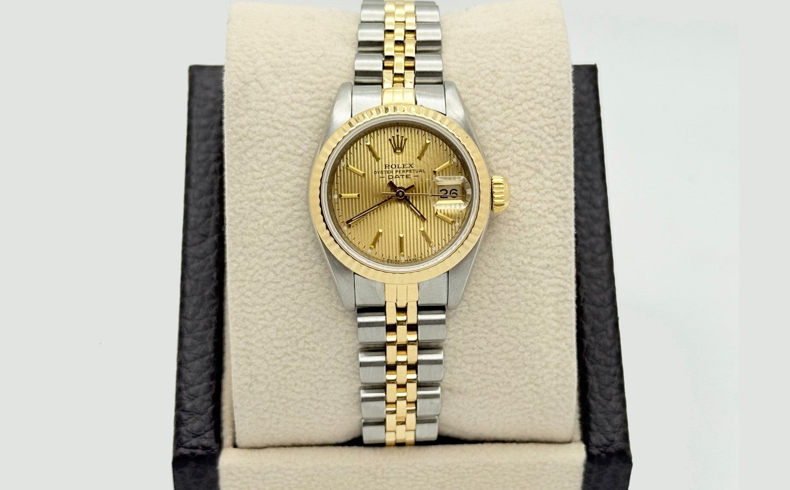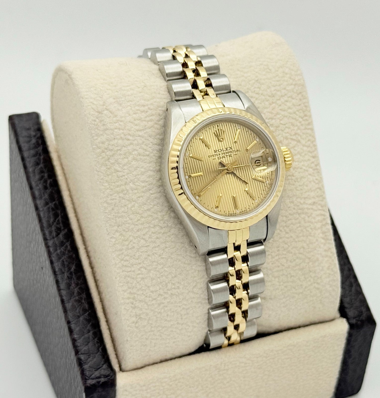 Rolex Datejust Ladies 69173 Champagne Tapestry Dial 18K Gold Stainless Steel Rolex Sale! from 469500 /per This item is a recurring or deferred purchase. By continuing, I agree to the cancellation policy and authorize you to charge my payment method at the prices, frequency and dates listed on this page until my order is fulfilled or I cancel, if permitted. +1 (619) 232-1273 This item is currently on backorder but you can still purchase it now and we'll ship as soon as more become available. Style Number: 69173Serial: 881****Year: 1985 Model: Rolex Ladies Datejust Case Material: Stainless Steel Band: 18k Yellow Gold & Stainless Steel Jubilee Bezel: 18k Yellow Gold Fluted Dial: Champagne Tapestry Crystal: Sapphire Crystal Case Size: 26mm Includes: - Elegant Watch Box- Certified Appraisal - 1 Year WarrantySKU 22429 / 14632T041025