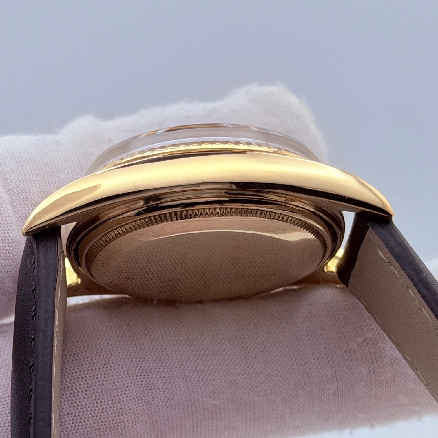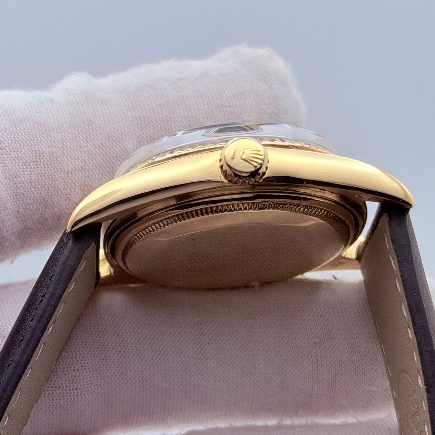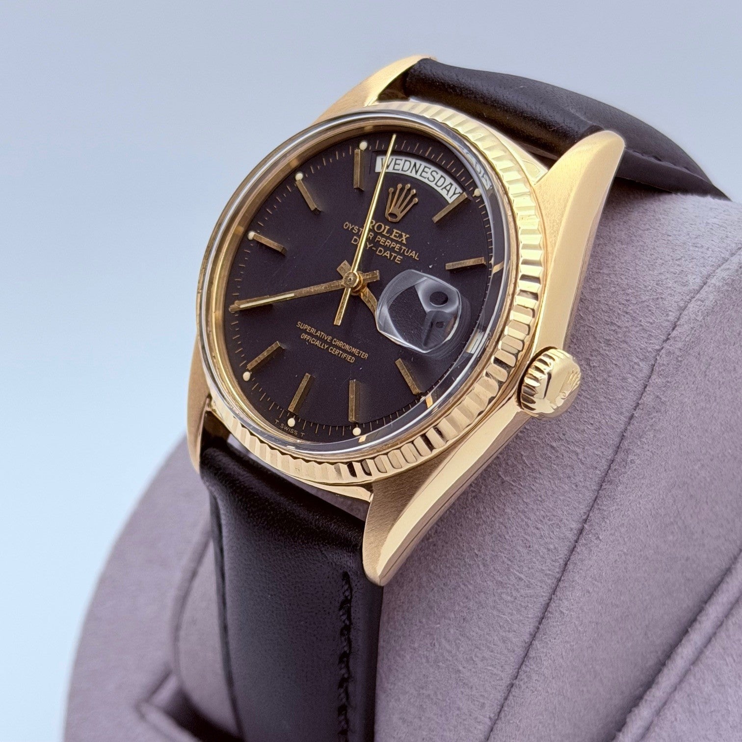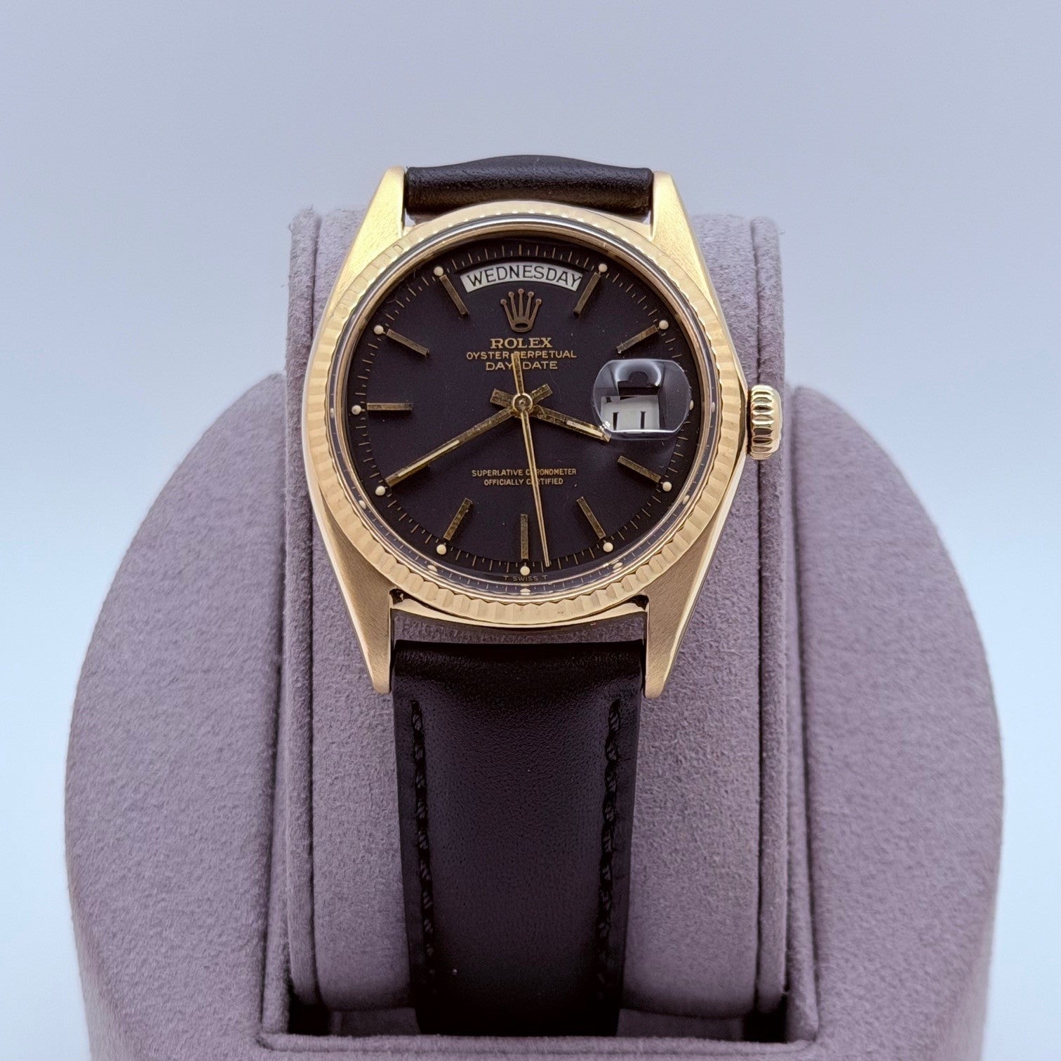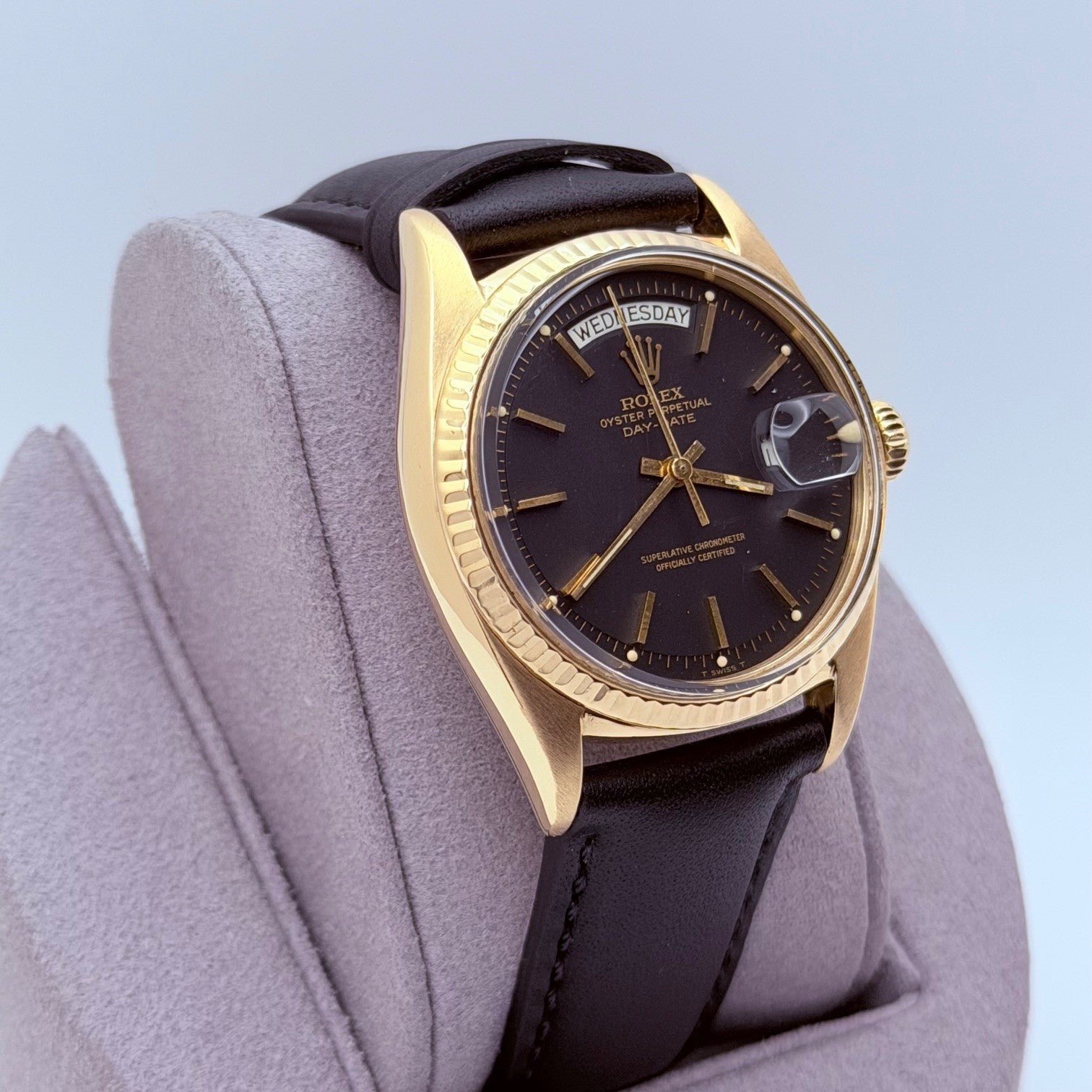 Rolex Day Date 1803 36mm Pie Pan Matte Black Dial 18k Yellow Gold Leather Strap