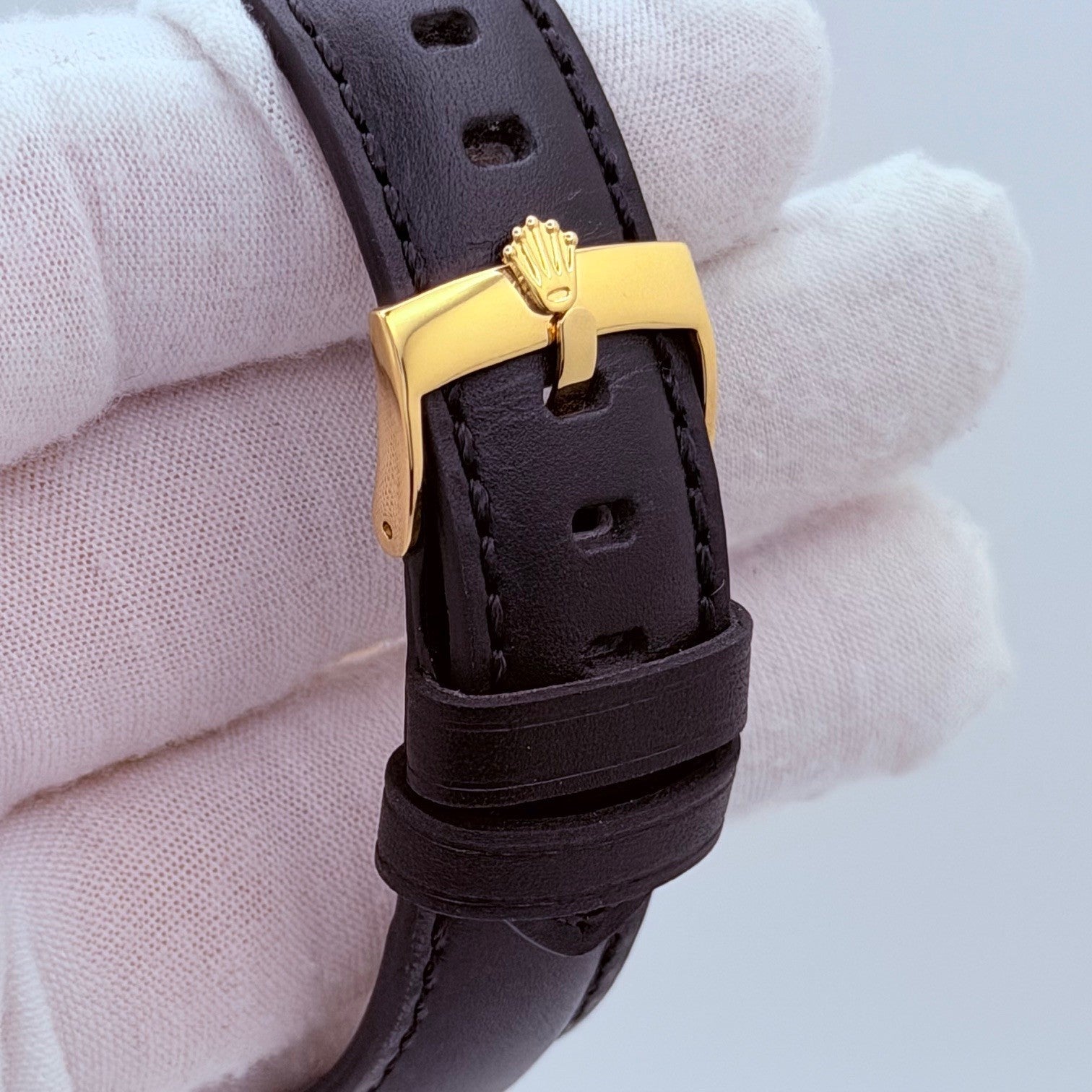 Band: Custom Black Leather Strap with Custom Gold-Plated Buckle