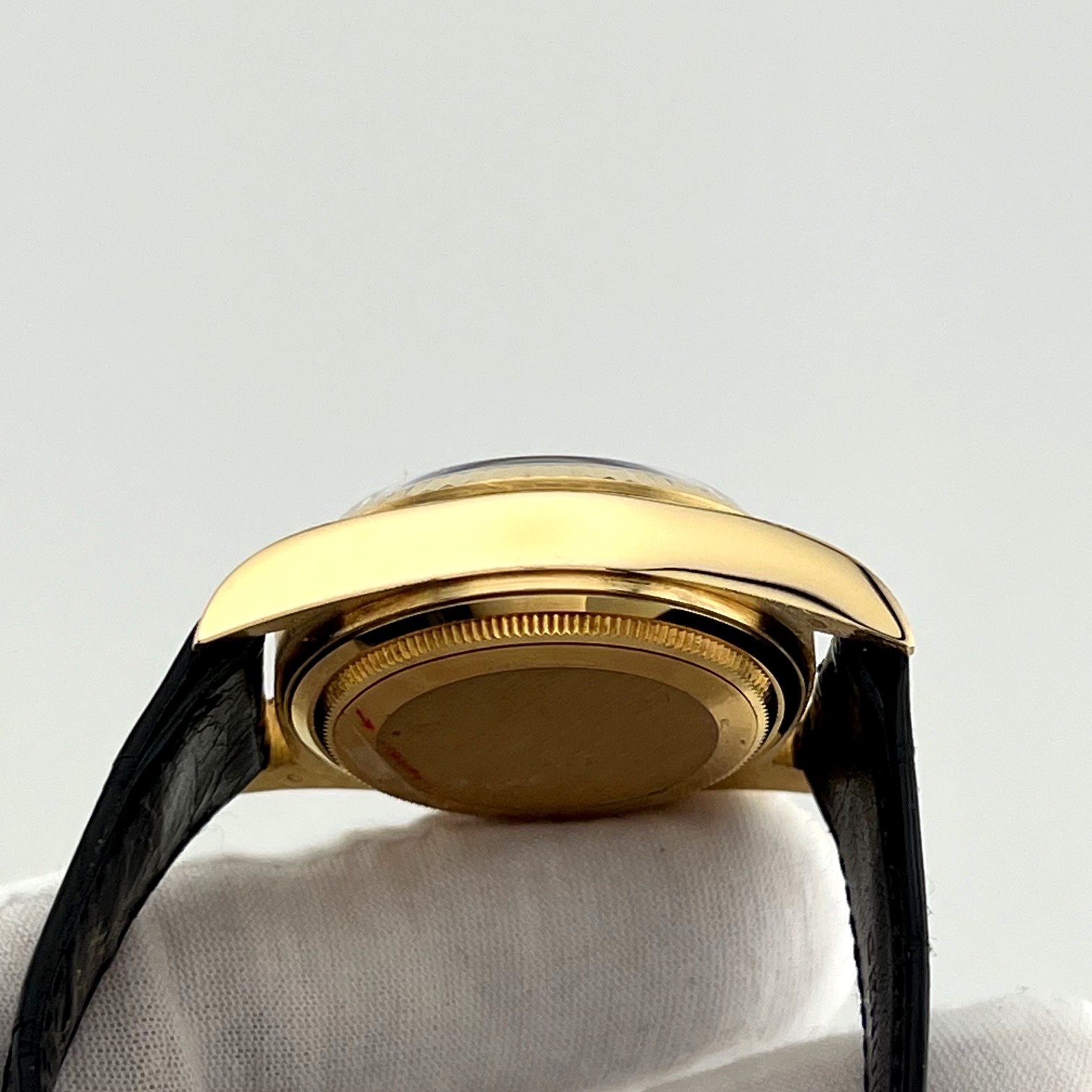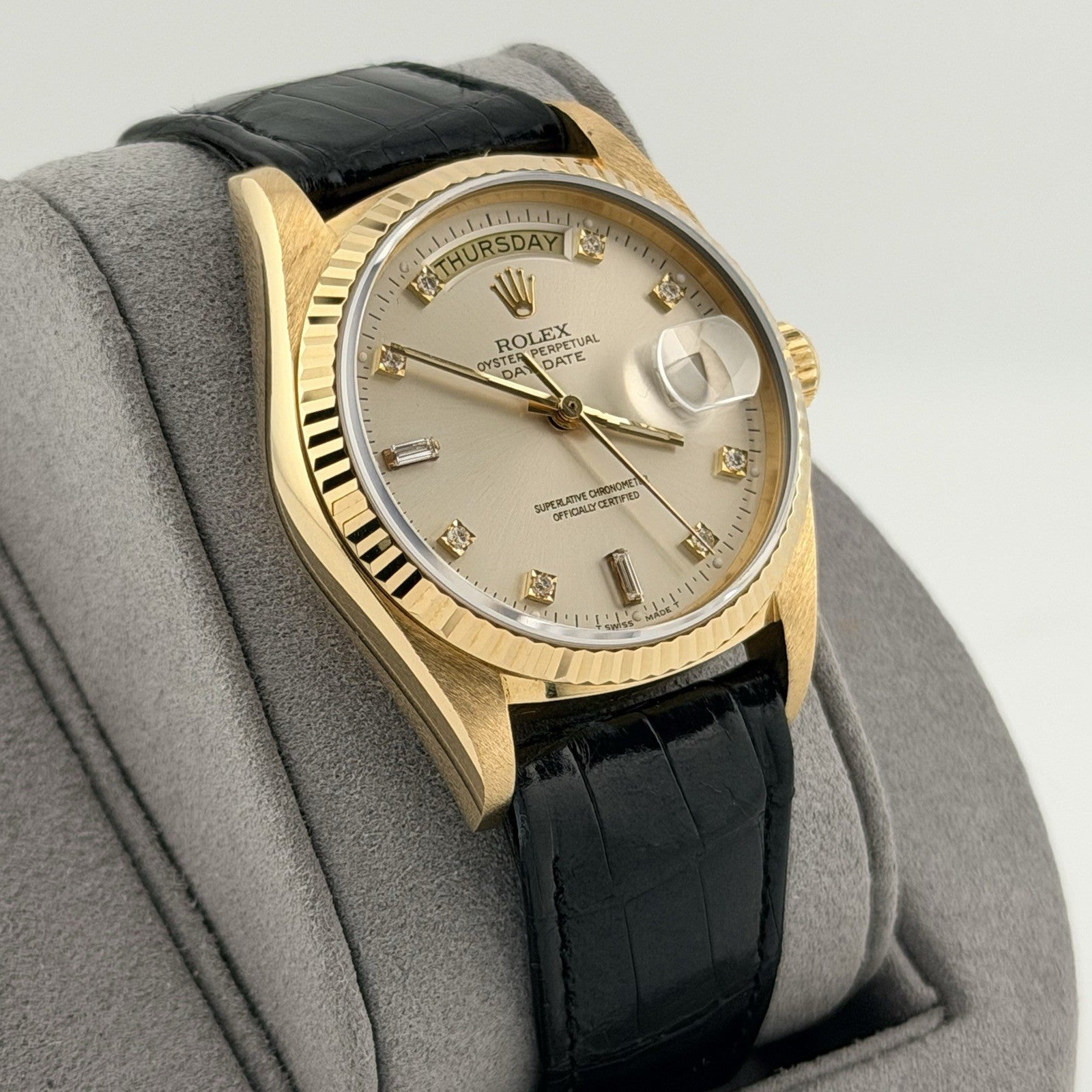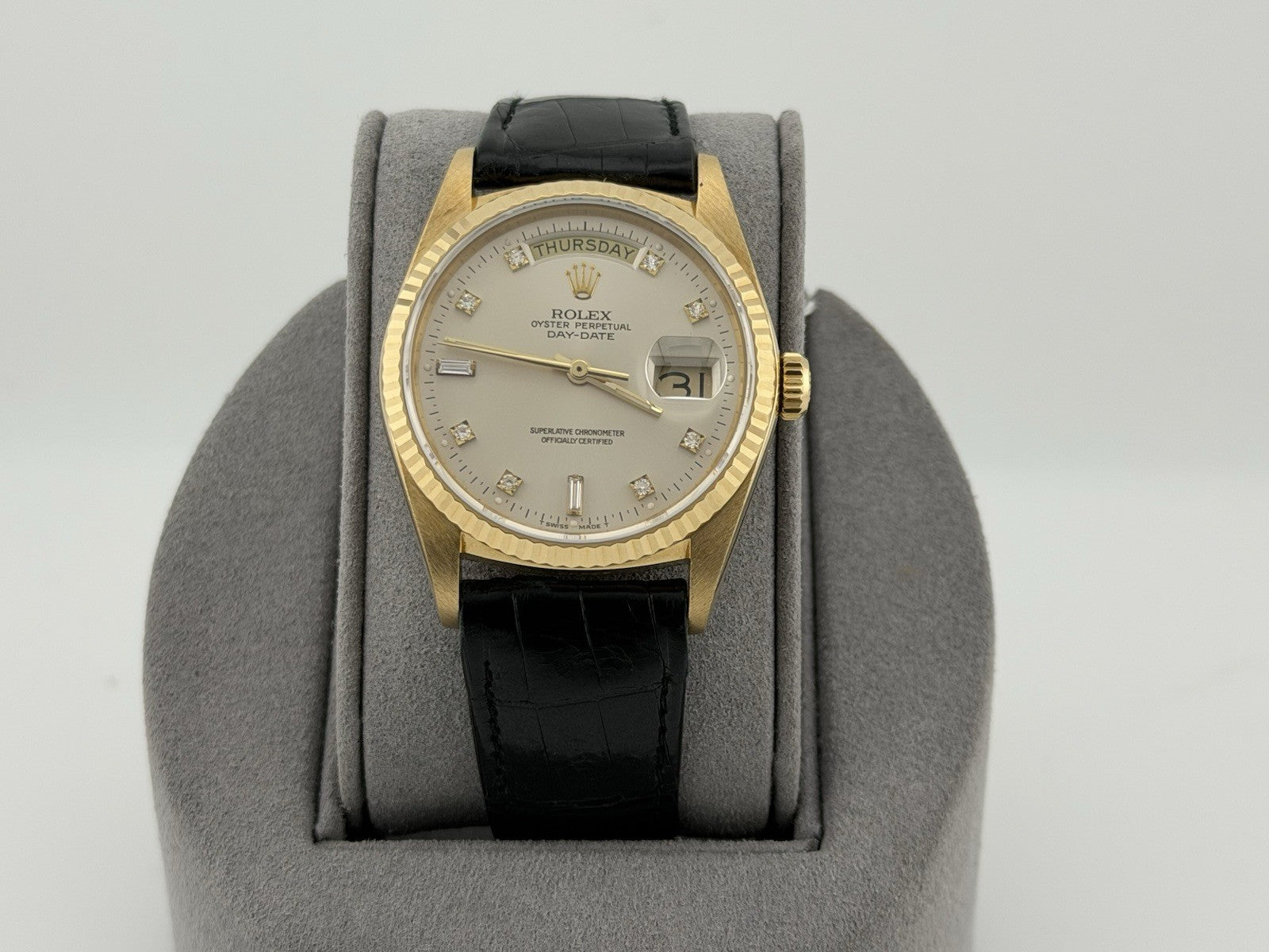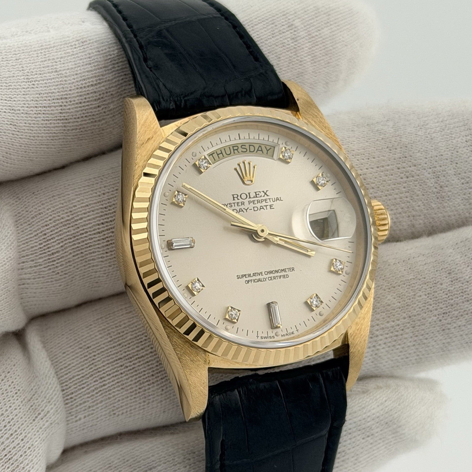 Rolex Day Date 18038 36mm Factory Diamond Dial and Leather Strap 18k Yellow Gold Rolex Sale! from 1299500 /per This item is a recurring or deferred purchase. By continuing, I agree to the cancellation policy and authorize you to charge my payment method at the prices, frequency and dates listed on this page until my order is fulfilled or I cancel, if permitted. +1 (619) 232-1273 This item is currently on backorder but you can still purchase it now and we'll ship as soon as more become available. Style Number: 18038Serial: 962****Year: 1987 Model: Rolex Day Date Case Material: 18k Yellow Gold Band: Factory Rolex Leather Strap & Clasp Bezel: 18k Yellow Gold Fluted Dial: Factory Silver Diamond Dial Crystal: Sapphire Case Size: 36mm Includes: - Elegant Watch Box- Certified Appraisal - 1 Year WarrantySKU 19619 / 123550TOFC