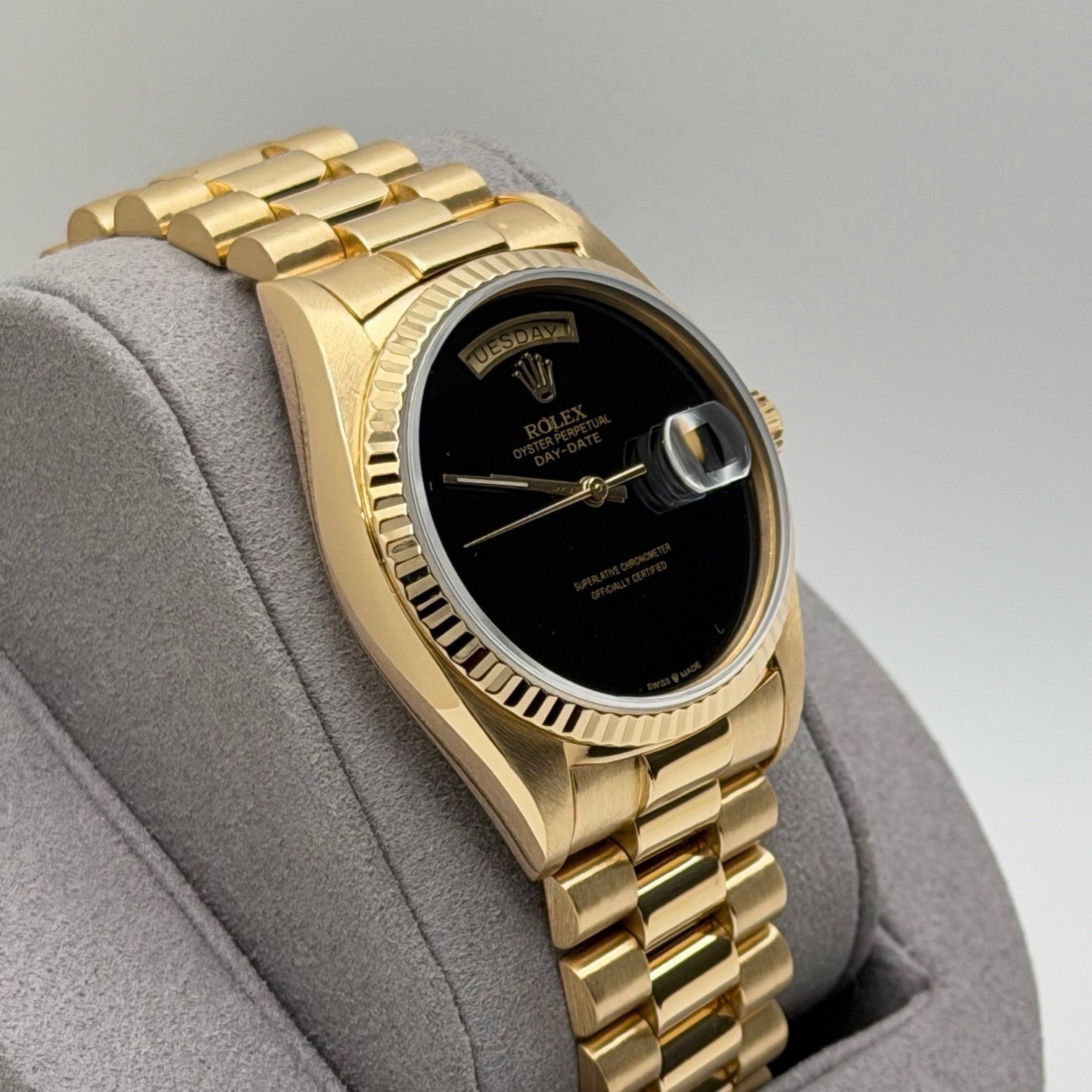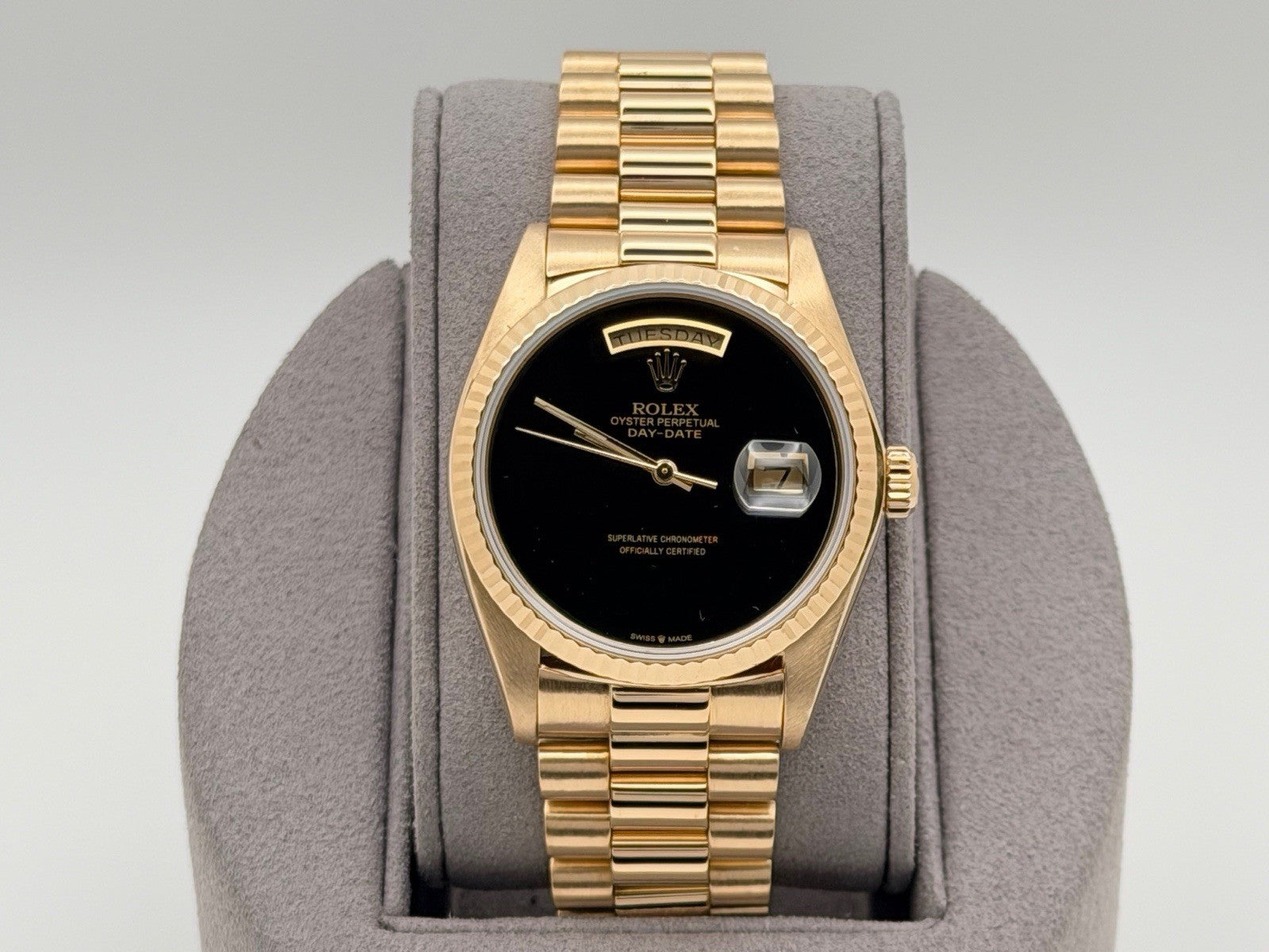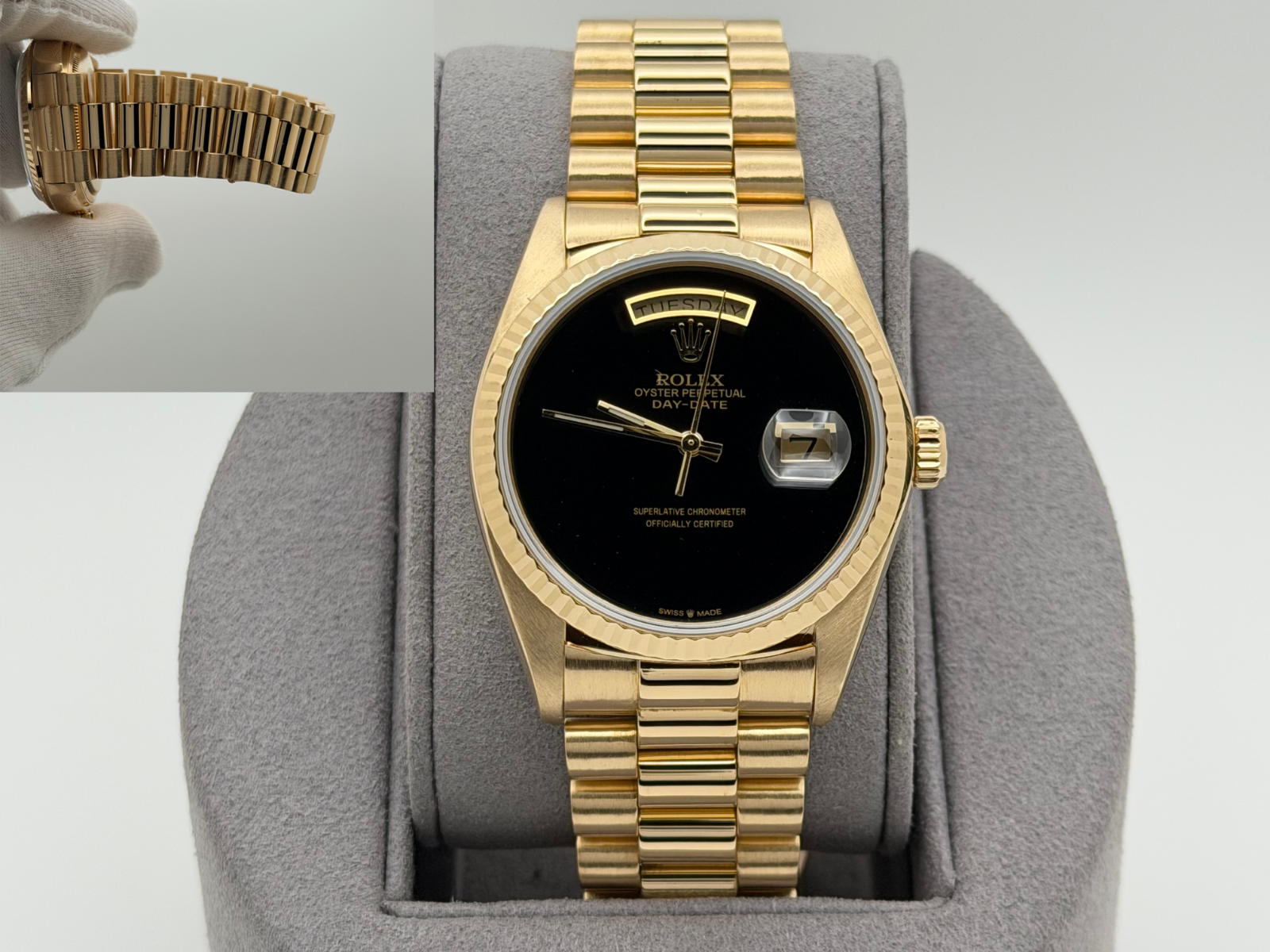 Rolex Day Date President 18038 36mm Black Onyx Dial Quickset 18K Yellow Gold Rolex Sale! from 1899500 /per This item is a recurring or deferred purchase. By continuing, I agree to the cancellation policy and authorize you to charge my payment method at the prices, frequency and dates listed on this page until my order is fulfilled or I cancel, if permitted. +1 (619) 232-1273 This item is currently on backorder but you can still purchase it now and we'll ship as soon as more become available. Style Number: 18038Serial: 674****Year: 1981 Model: Rolex Day-Date President Case Material: 18k Yellow Gold Band: 18k Yellow Gold President Bezel: 18k Yellow Gold Fluted Dial: Custom Black Onyx Crystal: Sapphire Case Size: 36mm Includes: - Elegant Watch Box- Certified Appraisal - 1 Year WarrantySKU 22612 / 126820TBJ060625