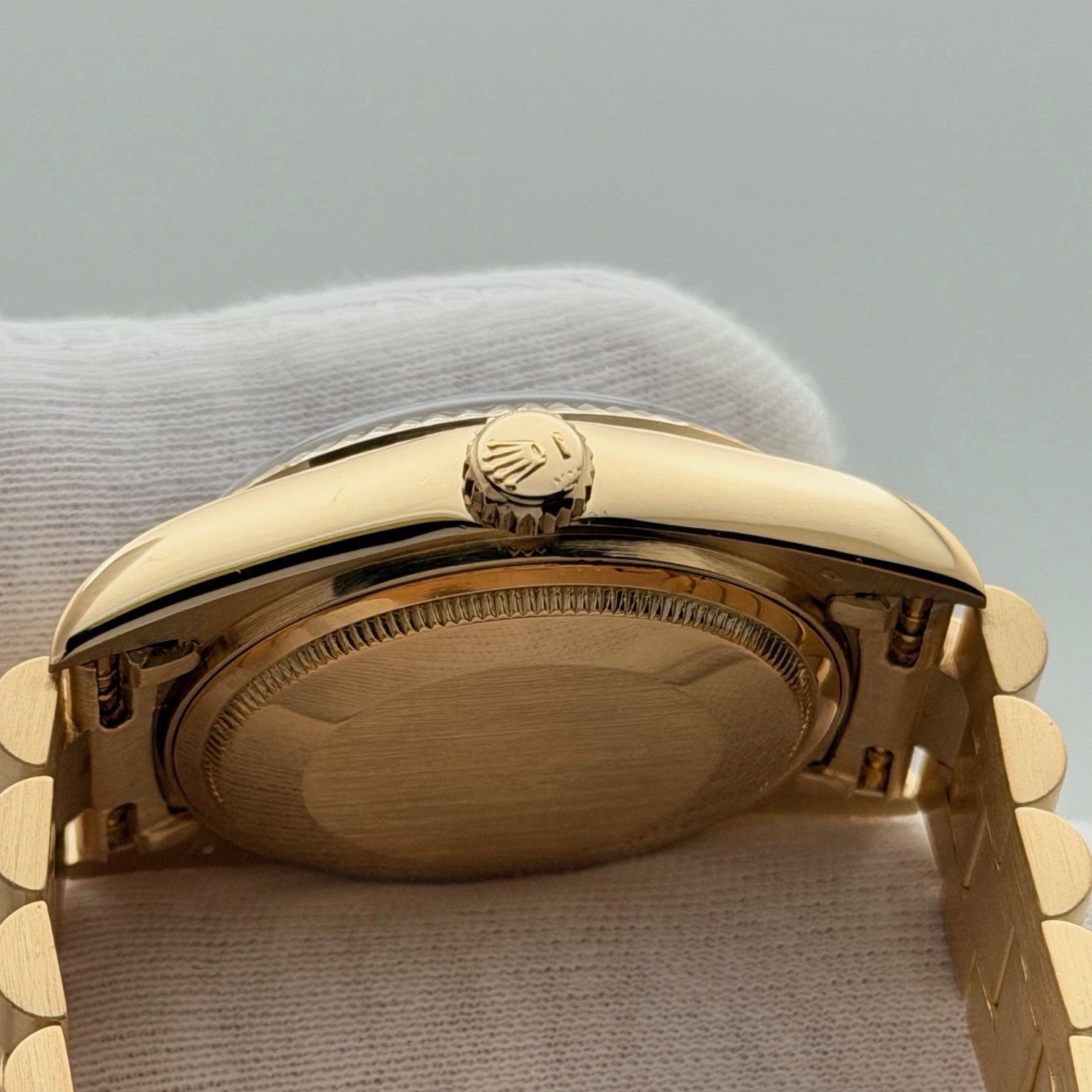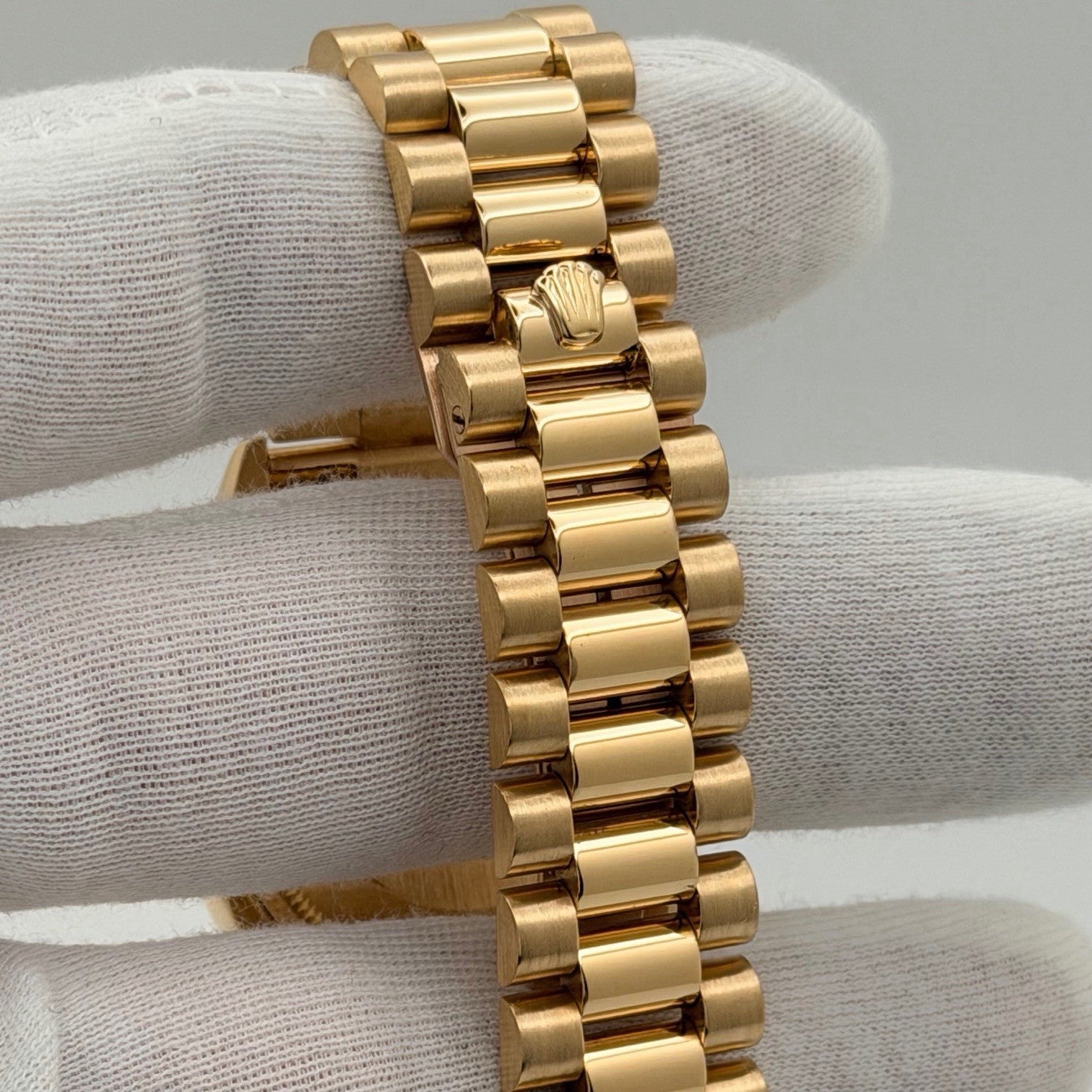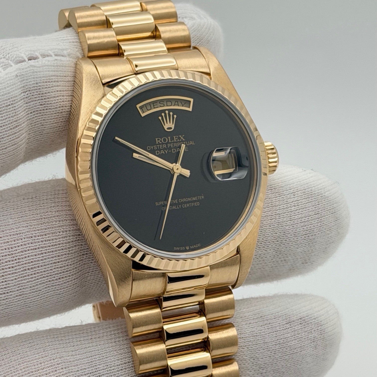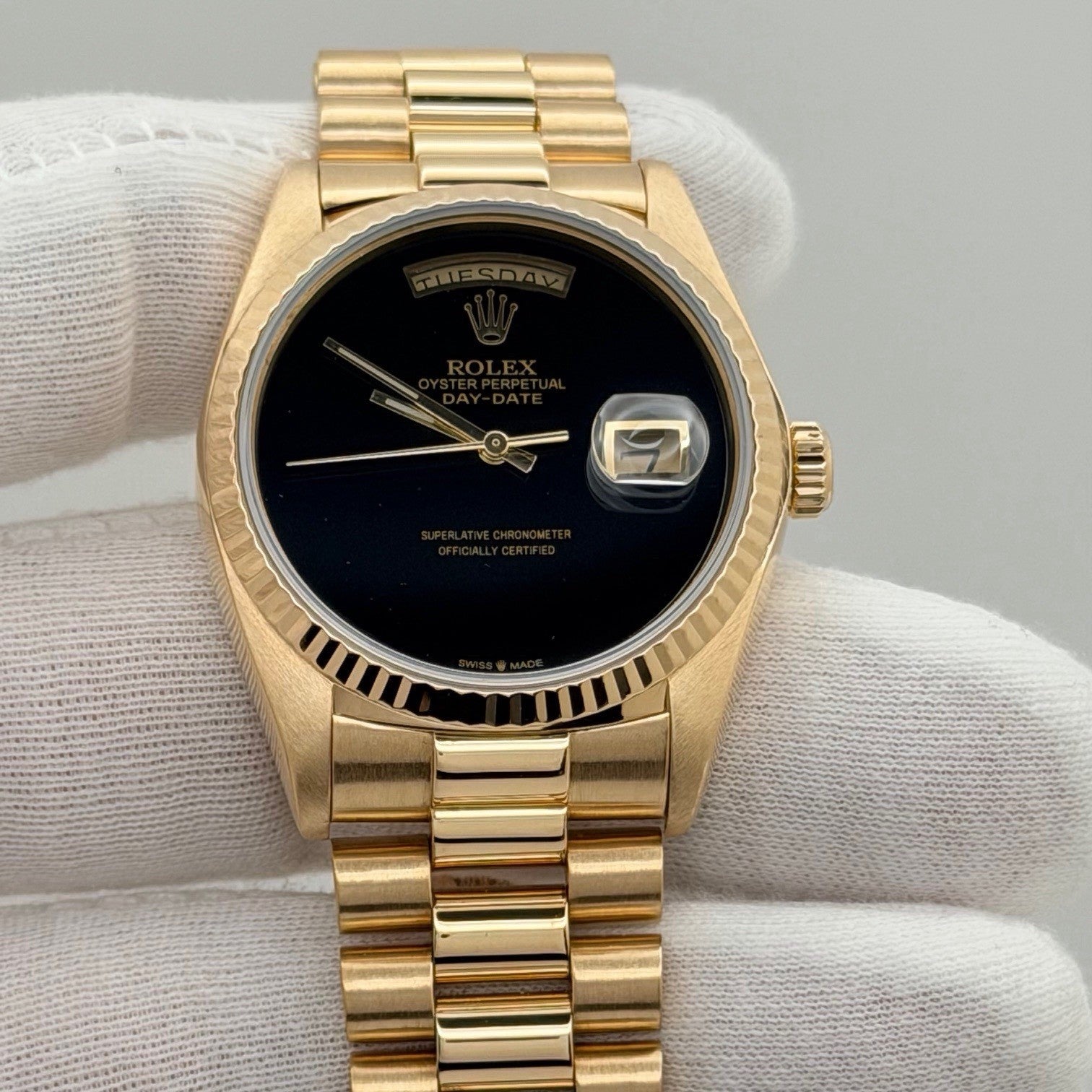 Rolex Day Date President 18038 36mm Black Onyx Dial Quickset 18K Yellow Gold Rolex Sale! from 1899500 /per This item is a recurring or deferred purchase. By continuing, I agree to the cancellation policy and authorize you to charge my payment method at the prices, frequency and dates listed on this page until my order is fulfilled or I cancel, if permitted. +1 (619) 232-1273 This item is currently on backorder but you can still purchase it now and we'll ship as soon as more become available. Style Number: 18038Serial: 674****Year: 1981 Model: Rolex Day-Date President Case Material: 18k Yellow Gold Band: 18k Yellow Gold President Bezel: 18k Yellow Gold Fluted Dial: Custom Black Onyx Crystal: Sapphire Case Size: 36mm Includes: - Elegant Watch Box- Certified Appraisal - 1 Year WarrantySKU 22612 / 126820TBJ060625