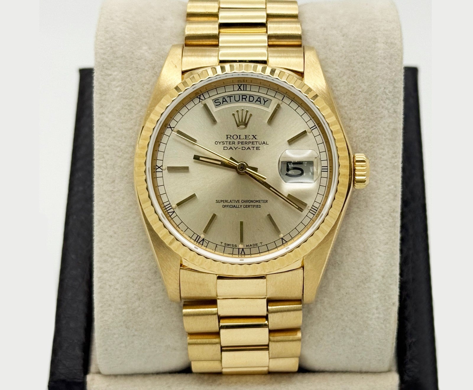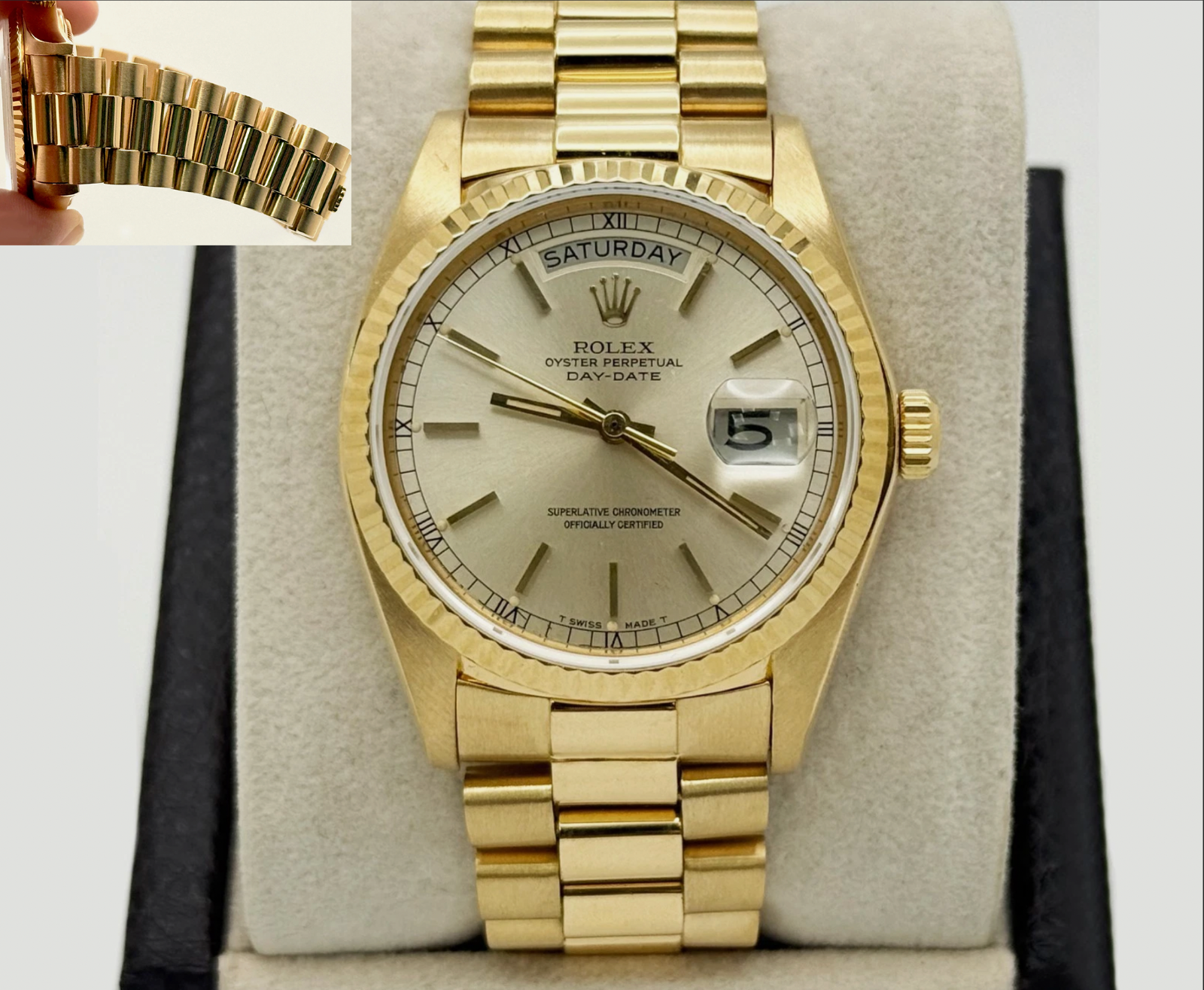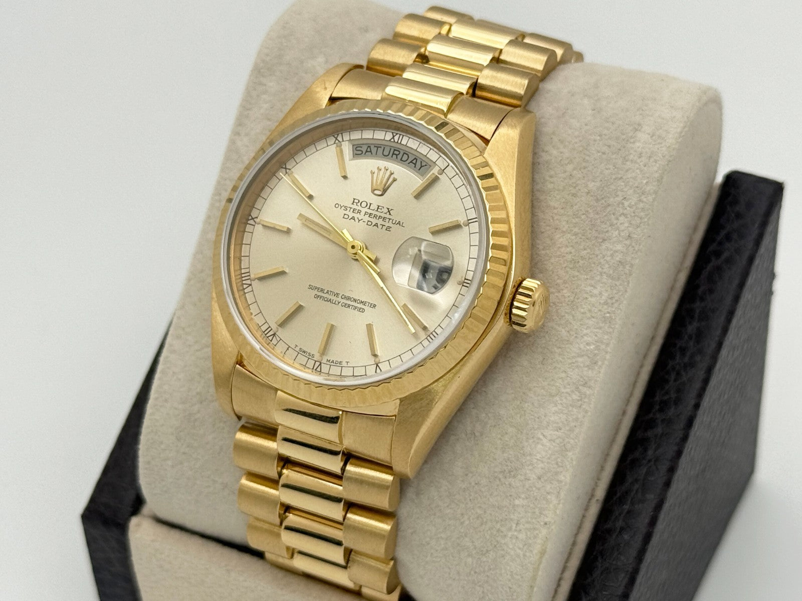 Rolex Day Date President 18038 36mm Champagne Dial 18K Yellow Gold Rolex Sale! from 1699500 /per This item is a recurring or deferred purchase. By continuing, I agree to the cancellation policy and authorize you to charge my payment method at the prices, frequency and dates listed on this page until my order is fulfilled or I cancel, if permitted. +1 (619) 232-1273 This item is currently on backorder but you can still purchase it now and we'll ship as soon as more become available. Style Number: 18038Serial: 619****Year: 1979 Model: Rolex President Day Date Case Material: 18K Yellow Gold Band: 18K Yellow Gold President Bezel: 18K Yellow Gold Dial: Champagne Dial Crystal: Sapphire Crystal Case Size: 36mm Includes: - Elegant Watch Box- Certified Appraisal - 1 Year WarrantySKU 22538 / 136300TJD051525SF