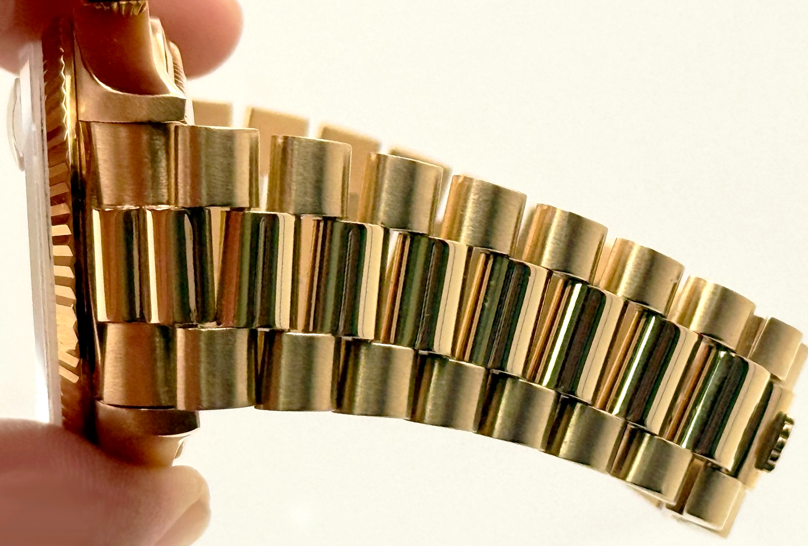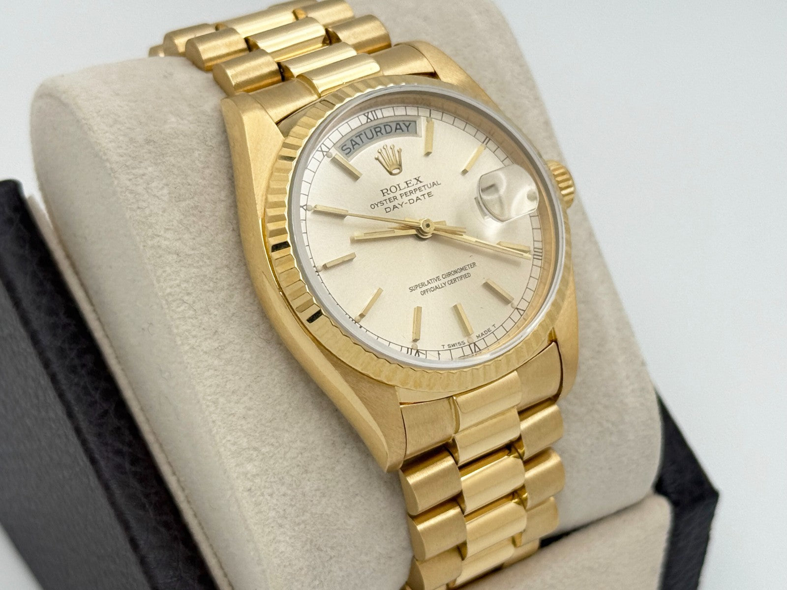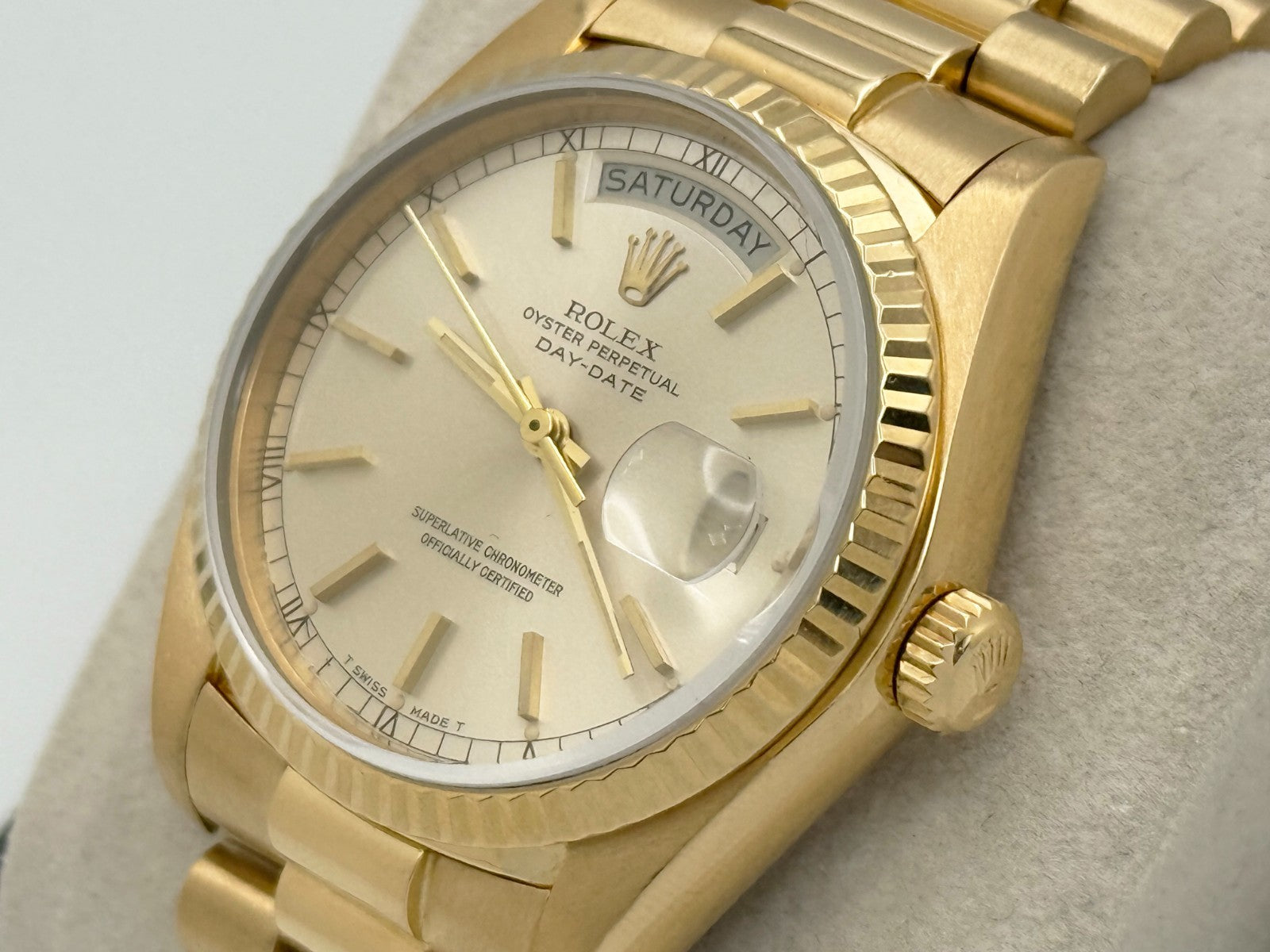 Rolex Day Date President 18038 36mm Champagne Dial 18K Yellow Gold Rolex Sale! from 1699500 /per This item is a recurring or deferred purchase. By continuing, I agree to the cancellation policy and authorize you to charge my payment method at the prices, frequency and dates listed on this page until my order is fulfilled or I cancel, if permitted. +1 (619) 232-1273 This item is currently on backorder but you can still purchase it now and we'll ship as soon as more become available. Style Number: 18038Serial: 619****Year: 1979 Model: Rolex President Day Date Case Material: 18K Yellow Gold Band: 18K Yellow Gold President Bezel: 18K Yellow Gold Dial: Champagne Dial Crystal: Sapphire Crystal Case Size: 36mm Includes: - Elegant Watch Box- Certified Appraisal - 1 Year WarrantySKU 22538 / 136300TJD051525SF