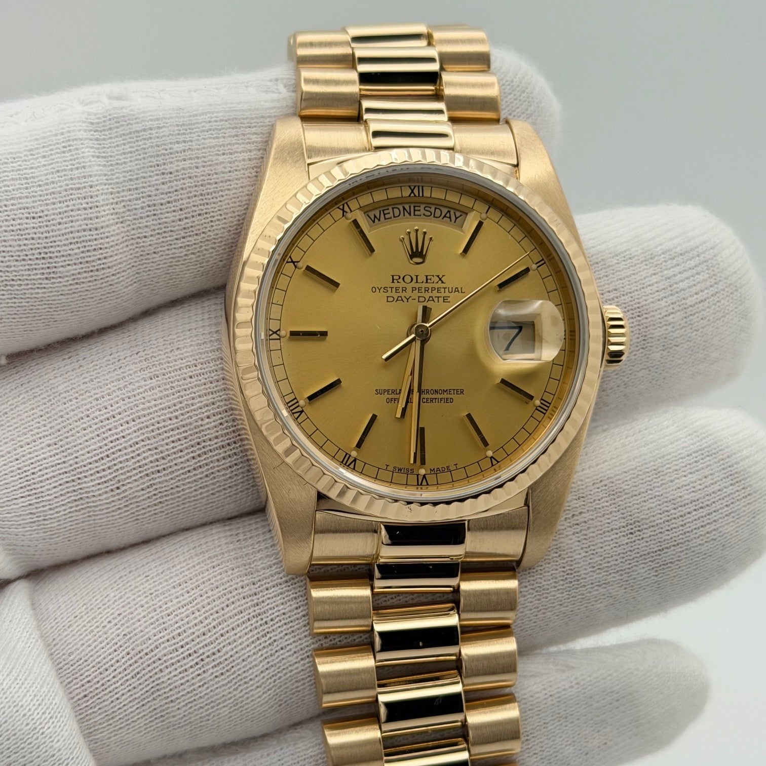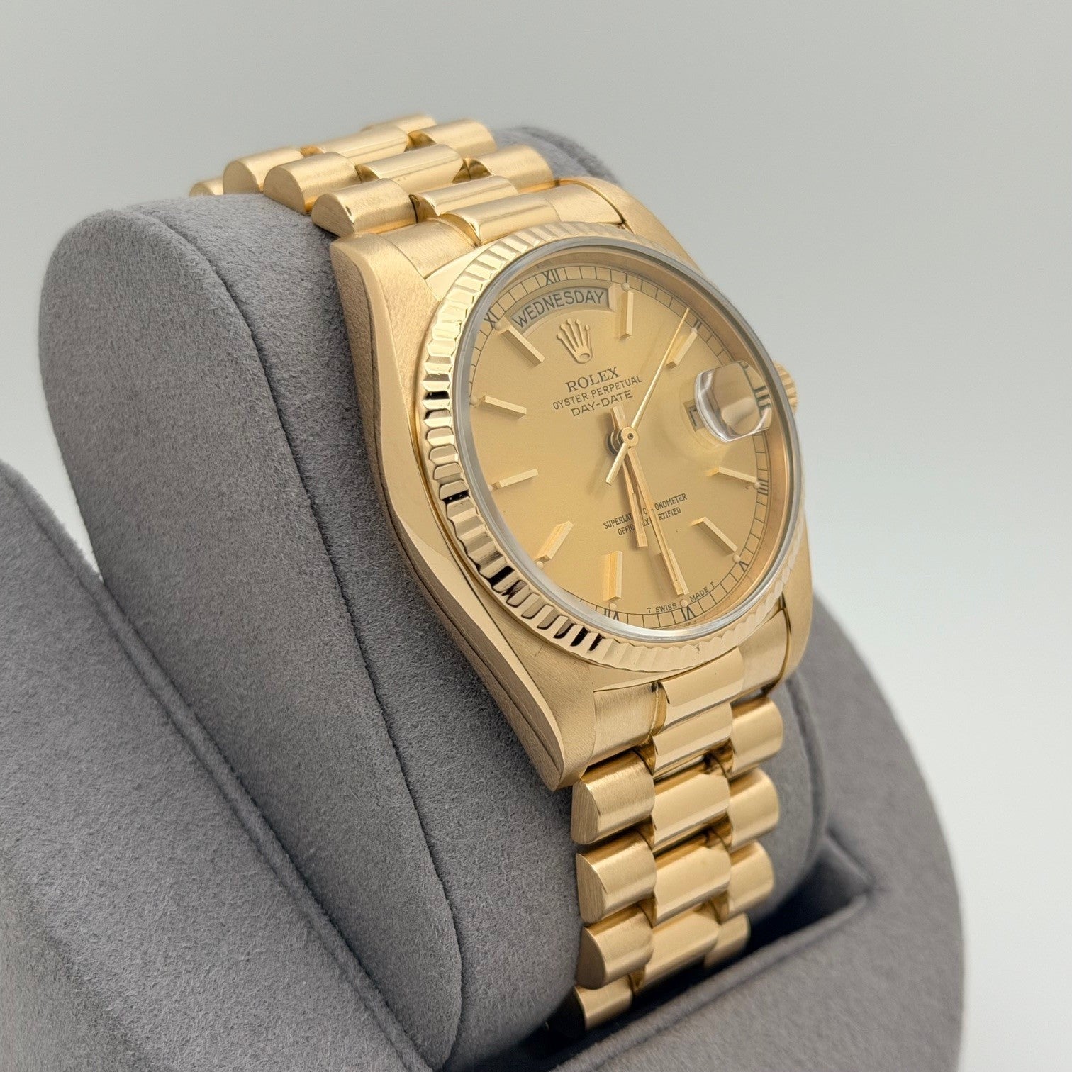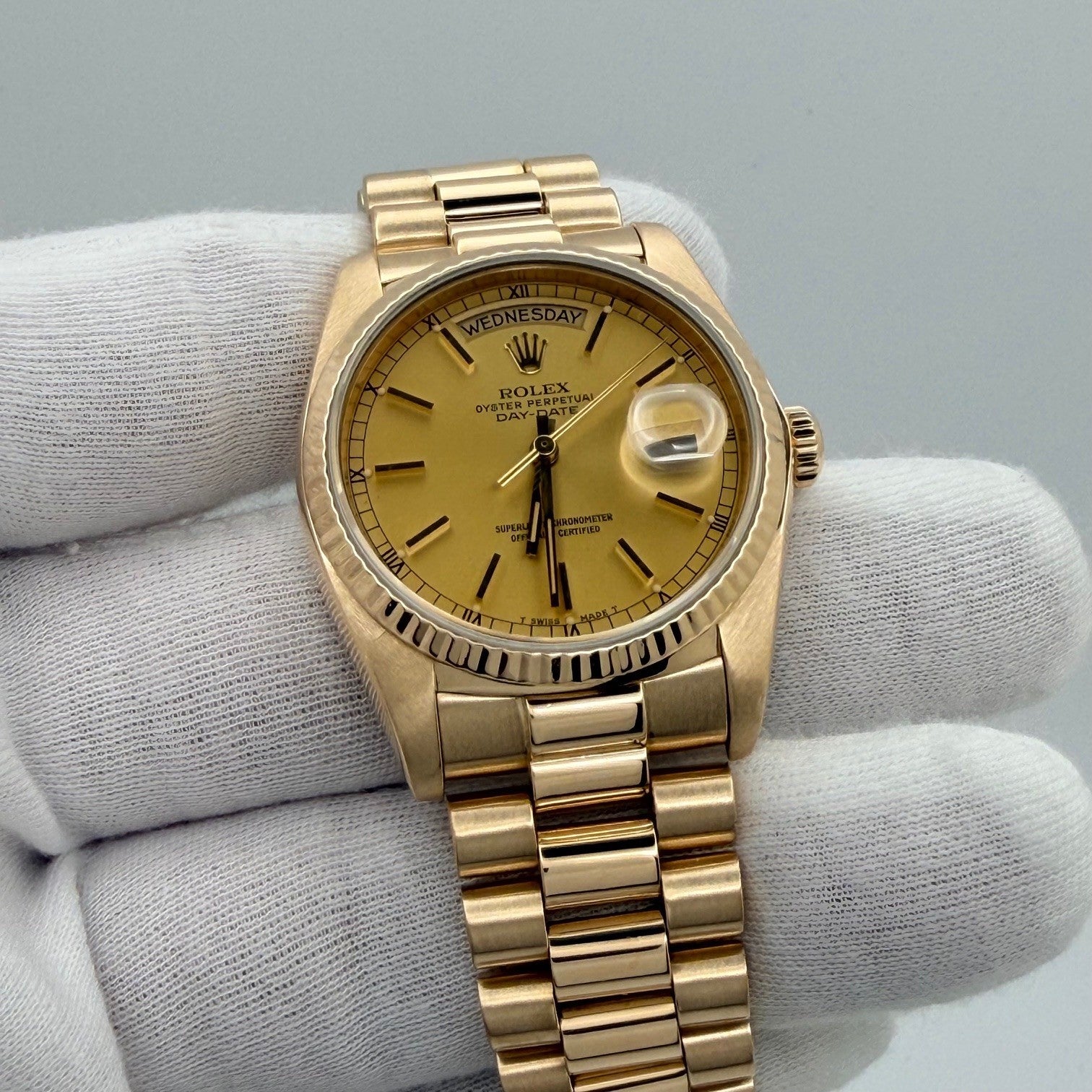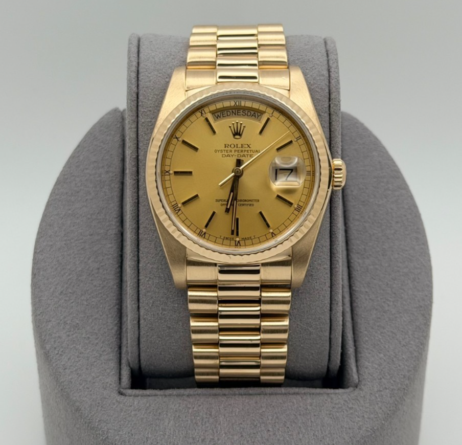 Rolex Day Date President 18038 36mm Champagne Dial Quickset 18K Yellow Gold Rolex Sale! from 1699500 /per This item is a recurring or deferred purchase. By continuing, I agree to the cancellation policy and authorize you to charge my payment method at the prices, frequency and dates listed on this page until my order is fulfilled or I cancel, if permitted. +1 (619) 232-1273 This item is currently on backorder but you can still purchase it now and we'll ship as soon as more become available. Style Number: 18038Serial: 820****Year: 1984 Model: Rolex President Day Date Case Material: 18k Yellow Gold Band: 18k Yellow Gold President Bezel: 18k Yellow Gold Fluted Dial: Champagne Dial Crystal: Sapphire Case Size: 36mm Includes: - Elegant Watch Box- Certified Appraisal - 1 Year WarrantySKU 23305 / 138175TOFC111225