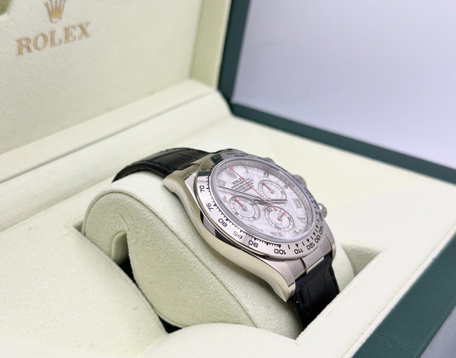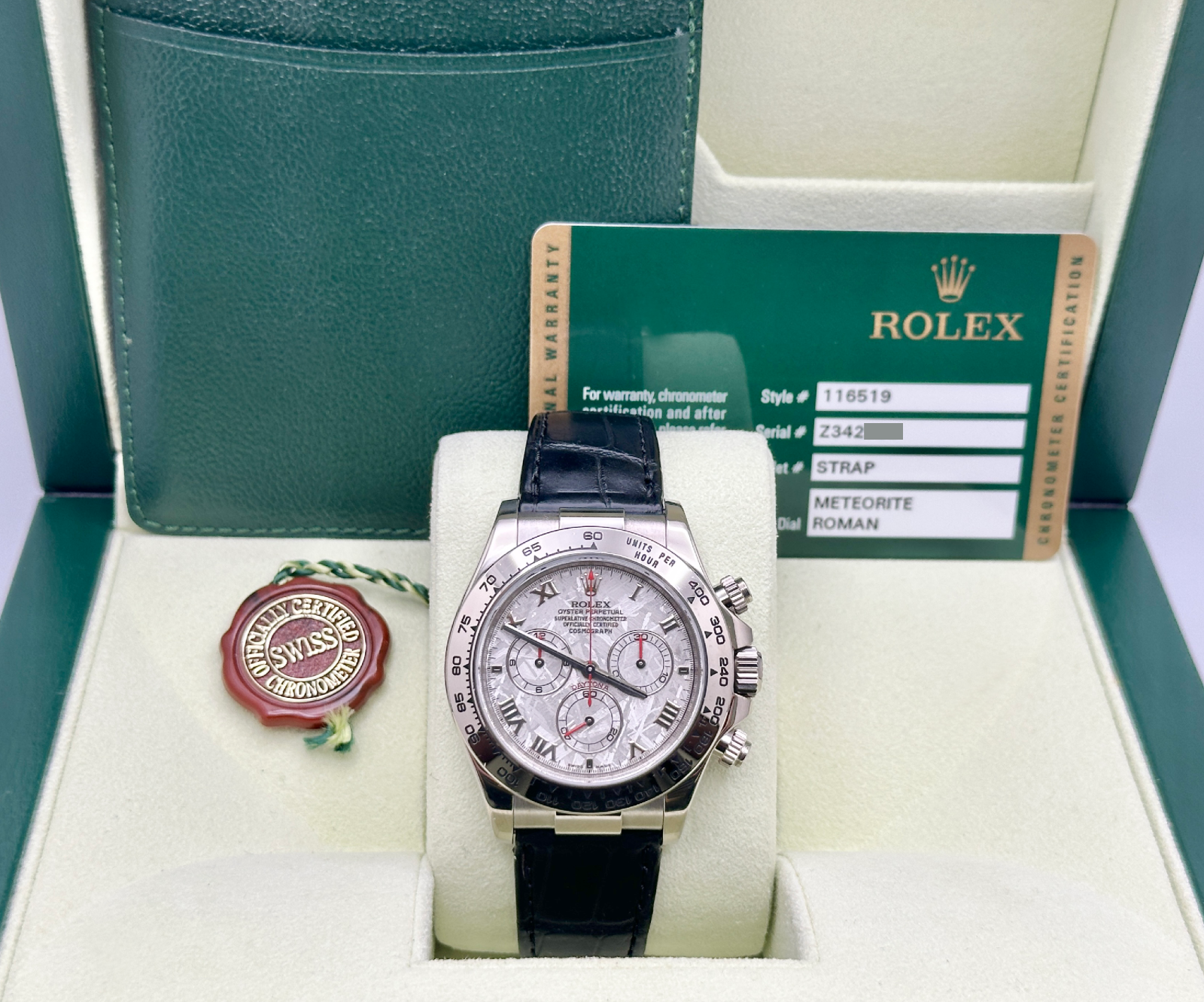 Rolex Daytona Cosmograph Meteorite Dial 116519 40mm 18k White Gold Box Paper Rolex Sale! from 4699500 /per This item is a recurring or deferred purchase. By continuing, I agree to the cancellation policy and authorize you to charge my payment method at the prices, frequency and dates listed on this page until my order is fulfilled or I cancel, if permitted. +1 (619) 232-1273 This item is currently on backorder but you can still purchase it now and we'll ship as soon as more become available. Style Number: 116519Serial: Z342***Year: 2006-2007 Model: Rolex Daytona Cosmograph Case Material: 18K White Gold Band: Leather Bezel: 18K White Gold Dial: Factory Meteorite Dial Crystal: Sapphire Crystal Case Size: 40mm Includes: - Rolex Box & Paper- Certified Appraisal - 1 Year WarrantySKU 23467 / 1105600T