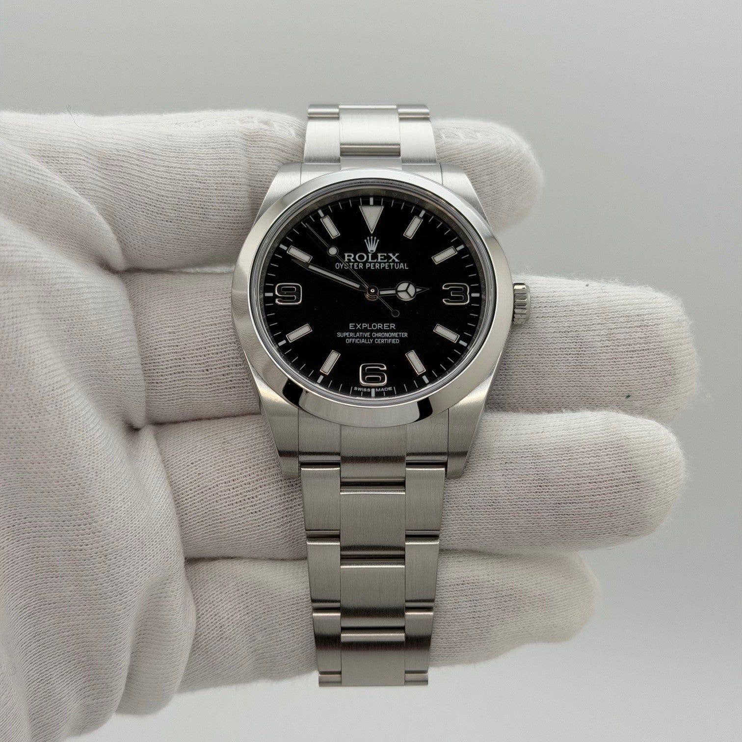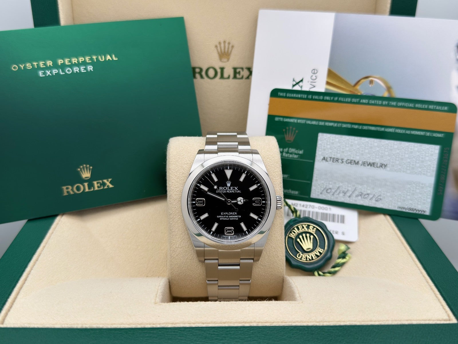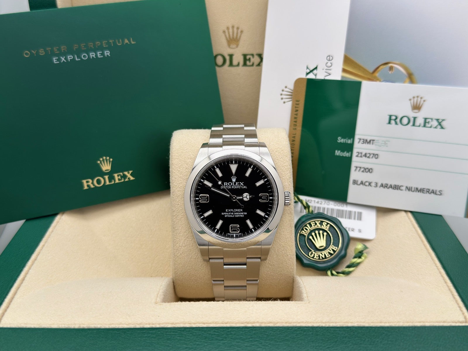 Rolex Explorer 214270 39mm Black Dial Stainless Steel Box Paper Rolex Sale! from 849500 /per This item is a recurring or deferred purchase. By continuing, I agree to the cancellation policy and authorize you to charge my payment method at the prices, frequency and dates listed on this page until my order is fulfilled or I cancel, if permitted. +1 (619) 232-1273 This item is currently on backorder but you can still purchase it now and we'll ship as soon as more become available. Style Number: 214270Serial: 73MT****Year: 2016 Model: Rolex Explorer Case Material: Stainless Steel Band: Stainless Steel Bezel: Stainless Steel Dial: Black With 3 Arabic Numeral Markers Crystal: Sapphire Crystal Case Size: 39mm Includes: - Rolex Box & Paper- Certified Appraisal - 1 Year WarrantySKU 23322 / 117145TOC111025