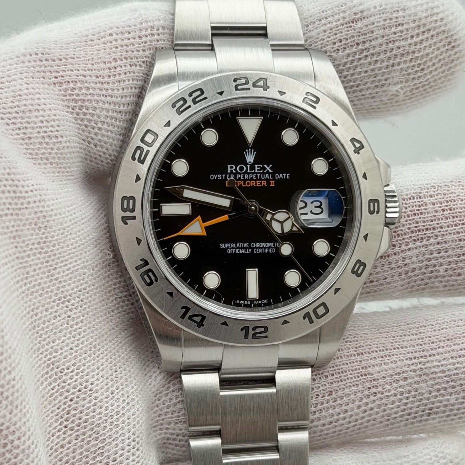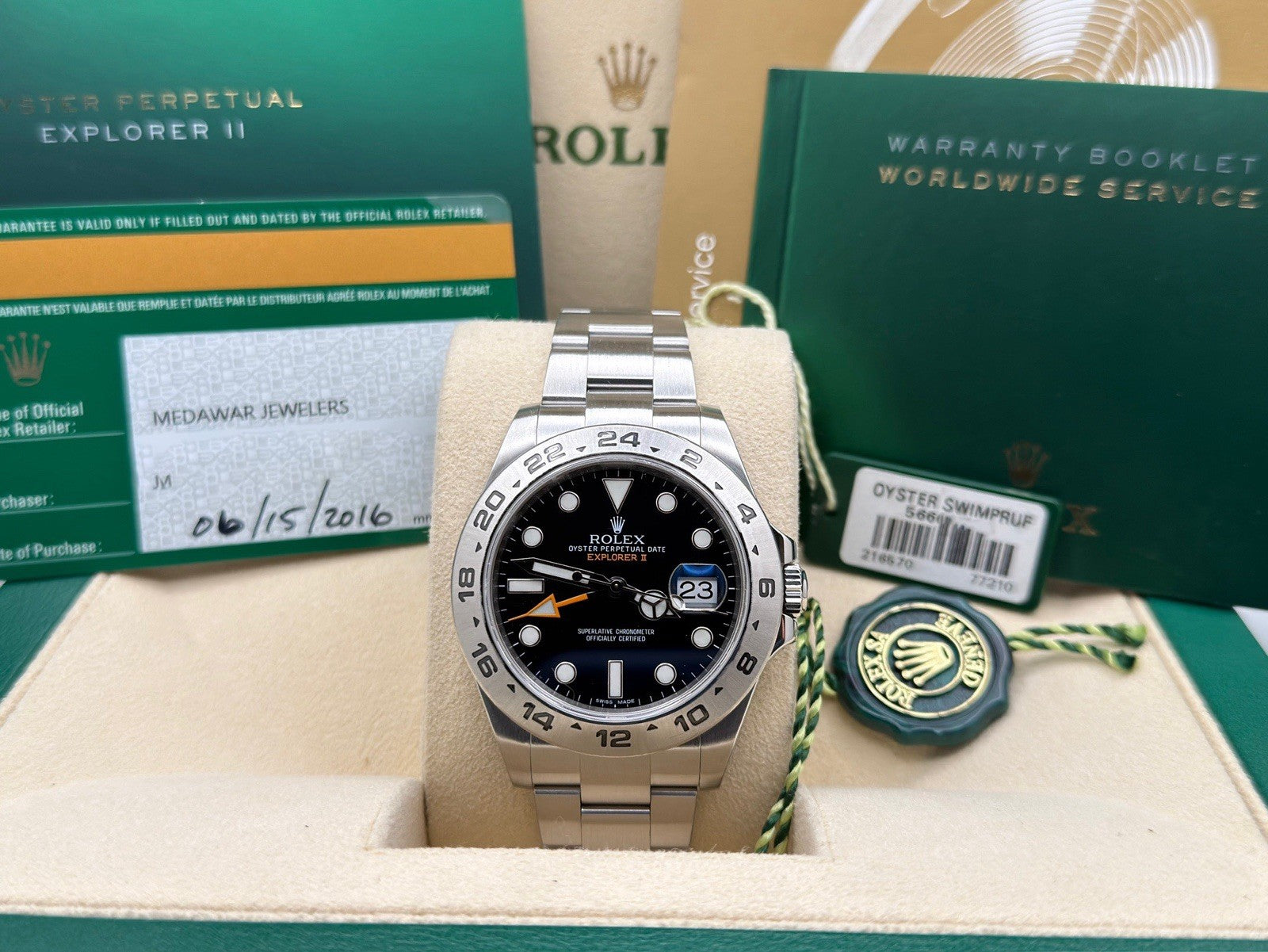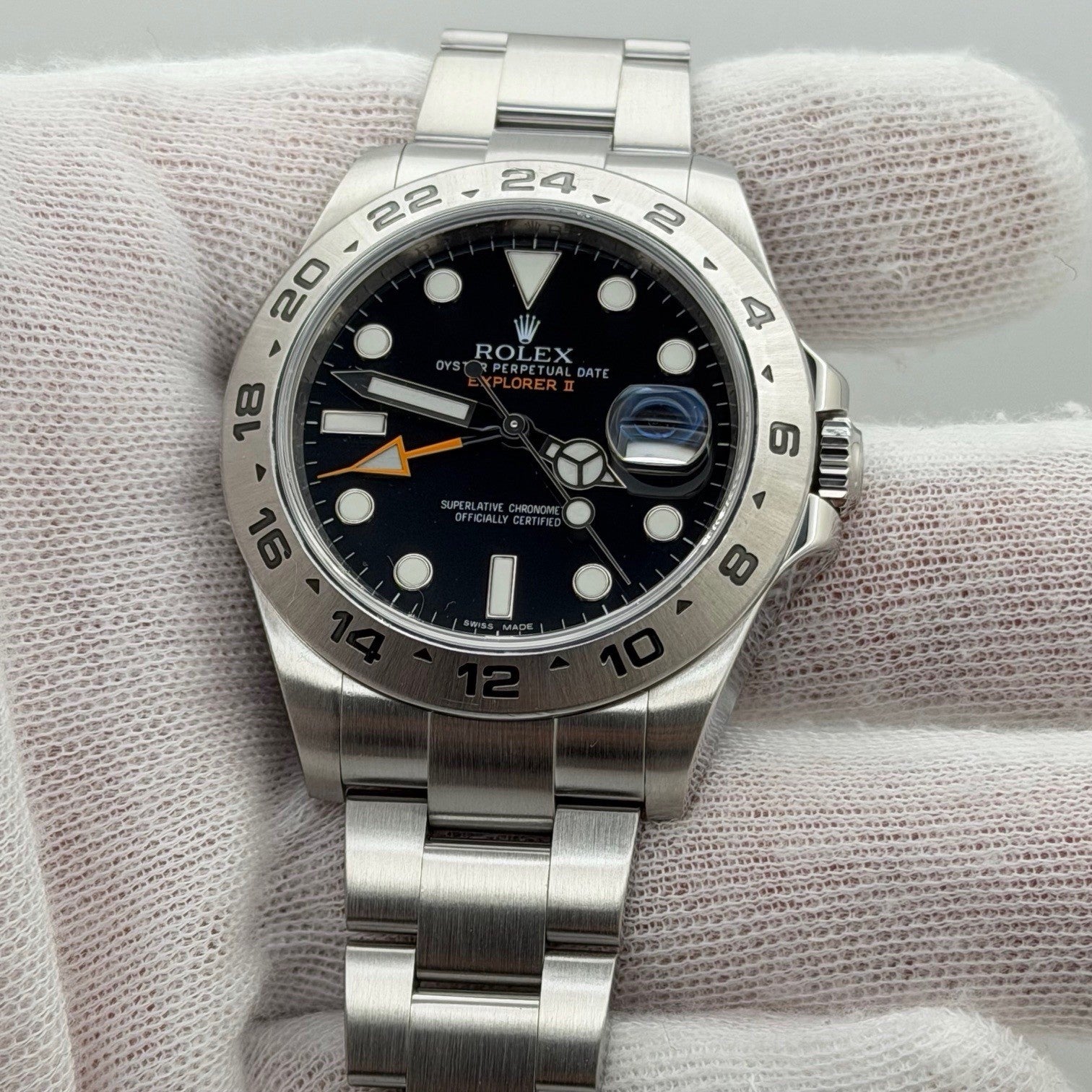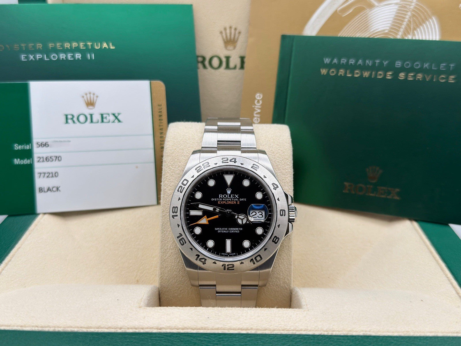 ROLEX Explorer II 216570 42mm Black Dial Stainless Steel Box Papers Rolex Sale! from 969500 /per This item is a recurring or deferred purchase. By continuing, I agree to the cancellation policy and authorize you to charge my payment method at the prices, frequency and dates listed on this page until my order is fulfilled or I cancel, if permitted. +1 (619) 232-1273 This item is currently on backorder but you can still purchase it now and we'll ship as soon as more become available. Style Number: 216570Serial: 566G****Year: 2016 Model: Rolex Explorer II Case Material: Stainless Steel Band: Stainless Steel Bezel: Stainless Steel Dial: Black Crystal: Sapphire Case Size: 42mm Includes: - Rolex Box & Papers- Certified Appraisal - One Year WarrantySKU 23422 / 121825TOFC121125