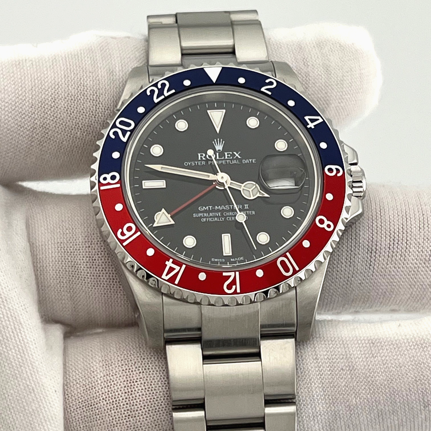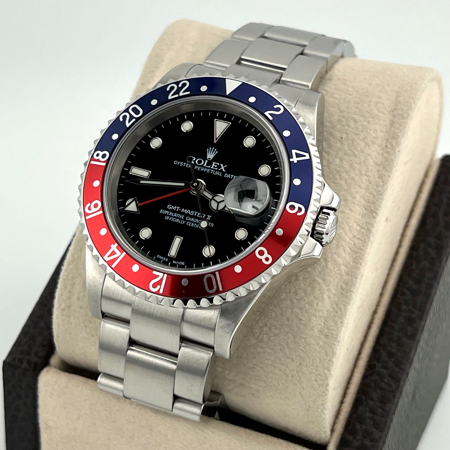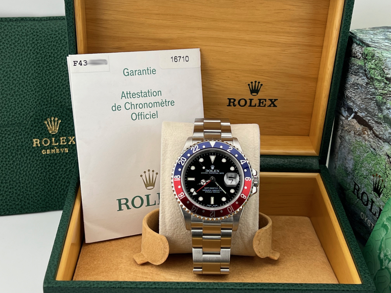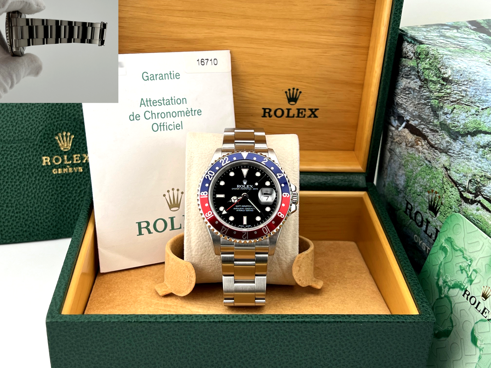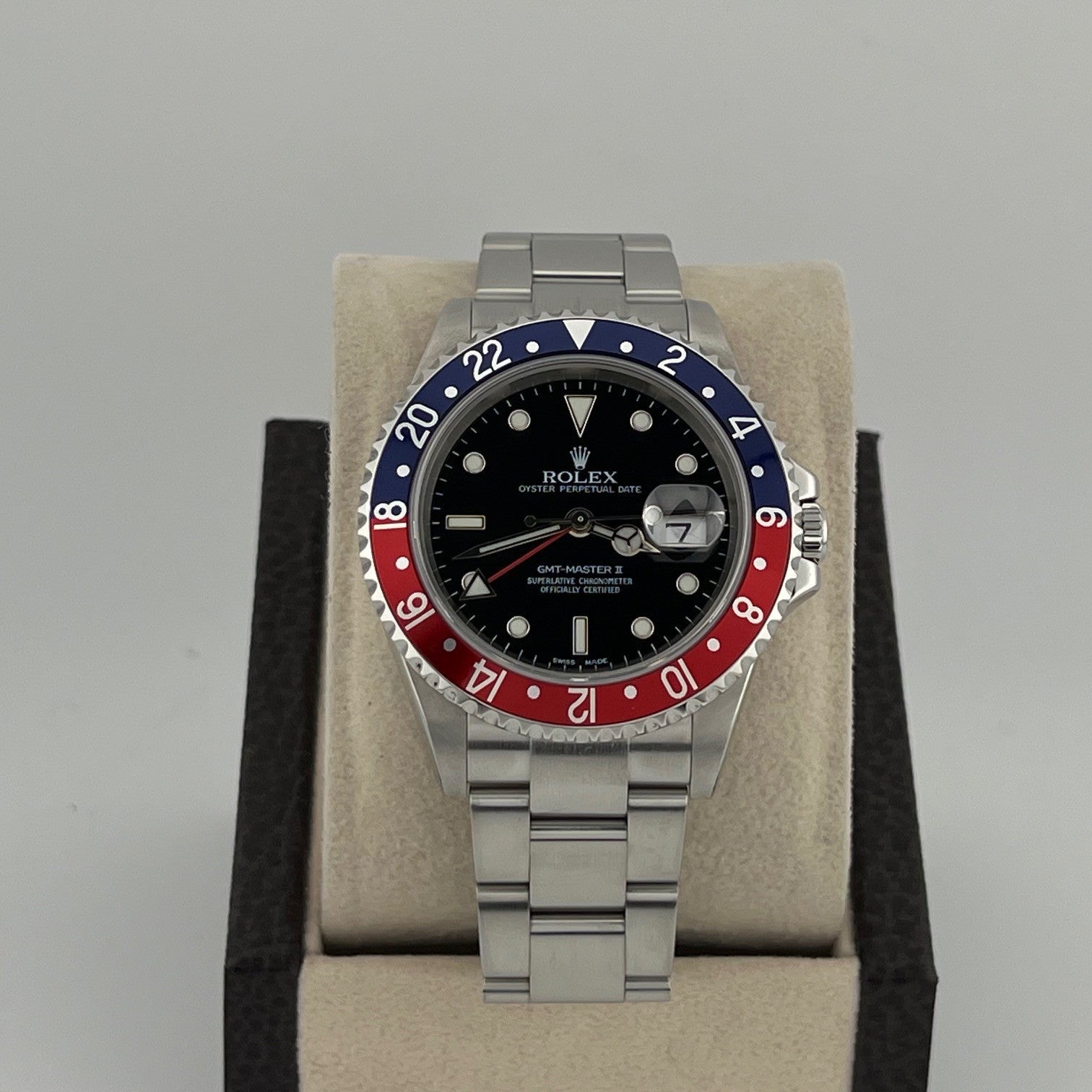 Rolex GMT Master II Pepsi 16710 40mm Black Dial Stainless Steel Box Papers 2004 Rolex Sale! from 1599500 /per This item is a recurring or deferred purchase. By continuing, I agree to the cancellation policy and authorize you to charge my payment method at the prices, frequency and dates listed on this page until my order is fulfilled or I cancel, if permitted. +1 (619) 232-1273 This item is currently on backorder but you can still purchase it now and we'll ship as soon as more become available. Style Number: 16710Serial: F43****Year: 2004 Model: Rolex GMT Master II "Pepsi" Case Material: Stainless Steel Band: Stainless Steel Bezel: Pepsi - Red and Blue Dial: Black Crystal: Sapphire Case Size: 40mm Includes: - Rolex Box & Paper- Certified Appraisal - 1 Year WarrantySKU 23195 / 132175TLK101325