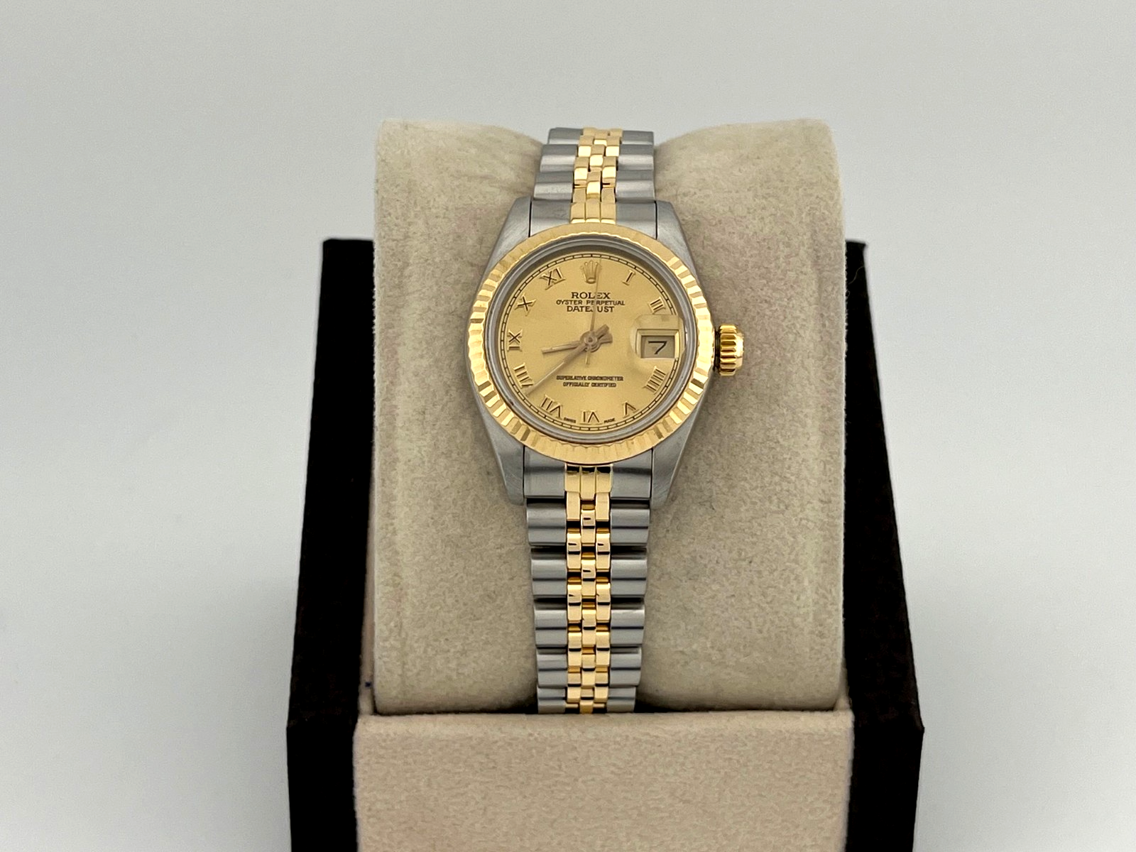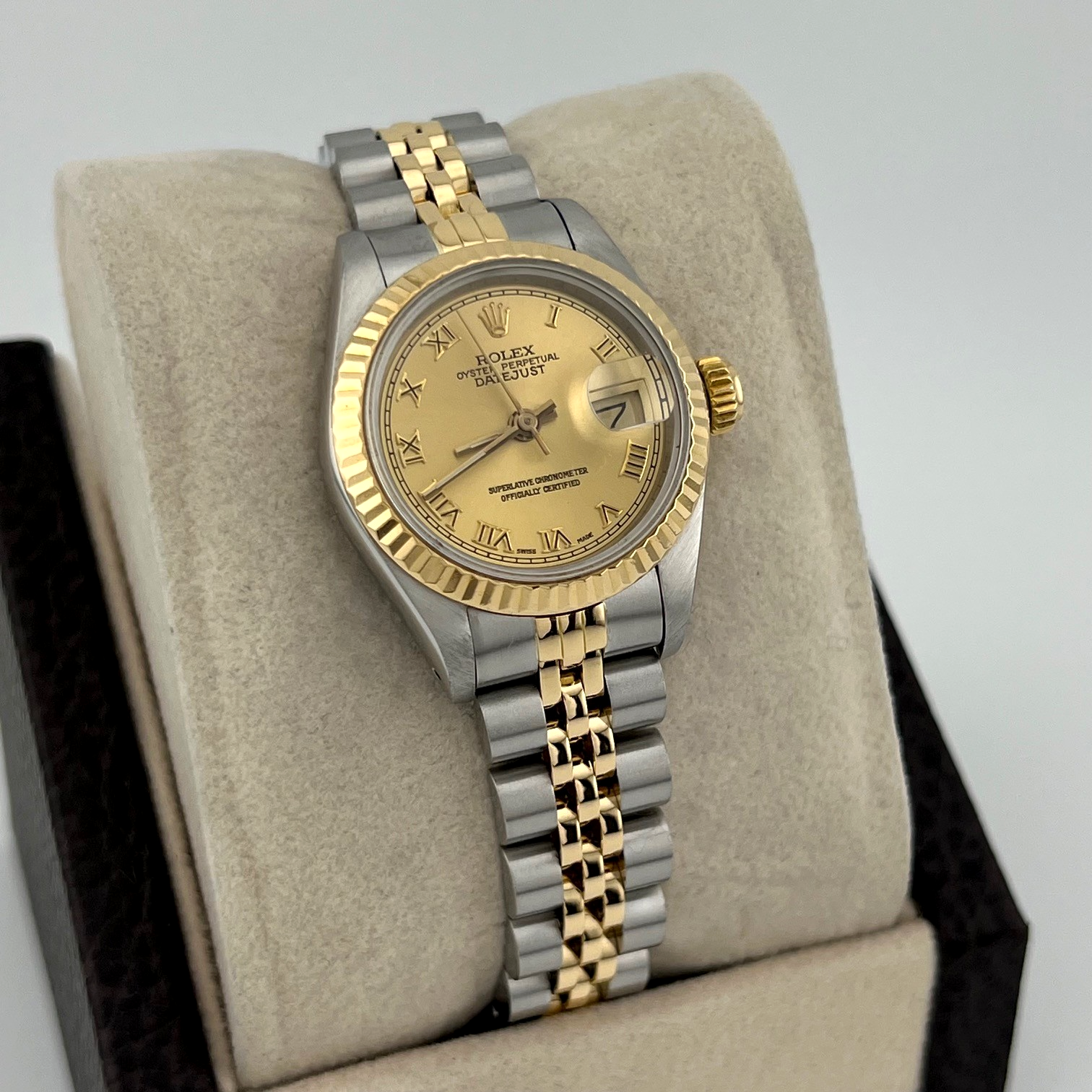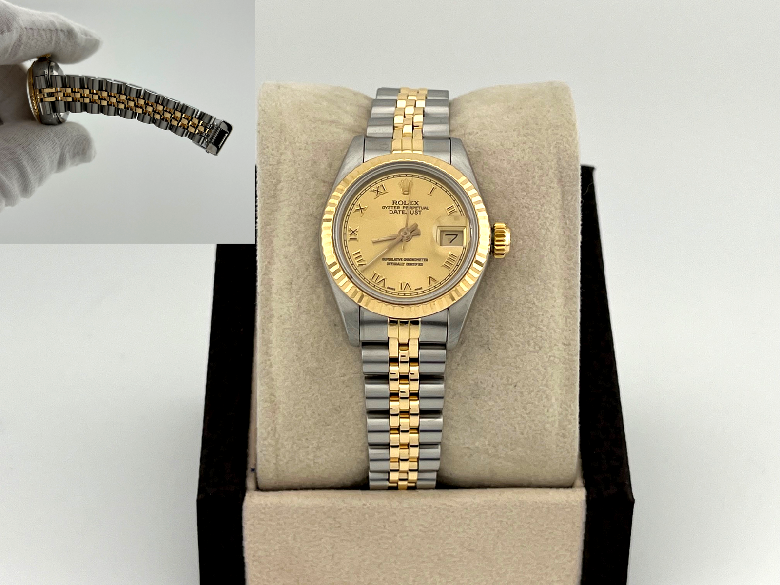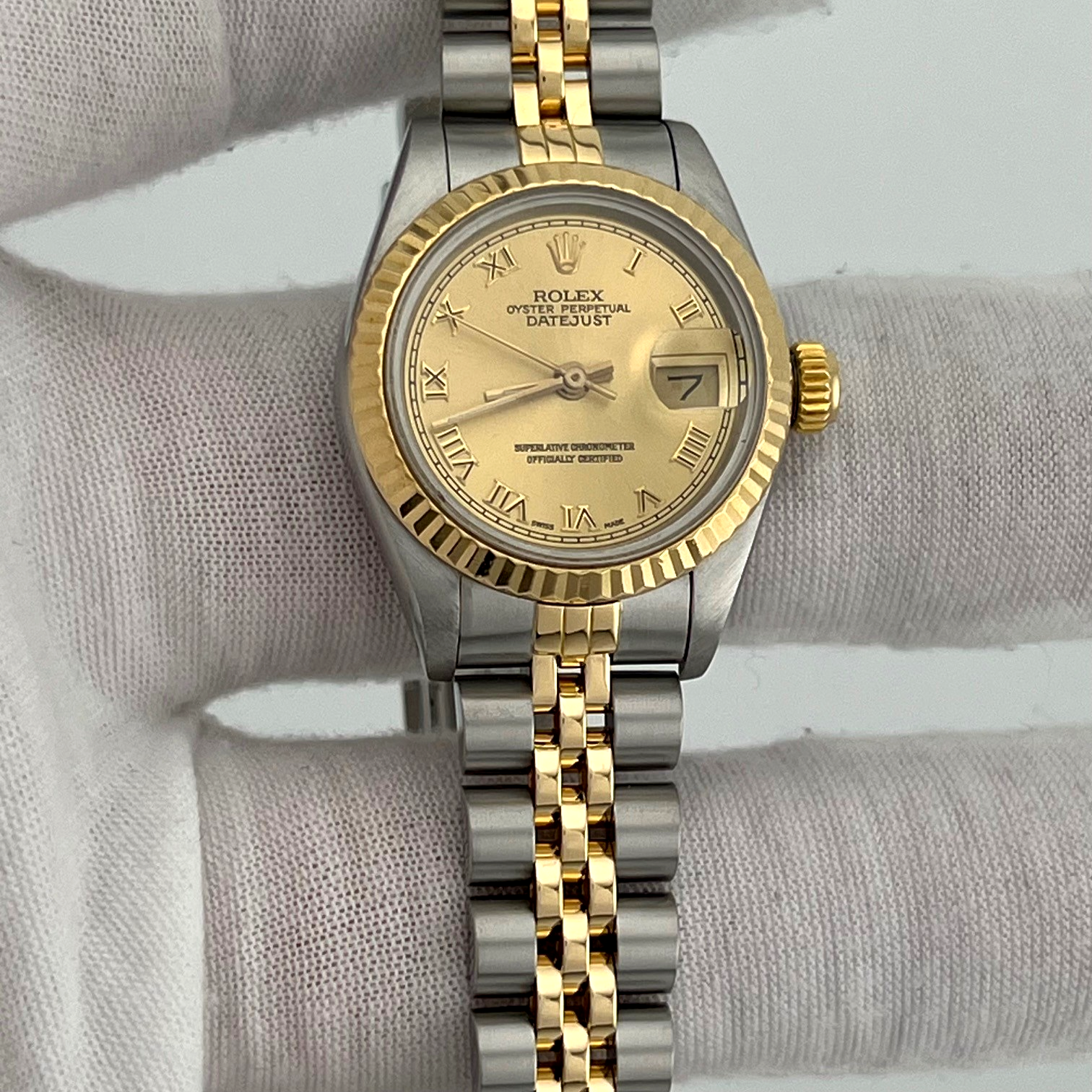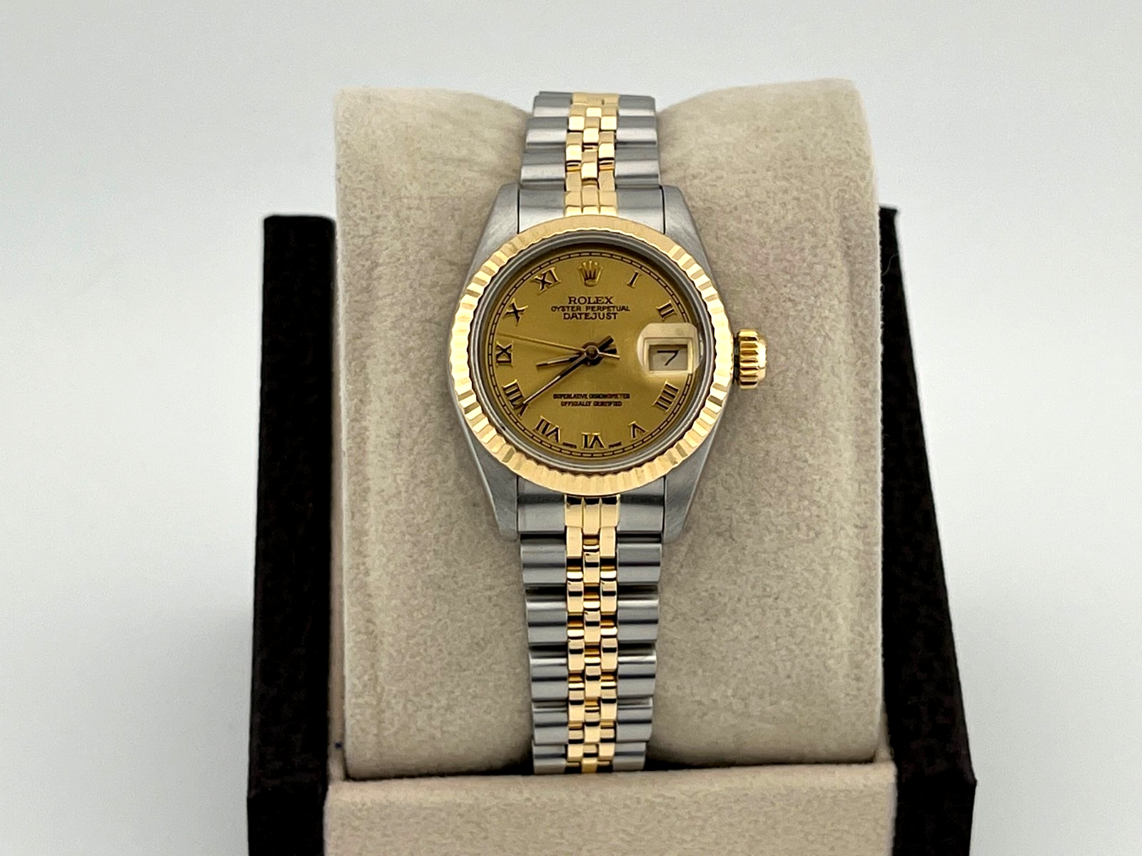 Rolex Ladies Datejust 69173 26mm Champagne Roman Dial 18K Gold Stainless Steel Rolex Sale! from 529500 /per This item is a recurring or deferred purchase. By continuing, I agree to the cancellation policy and authorize you to charge my payment method at the prices, frequency and dates listed on this page until my order is fulfilled or I cancel, if permitted. +1 (619) 232-1273 This item is currently on backorder but you can still purchase it now and we'll ship as soon as more become available. Style Number: 69173Serial: R735***Year: 1988 Model: Rolex Ladies Datejust Case Material: Stainless Steel Band: 18k Yellow Gold & Stainless Steel Jubilee Bezel: 18k Yellow Gold Fluted Dial: Champagne Roman Numeral Dial Crystal: Sapphire Case Size: 26mm Includes: - Elegant Watch Box- Certified Appraisal - 1 Year WarrantySKU 23066 / 18130TJD090925