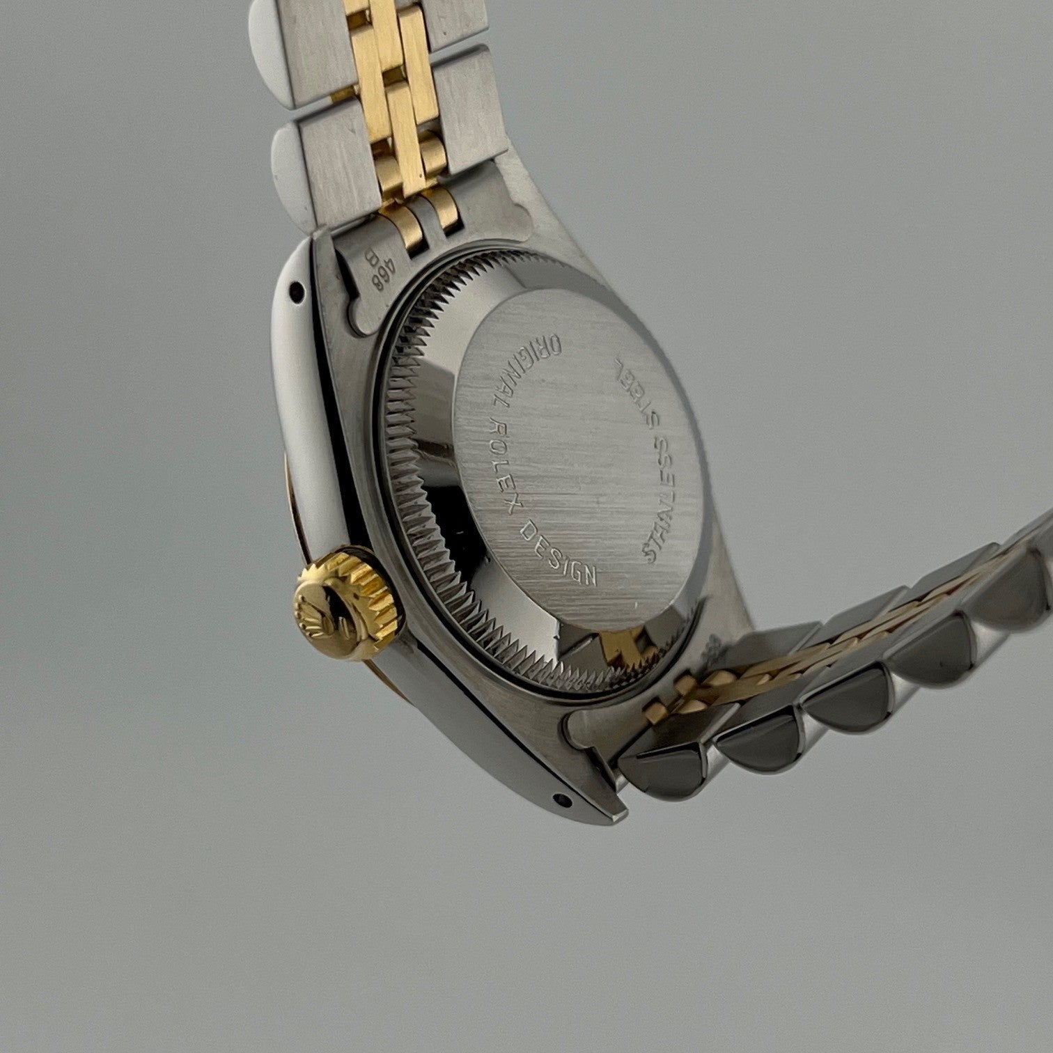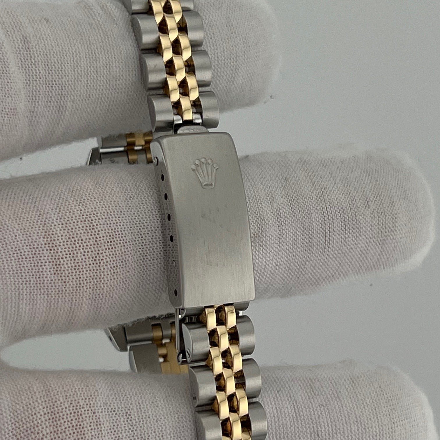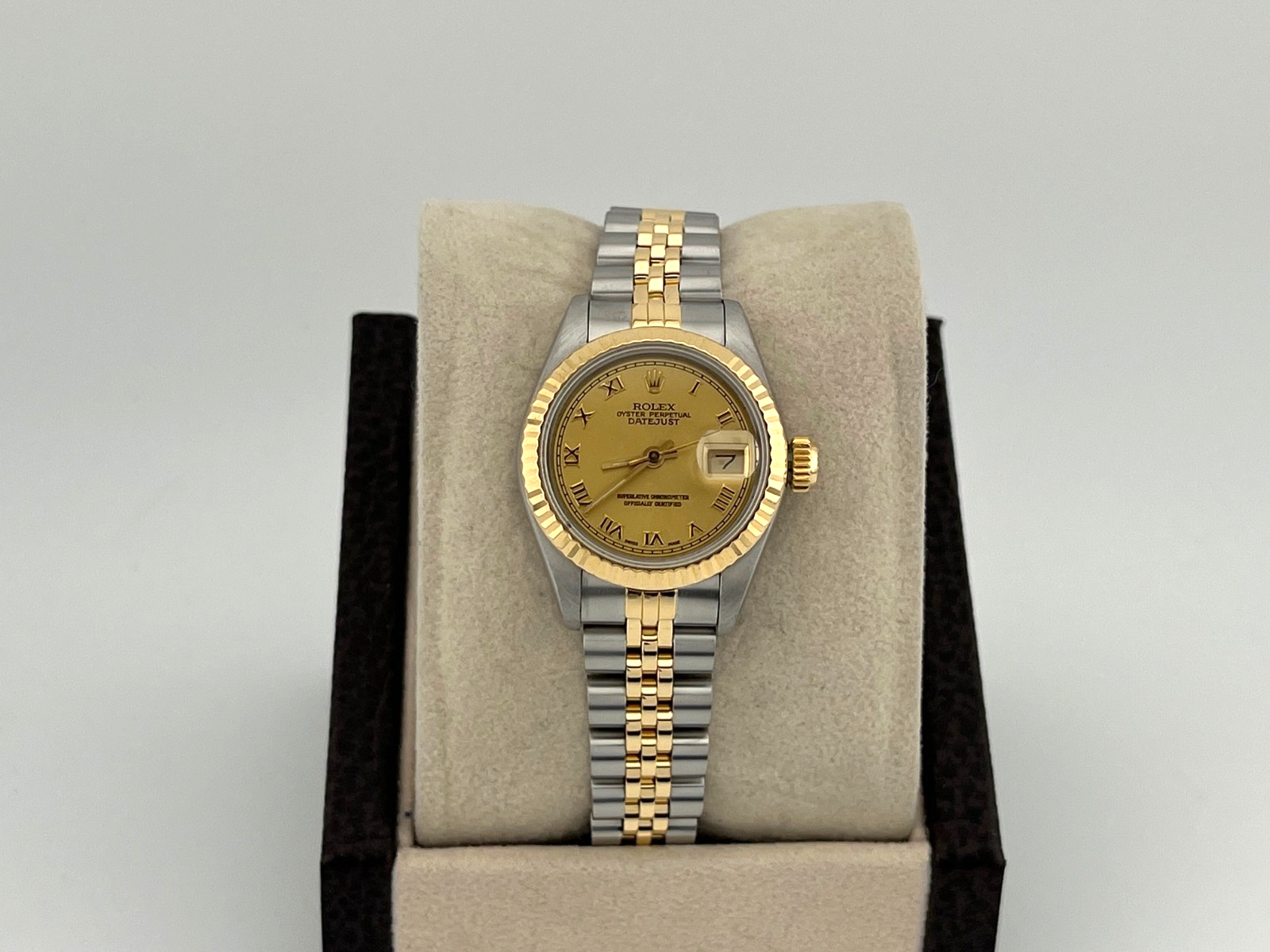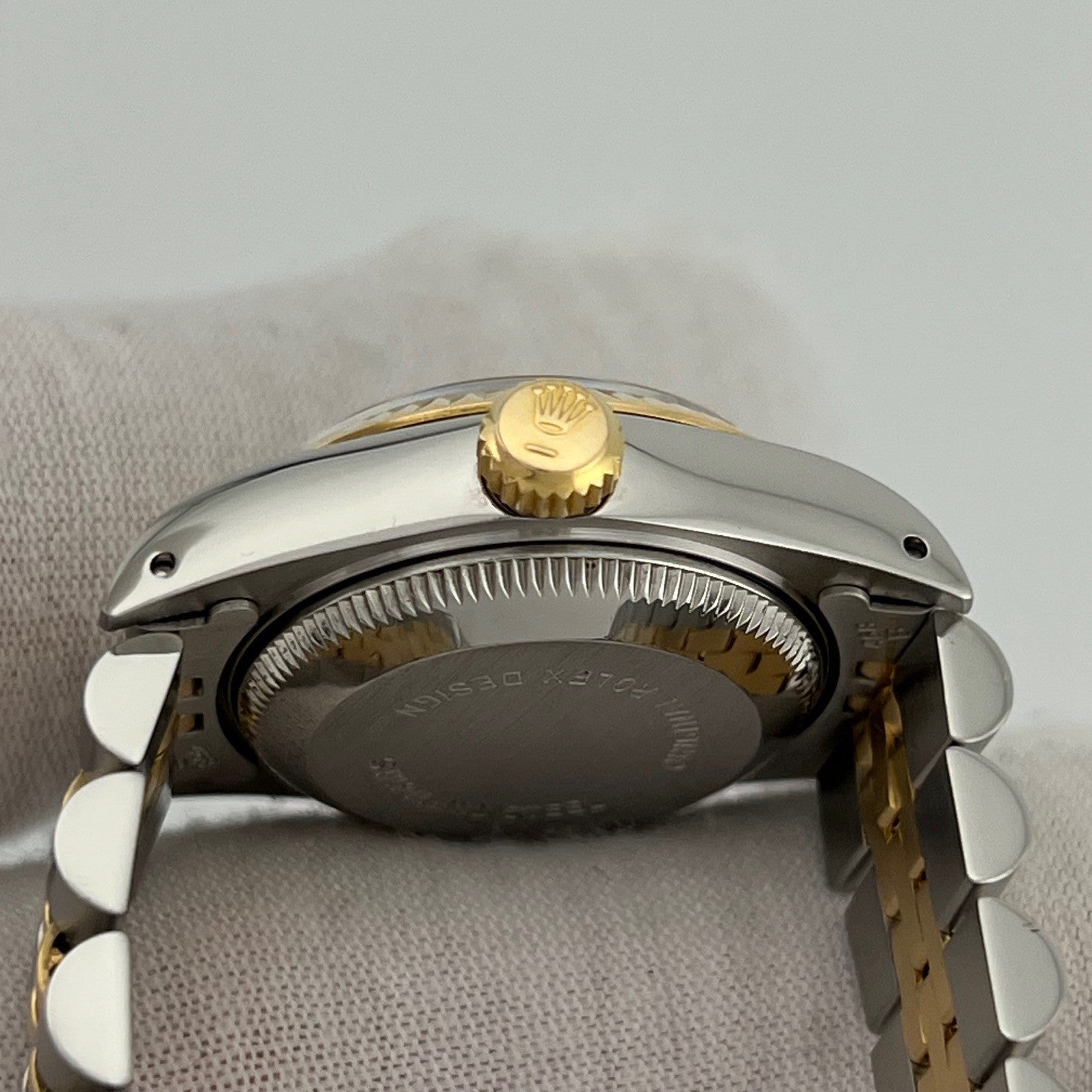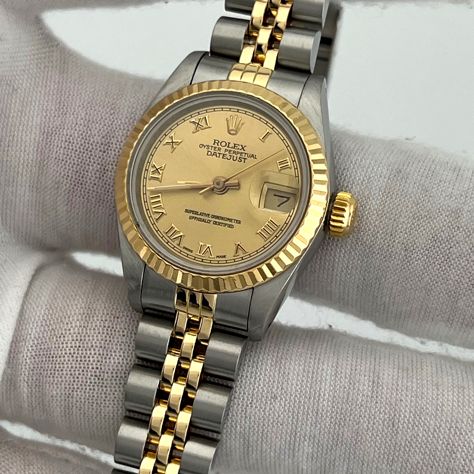 Rolex Ladies Datejust 69173 26mm Champagne Roman Dial 18K Gold Stainless Steel Rolex Sale! from 529500 /per This item is a recurring or deferred purchase. By continuing, I agree to the cancellation policy and authorize you to charge my payment method at the prices, frequency and dates listed on this page until my order is fulfilled or I cancel, if permitted. +1 (619) 232-1273 This item is currently on backorder but you can still purchase it now and we'll ship as soon as more become available. Style Number: 69173Serial: R735***Year: 1988 Model: Rolex Ladies Datejust Case Material: Stainless Steel Band: 18k Yellow Gold & Stainless Steel Jubilee Bezel: 18k Yellow Gold Fluted Dial: Champagne Roman Numeral Dial Crystal: Sapphire Case Size: 26mm Includes: - Elegant Watch Box- Certified Appraisal - 1 Year WarrantySKU 23066 / 18130TJD090925