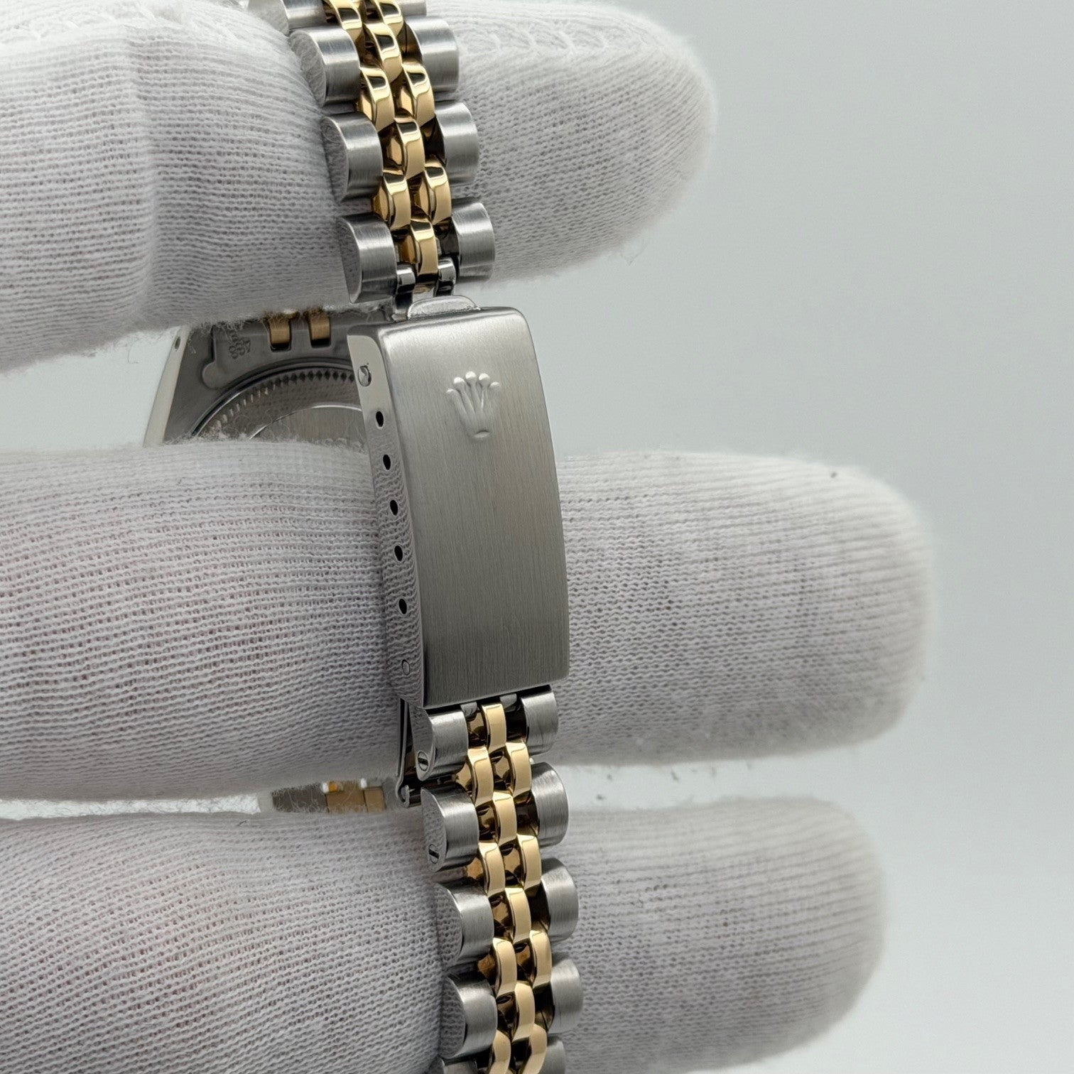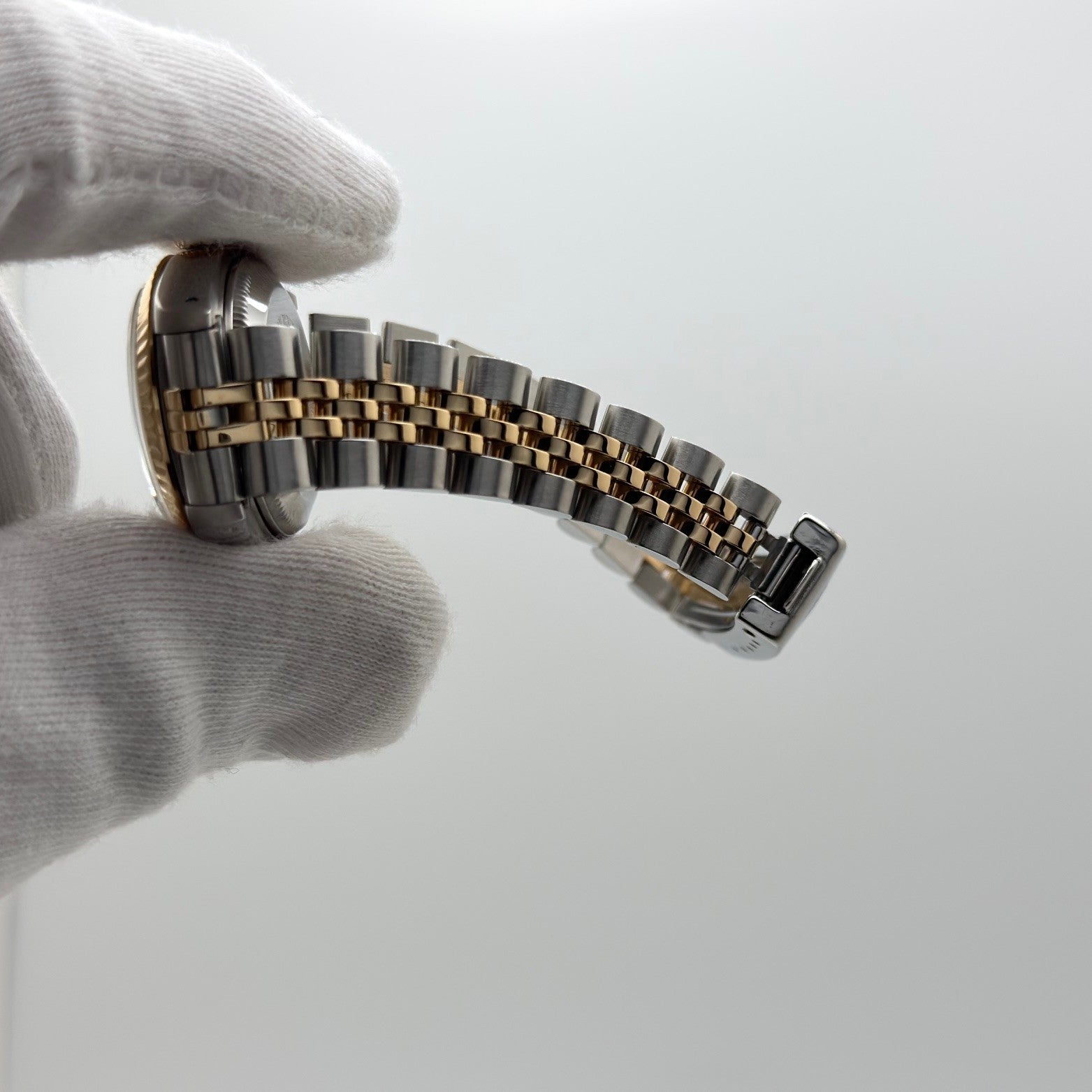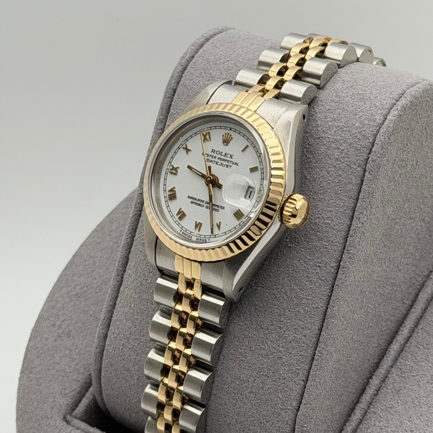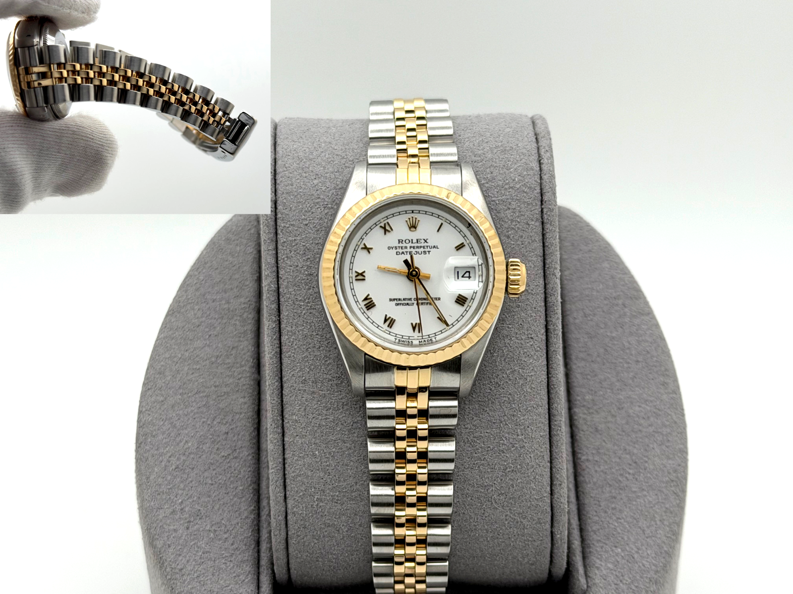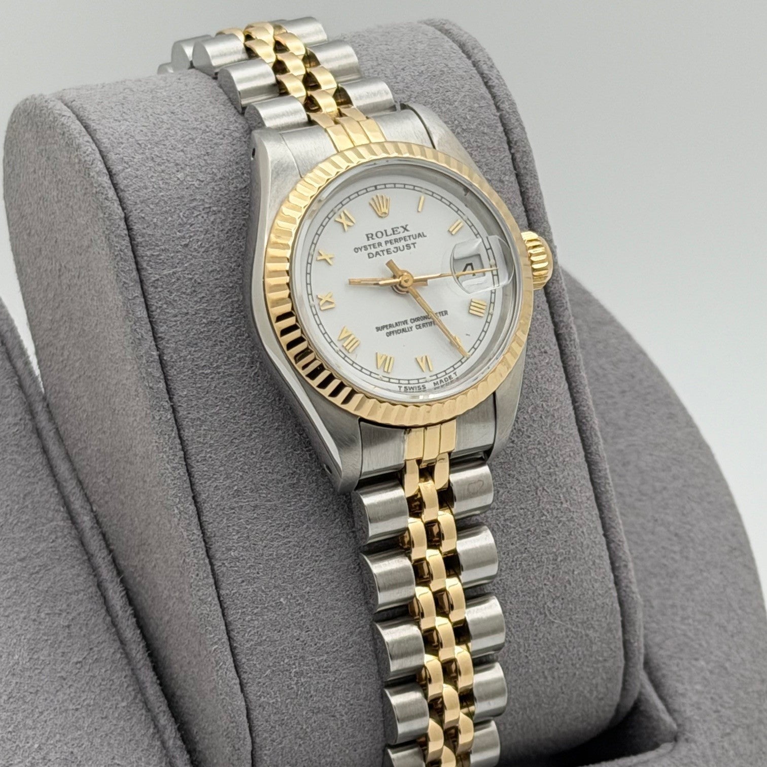 Rolex Ladies Datejust 69173 26mm White Roman Dial 18k Yellow Gold Steel Jubilee