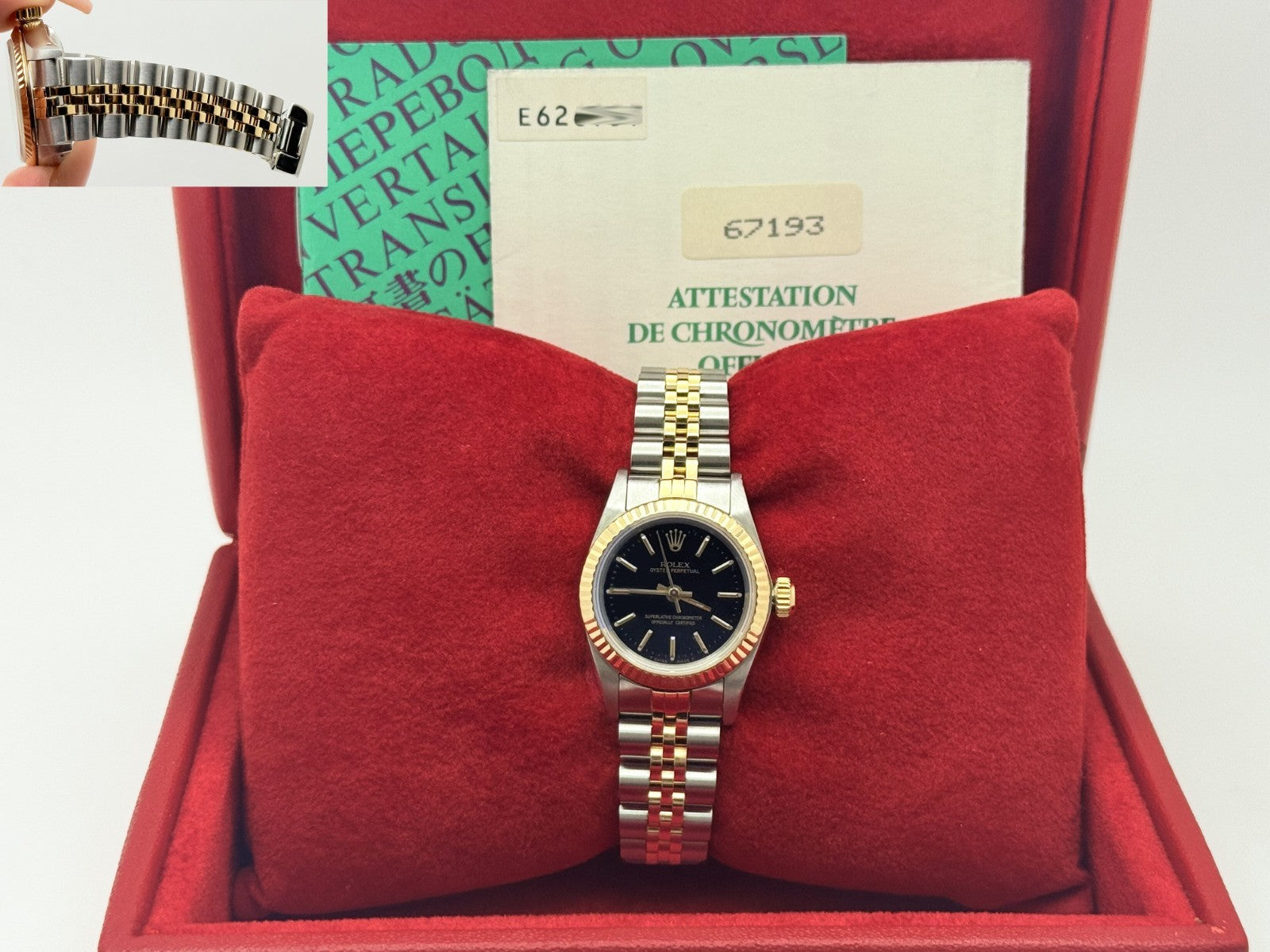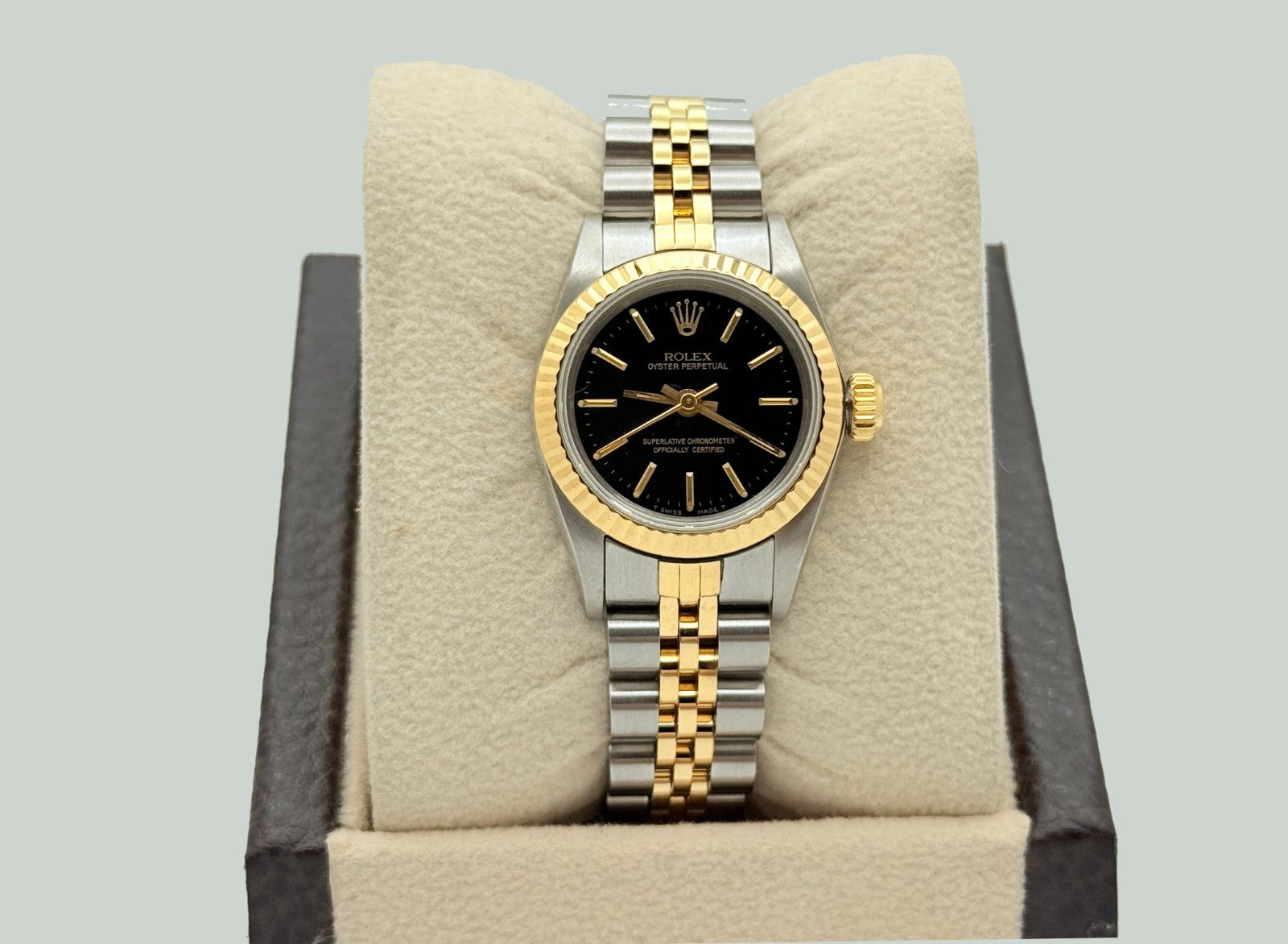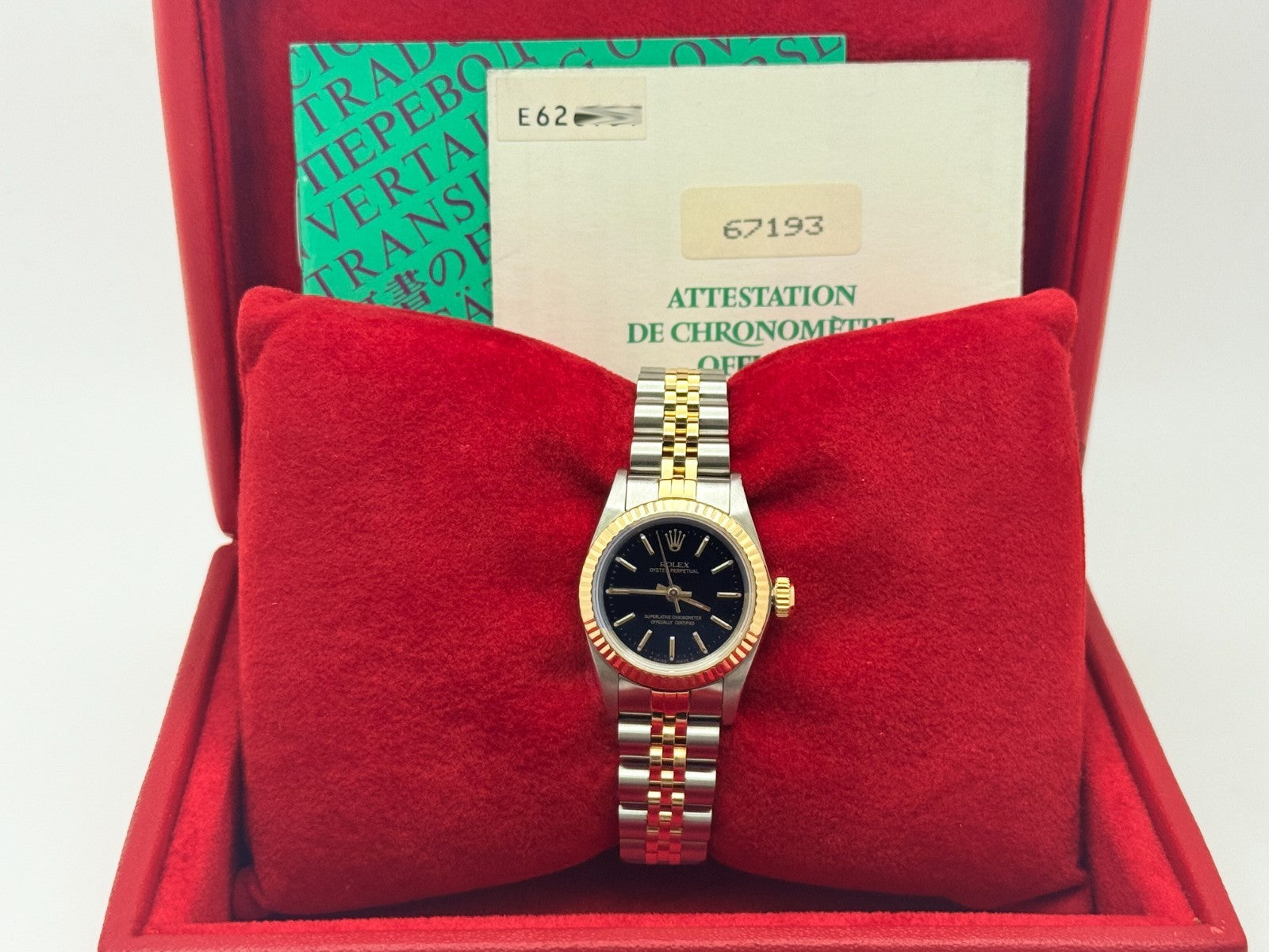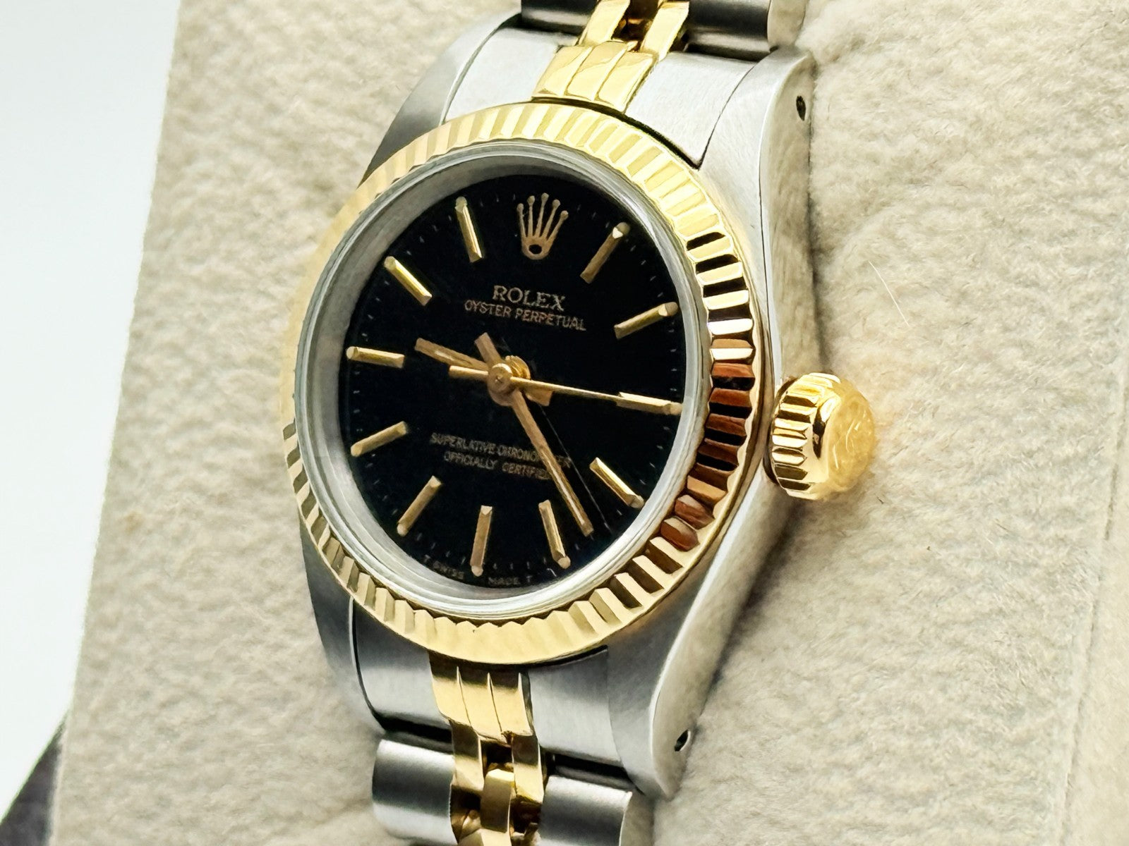 Rolex Ladies Oyster Perpetual 67193 Black Dial 18K Yellow Gold Steel Box Papers Rolex Sale! from 569500 /per This item is a recurring or deferred purchase. By continuing, I agree to the cancellation policy and authorize you to charge my payment method at the prices, frequency and dates listed on this page until my order is fulfilled or I cancel, if permitted. +1 (619) 232-1273 This item is currently on backorder but you can still purchase it now and we'll ship as soon as more become available. Style Number: 67193Serial: E62****Year: 1992 Model: Rolex Ladies Oyster Perpetual Case Material: Stainless Steel Band: 18k Yellow Gold & Stainless Steel Bezel: 18k Yellow Gold Fluted Dial: Black Dial Crystal: Sapphire Crystal Case Size: 26mm Includes: - Rolex Box & Papers- Certified Appraisal - One Year WarrantySKU 22689 / 17512TCF061425SF