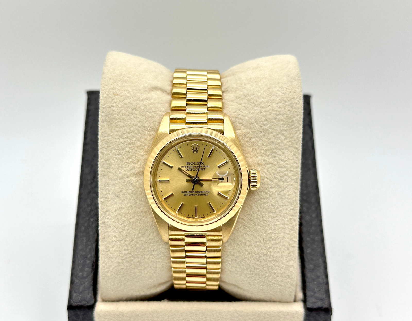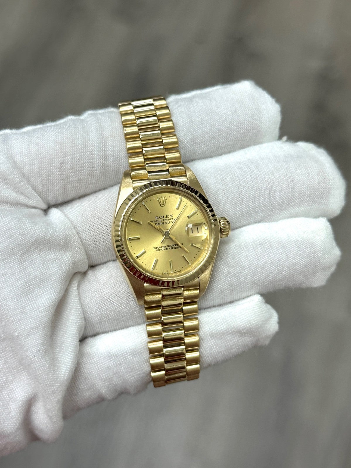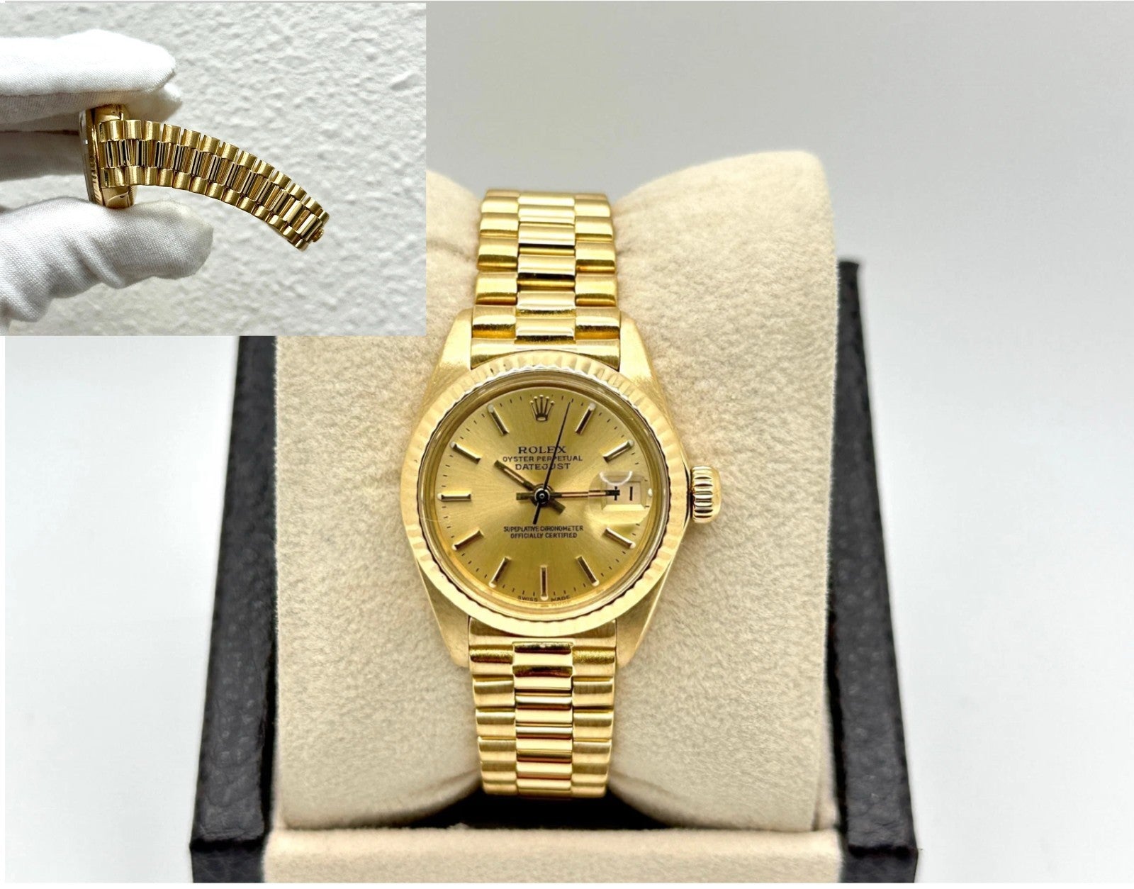 Rolex Ladies President 6917 Champagne Dial 18K Yellow Gold Rolex Sale! from 929500 /per This item is a recurring or deferred purchase. By continuing, I agree to the cancellation policy and authorize you to charge my payment method at the prices, frequency and dates listed on this page until my order is fulfilled or I cancel, if permitted. +1 (619) 232-1273 This item is currently on backorder but you can still purchase it now and we'll ship as soon as more become available. Style Number: 6917Serial: 7508***Year: 1983 Model: Rolex Ladies President Case Material: 18K Yellow Gold Band: 18K Yellow Gold Bezel: 18K Yellow Gold Dial: Champagne Crystal: Sapphire Crystal Case Size: 26mm Includes: - Elegant Watch Box- Certified Appraisal - One Year WarrantySKU 22567 / 112762TGC052825