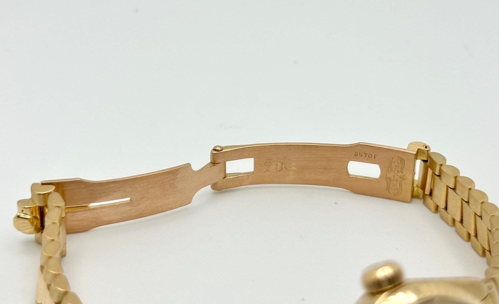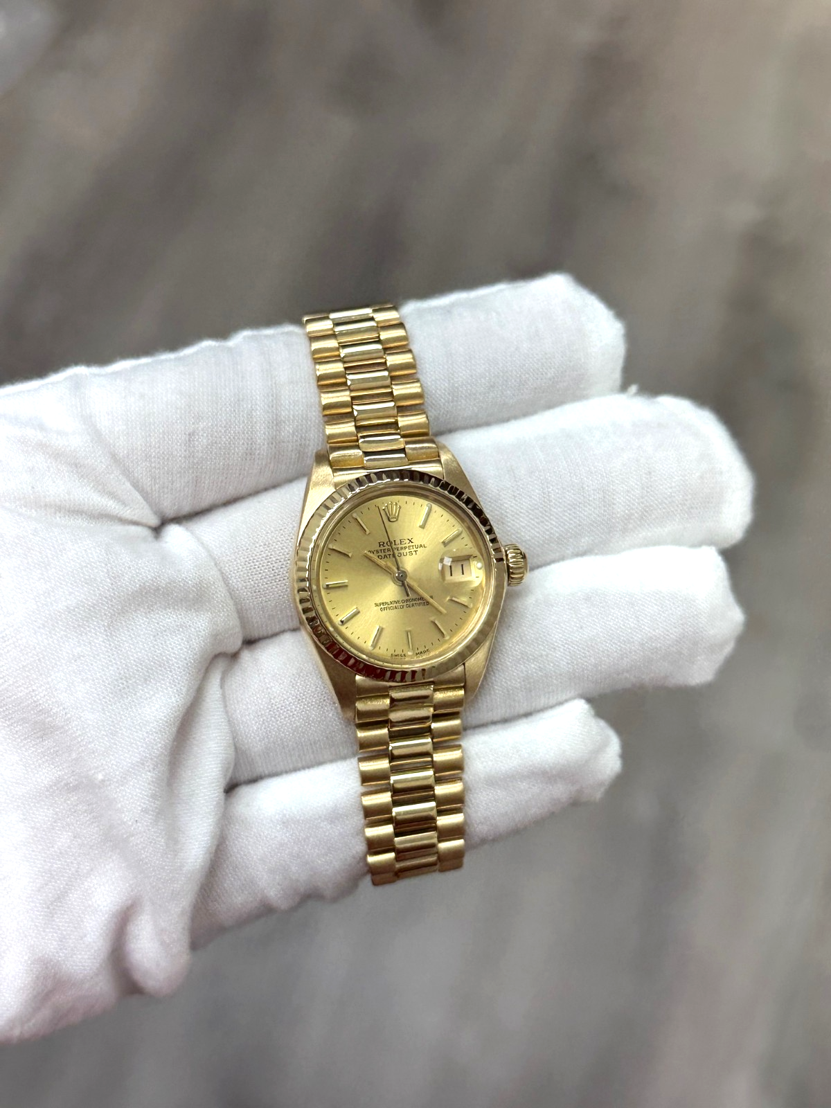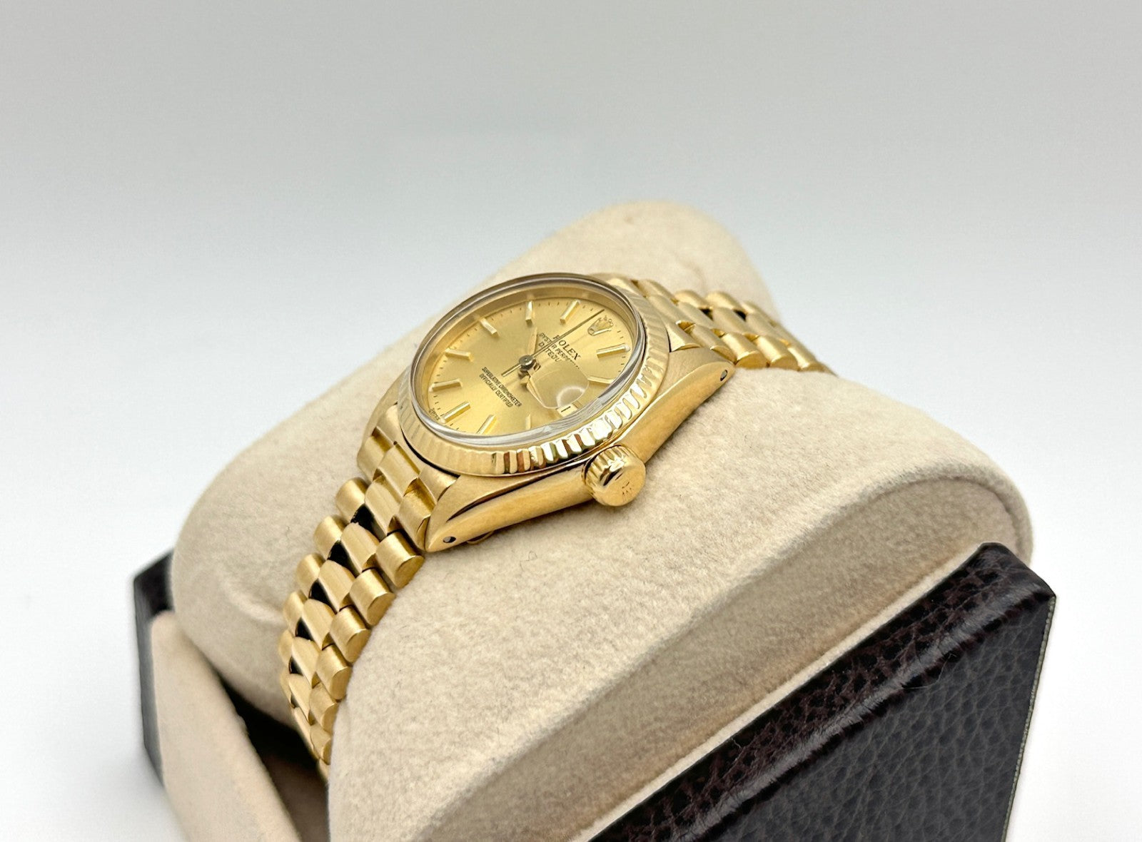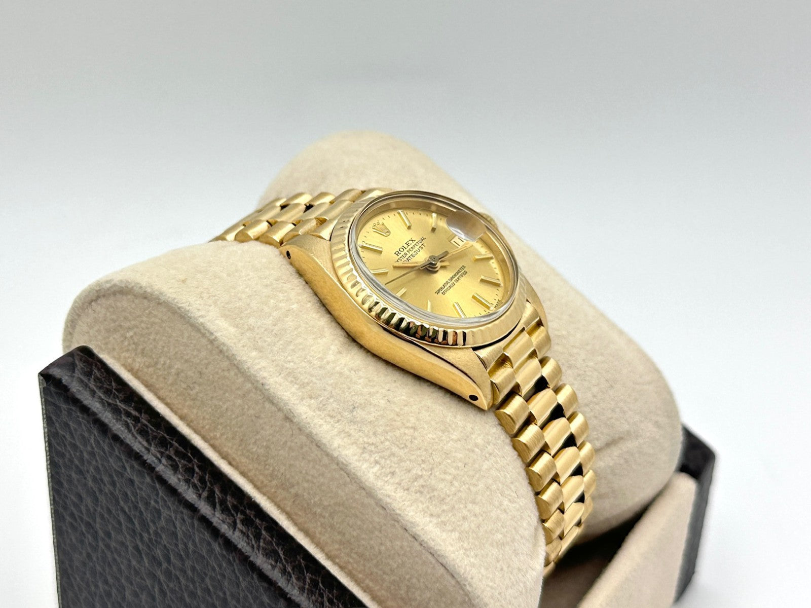 Rolex Ladies President 6917 Champagne Dial 18K Yellow Gold Rolex Sale! from 929500 /per This item is a recurring or deferred purchase. By continuing, I agree to the cancellation policy and authorize you to charge my payment method at the prices, frequency and dates listed on this page until my order is fulfilled or I cancel, if permitted. +1 (619) 232-1273 This item is currently on backorder but you can still purchase it now and we'll ship as soon as more become available. Style Number: 6917Serial: 7508***Year: 1983 Model: Rolex Ladies President Case Material: 18K Yellow Gold Band: 18K Yellow Gold Bezel: 18K Yellow Gold Dial: Champagne Crystal: Sapphire Crystal Case Size: 26mm Includes: - Elegant Watch Box- Certified Appraisal - One Year WarrantySKU 22567 / 112762TGC052825