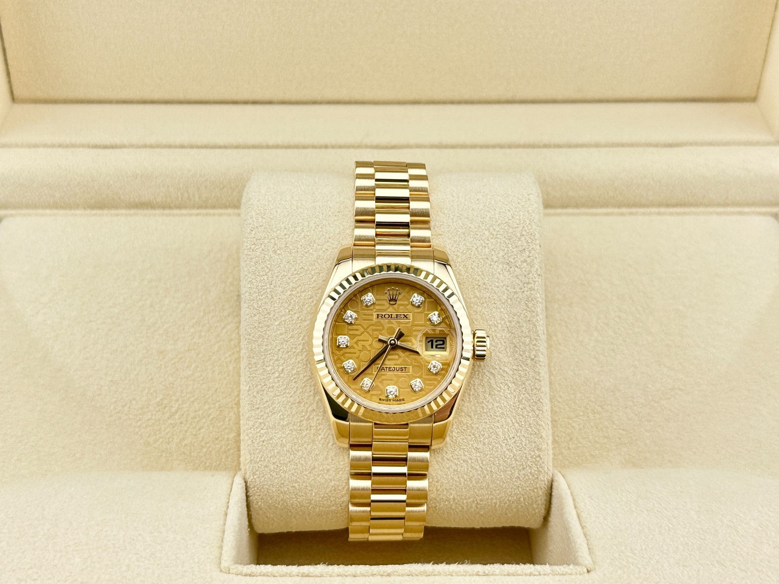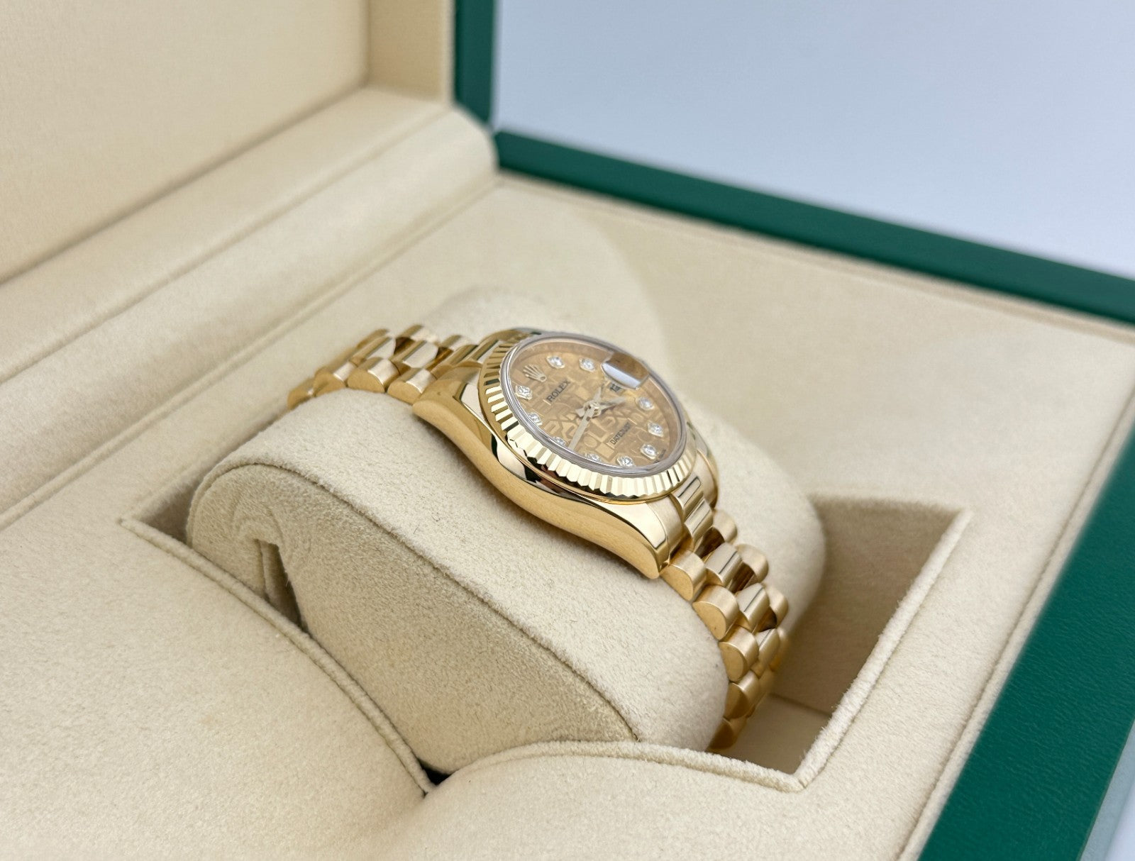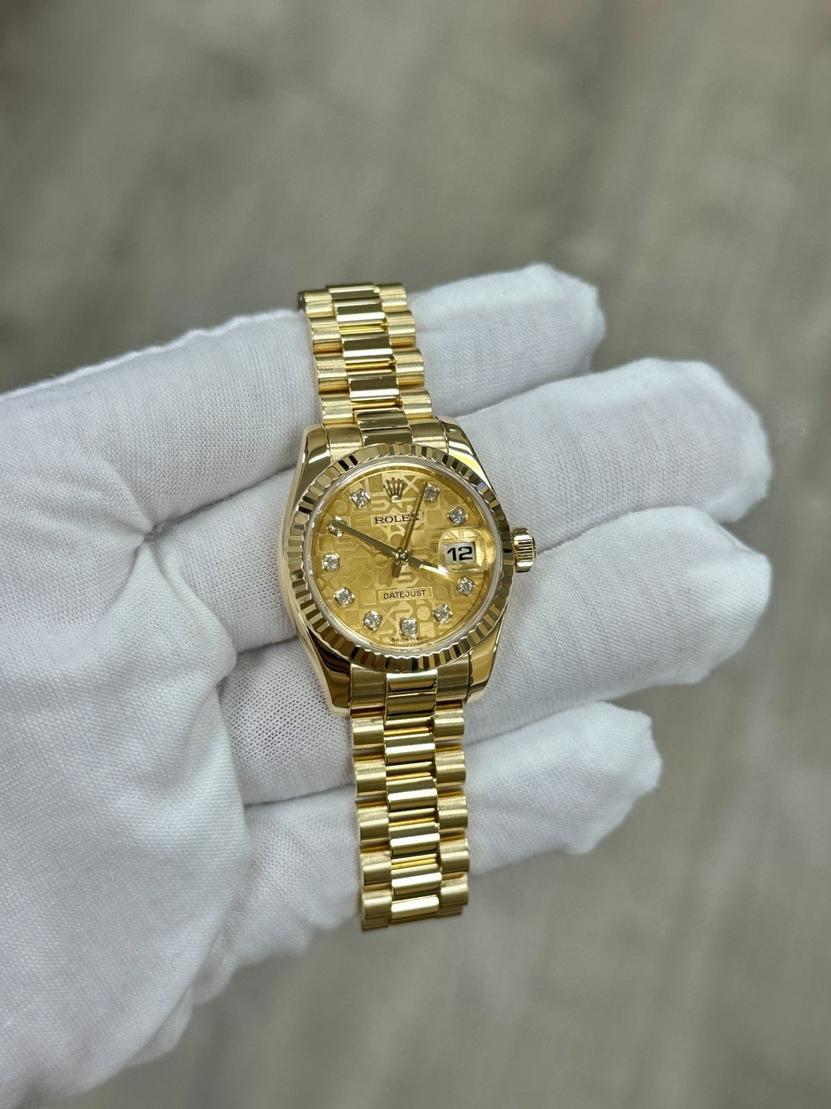 Rolex Ladies President Datejust 179178 Diamond Jubilee Dial 18K Gold Box Paper Rolex Sale! from 1949500 /per This item is a recurring or deferred purchase. By continuing, I agree to the cancellation policy and authorize you to charge my payment method at the prices, frequency and dates listed on this page until my order is fulfilled or I cancel, if permitted. +1 (619) 232-1273 This item is currently on backorder but you can still purchase it now and we'll ship as soon as more become available. Style Number: 179178Serial: 98971***Year: 2013 Model: Rolex Ladies Datejust President Case Material: 18K Yellow Gold Band: 18K Yellow Gold Bezel: 18K Yellow Gold Dial: Factory Diamond Jubilee Dial Crystal: Sapphire Crystal Case Size: 26mm Includes: - Rolex Box & Paper- Certified Appraisal - One Year WarrantySKU 23192 / 142186TOC101025