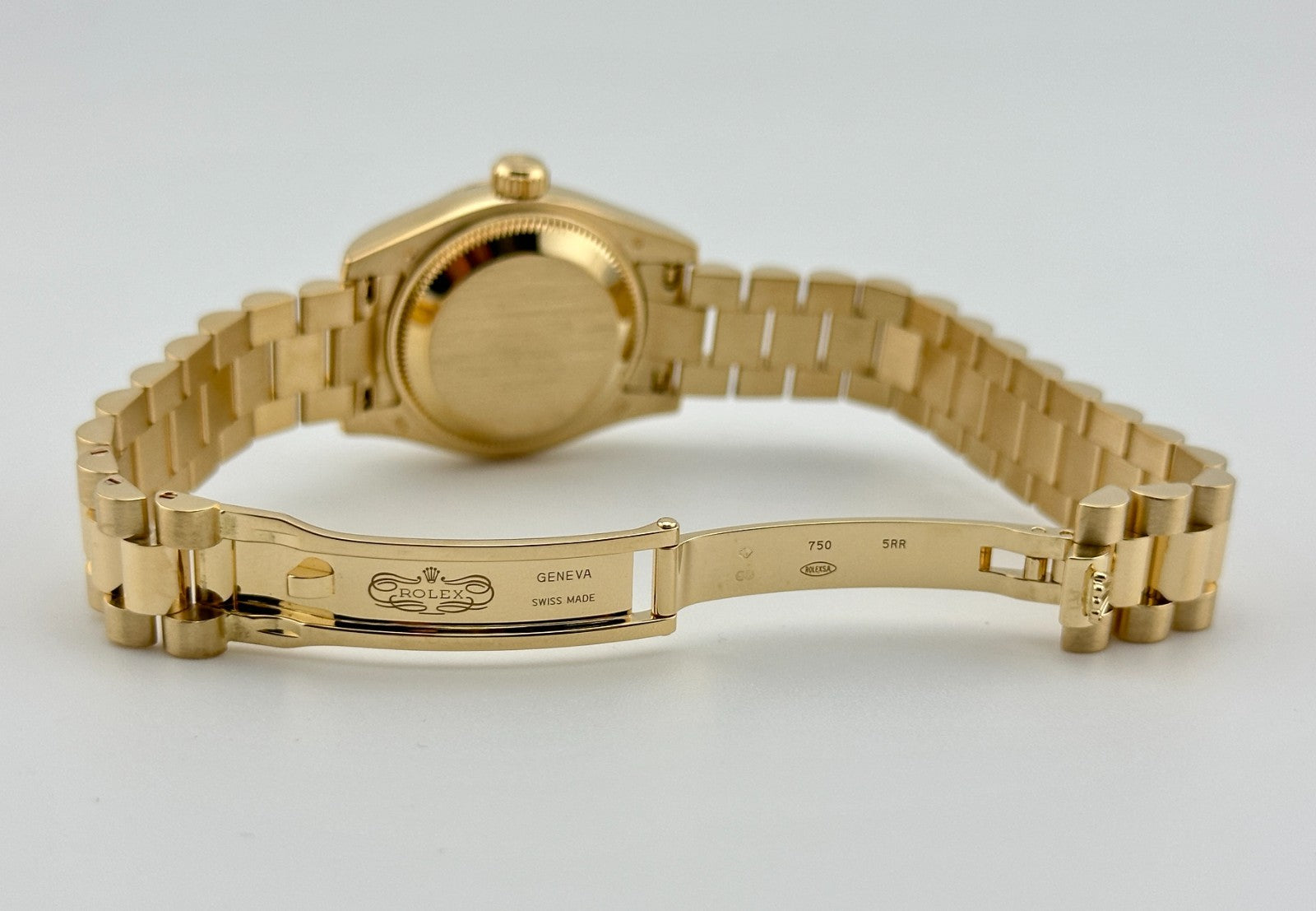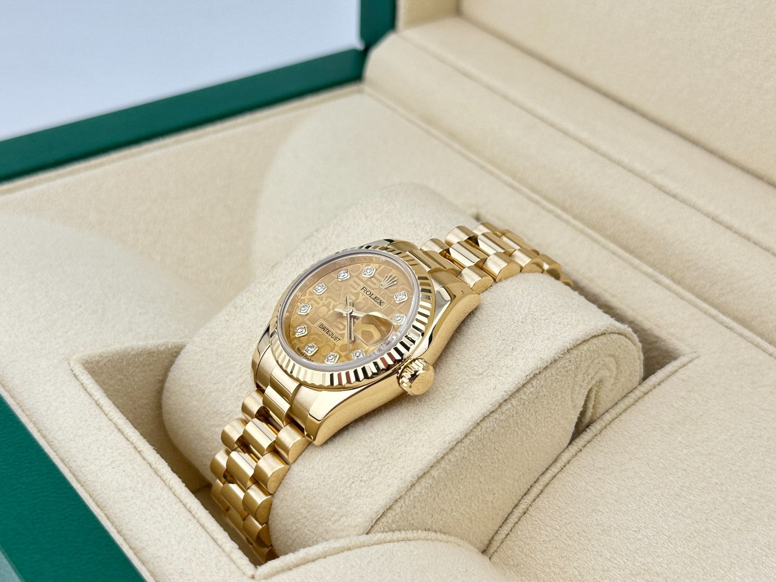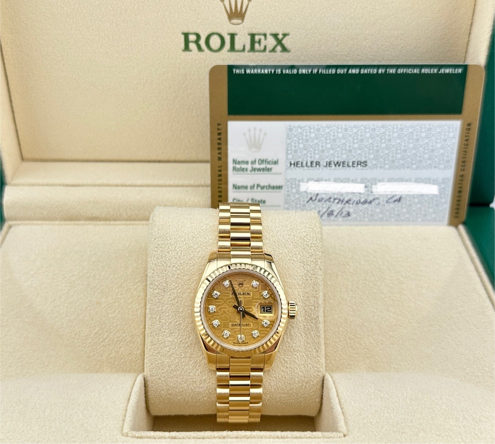 Rolex Ladies President Datejust 179178 Diamond Jubilee Dial 18K Gold Box Paper Rolex Sale! from 1949500 /per This item is a recurring or deferred purchase. By continuing, I agree to the cancellation policy and authorize you to charge my payment method at the prices, frequency and dates listed on this page until my order is fulfilled or I cancel, if permitted. +1 (619) 232-1273 This item is currently on backorder but you can still purchase it now and we'll ship as soon as more become available. Style Number: 179178Serial: 98971***Year: 2013 Model: Rolex Ladies Datejust President Case Material: 18K Yellow Gold Band: 18K Yellow Gold Bezel: 18K Yellow Gold Dial: Factory Diamond Jubilee Dial Crystal: Sapphire Crystal Case Size: 26mm Includes: - Rolex Box & Paper- Certified Appraisal - One Year WarrantySKU 23192 / 142186TOC101025