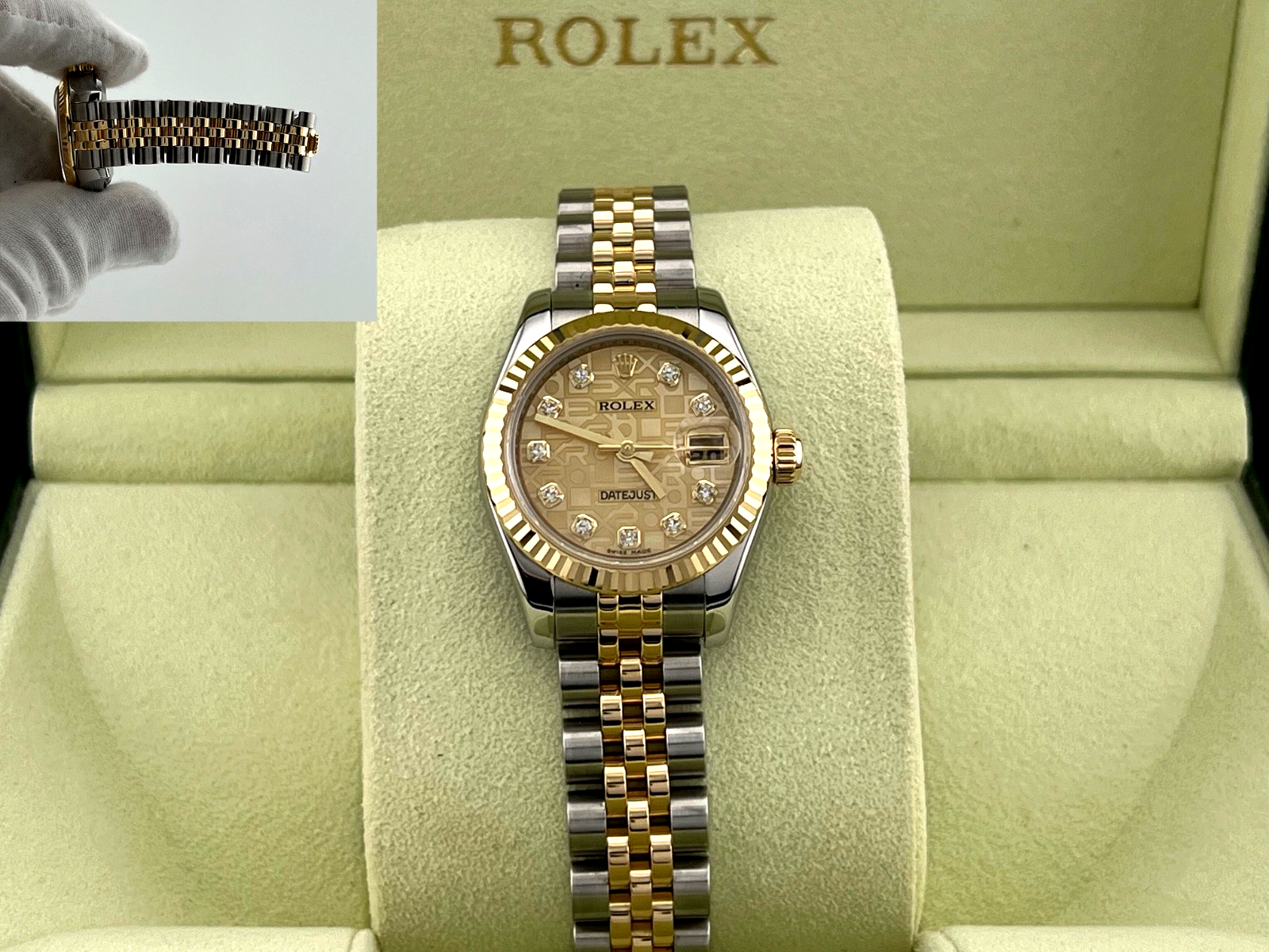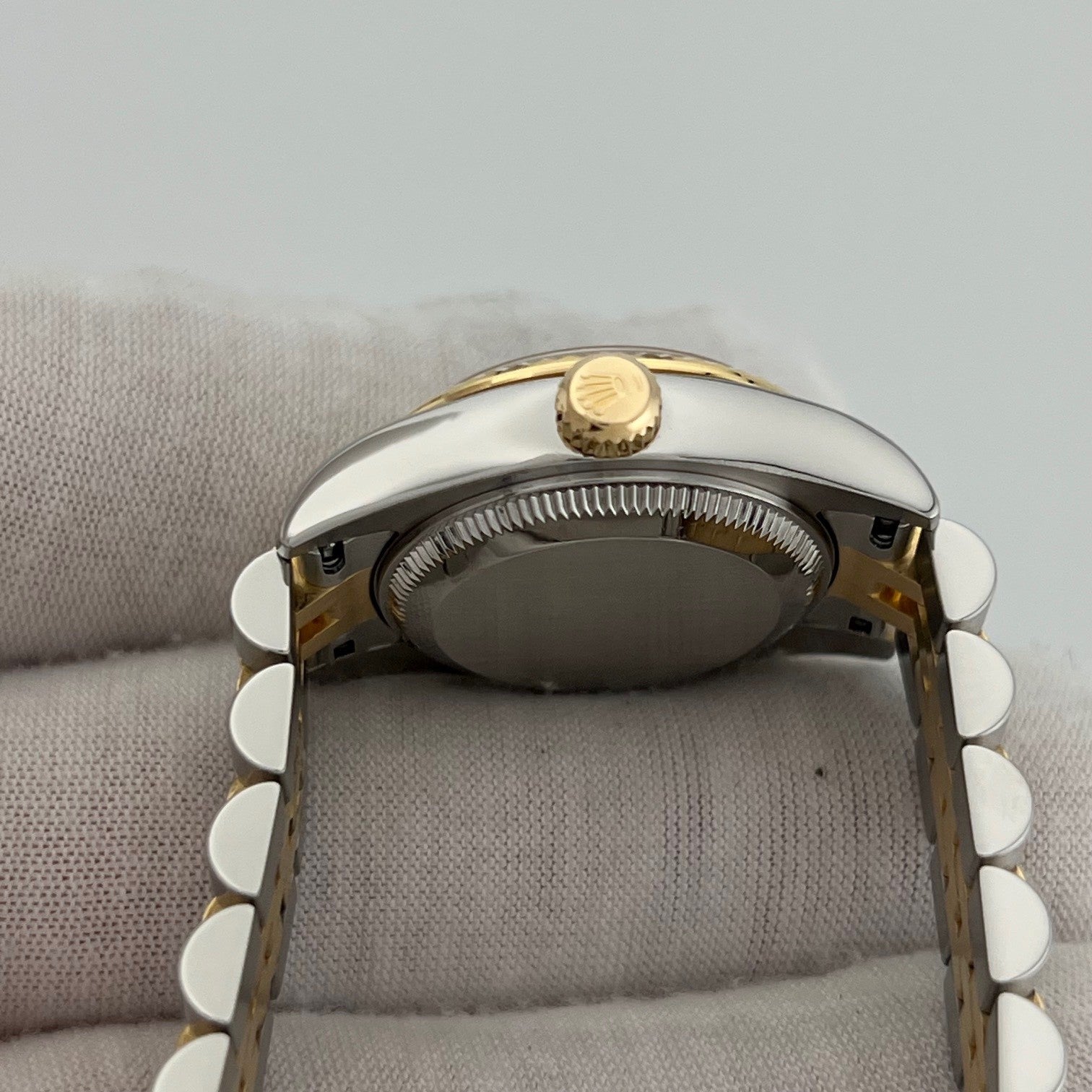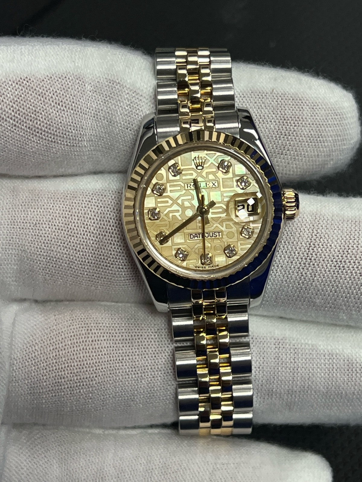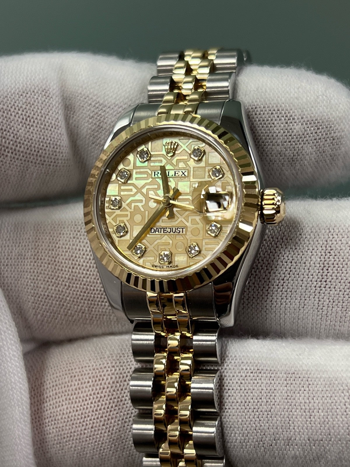 Rolex Lady Datejust 179173 26mm Mother of Pearl MOP Diamond Dial 18k Gold Steel Rolex Sale! from 1199500 /per This item is a recurring or deferred purchase. By continuing, I agree to the cancellation policy and authorize you to charge my payment method at the prices, frequency and dates listed on this page until my order is fulfilled or I cancel, if permitted. +1 (619) 232-1273 This item is currently on backorder but you can still purchase it now and we'll ship as soon as more become available. Style Number: 179173Serial: Z18****Year: 2006-2007 Model: Rolex Ladies Datejust Case Material: Stainless Steel Band: 18k Yellow Gold & Stainless Steel Jubilee Bezel: 18k Yellow Gold Fluted Dial: Rare Factory Champagne Mother Of Pearl Diamond Anniversary Dial Crystal: Sapphire Case Size: 26mm Includes: - Rolex Watch Box- Certified Appraisal - 1 Year WarrantySKU 22921 / 113710TOC081525